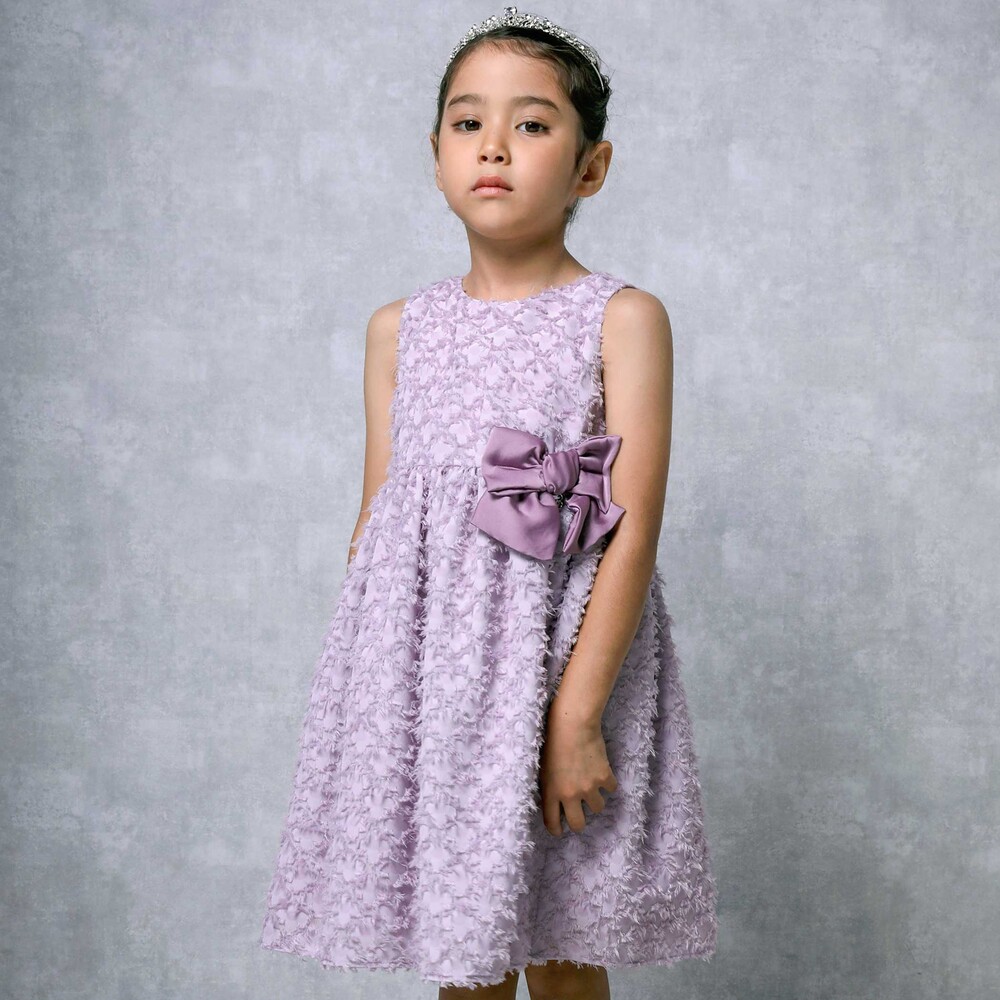 ウエスト切り替え部分には、チャーム付きの大きなリボンをあしらい、存在感のあるデザインに。