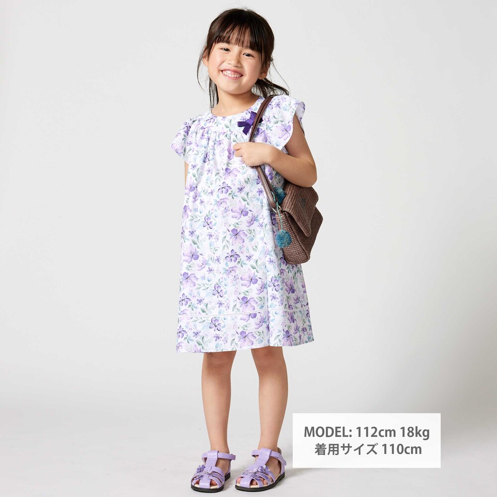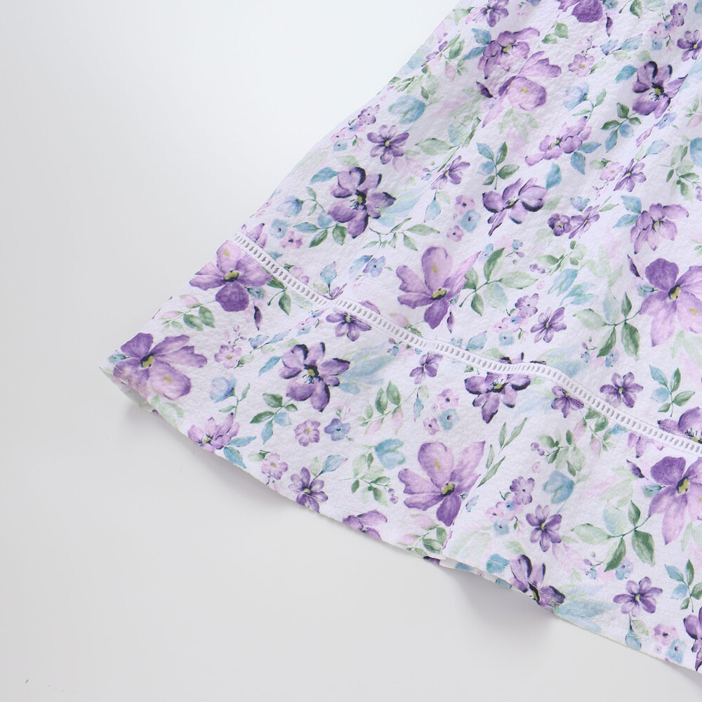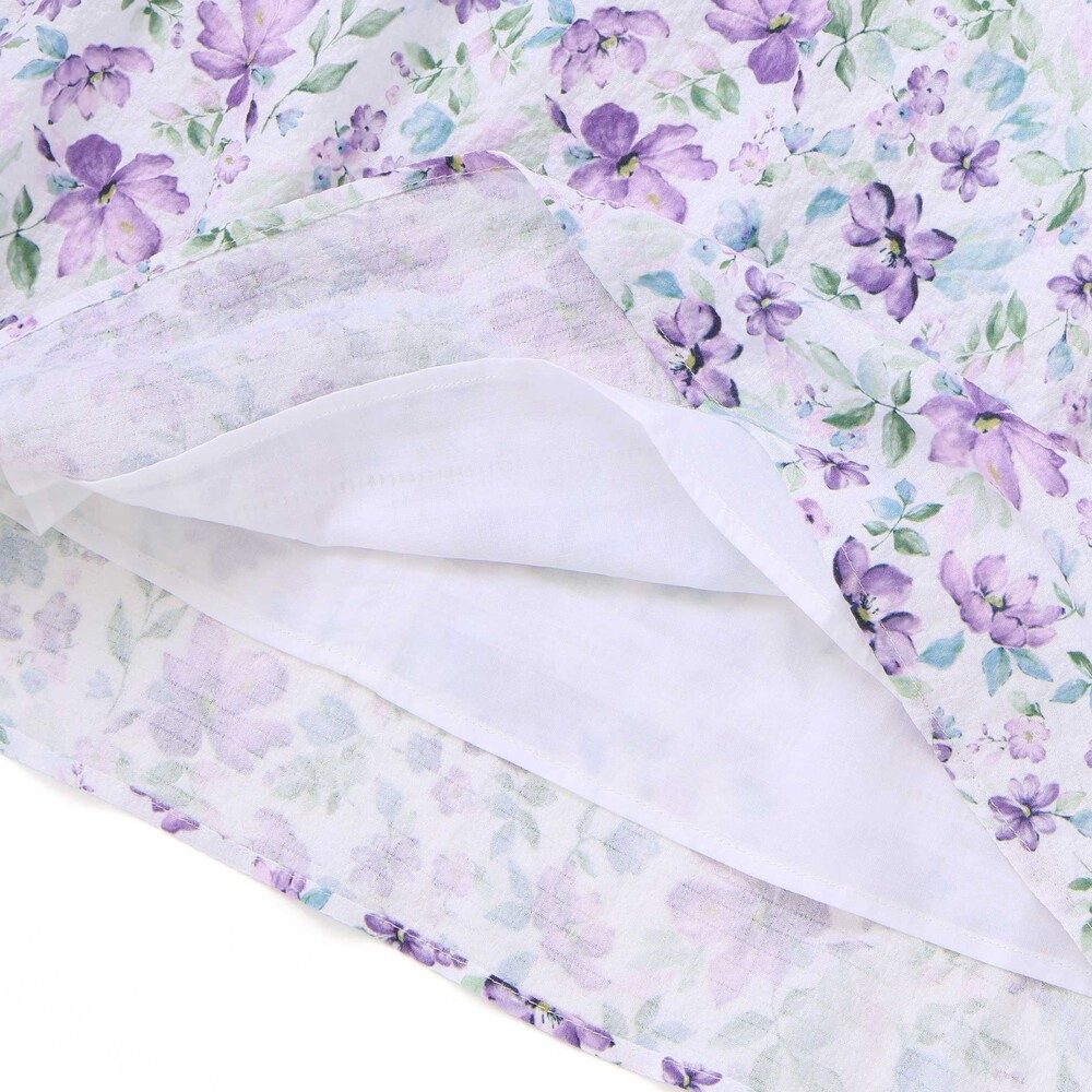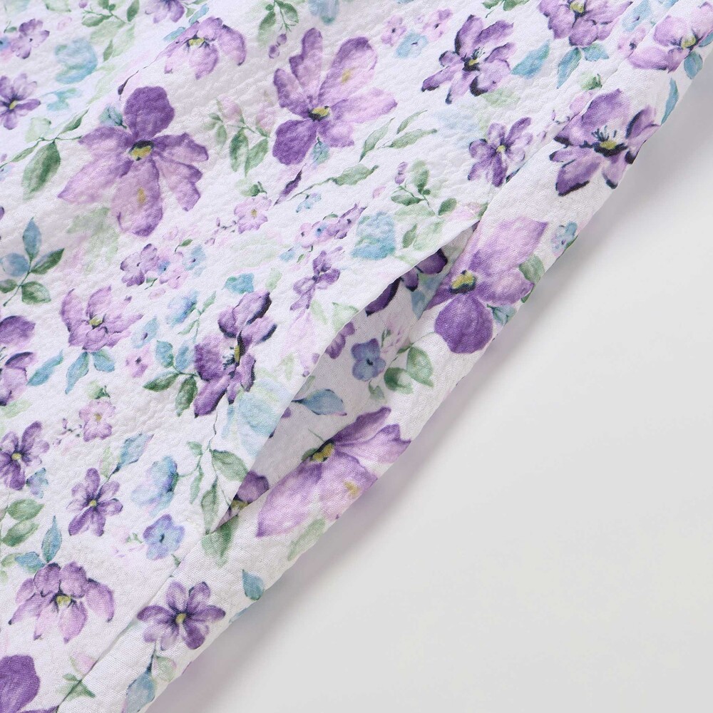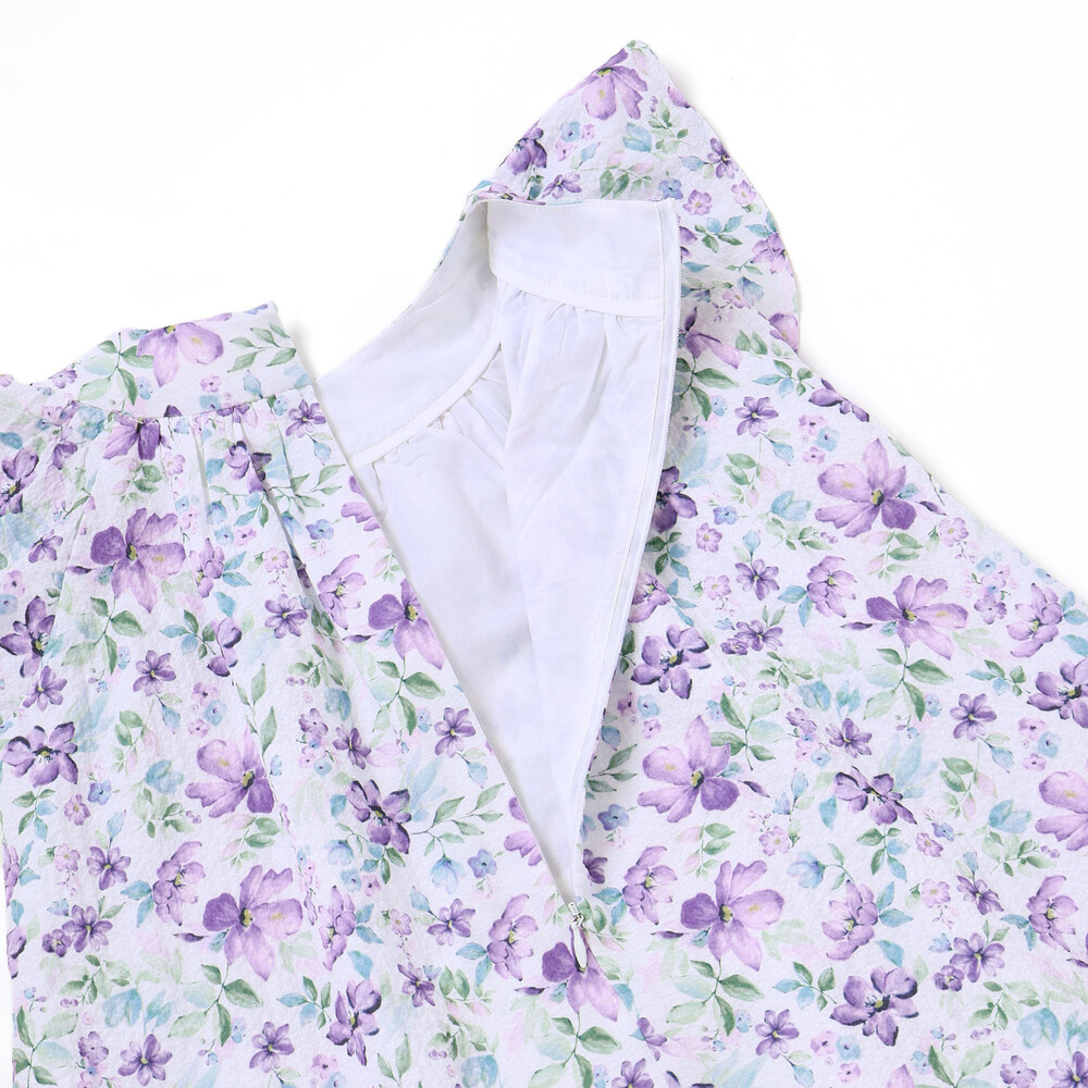 軽いシアー感のあるサッカー生地に水彩タッチの花柄プリントをのせたオリジナルファブリックのワンピース。