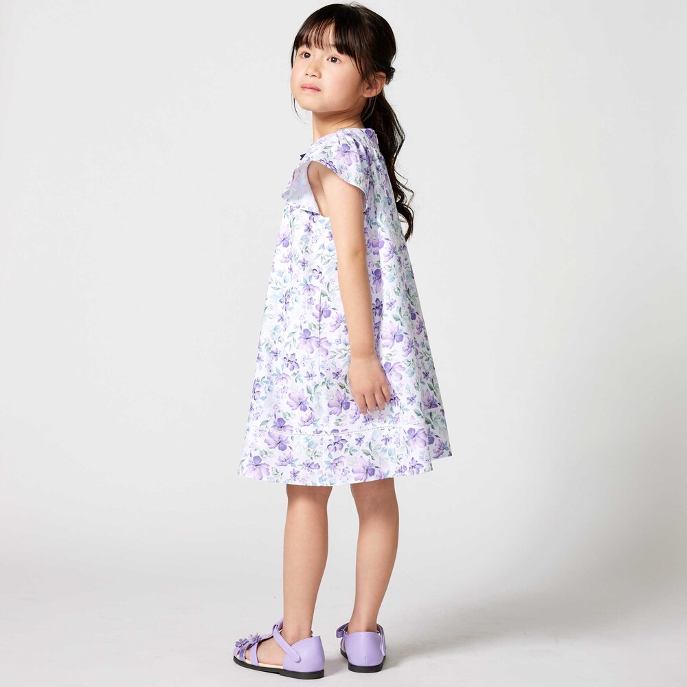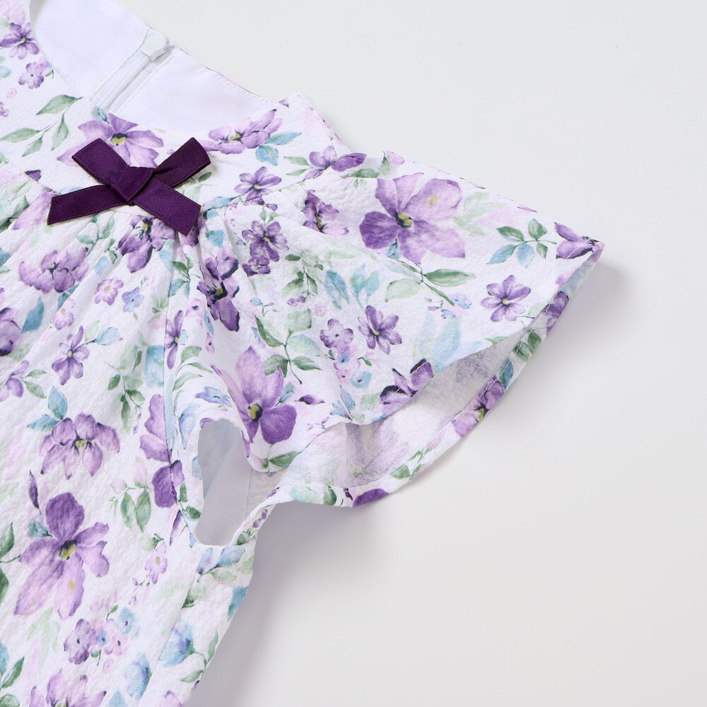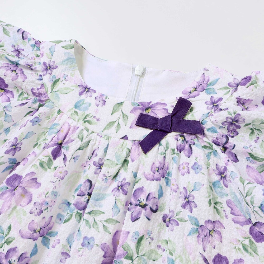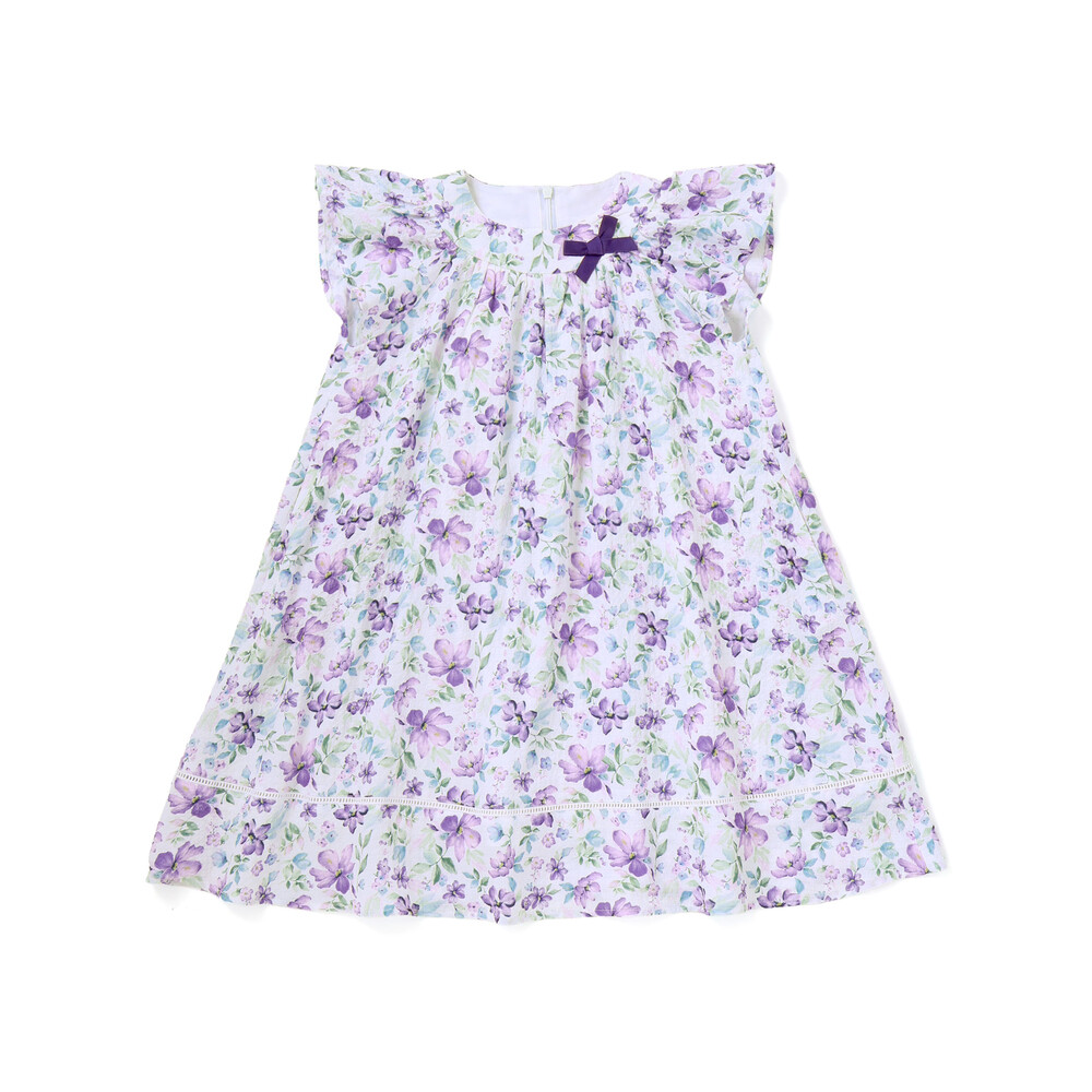 軽いシアー感のあるサッカー生地に水彩タッチの花柄プリントをのせたオリジナルファブリックのワンピース。