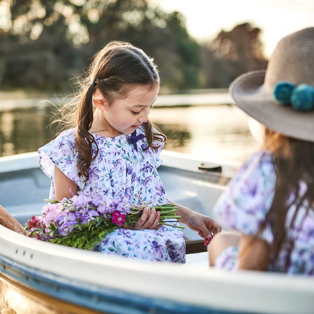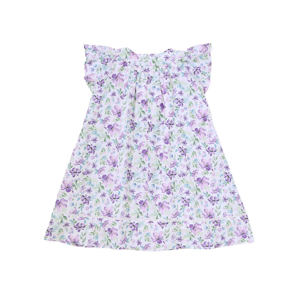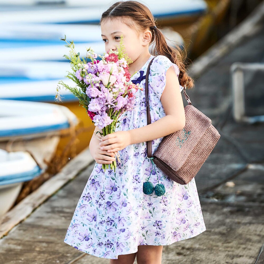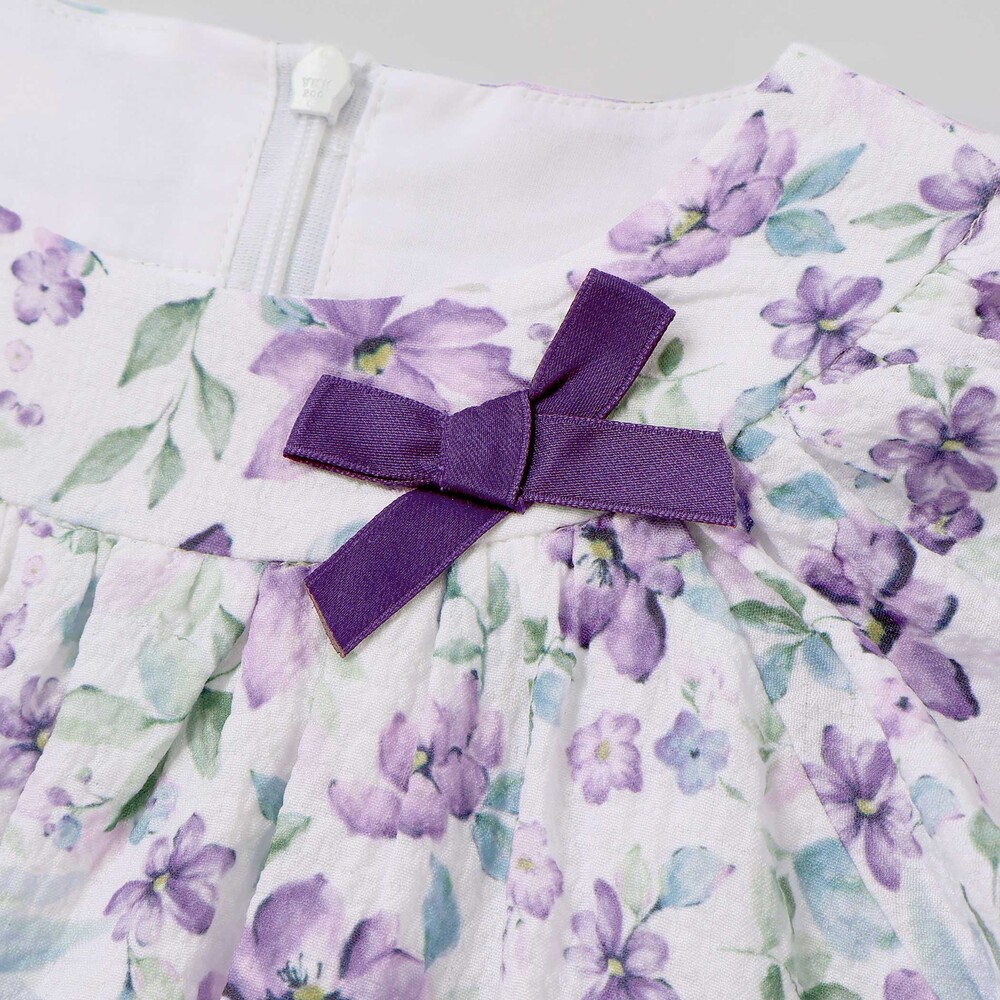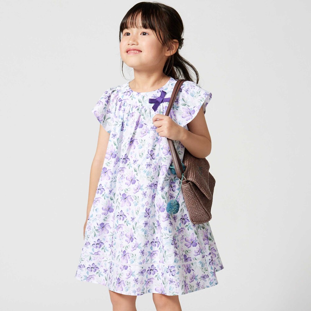 軽いシアー感のあるサッカー生地に水彩タッチの花柄プリントをのせたオリジナルファブリックのワンピース。