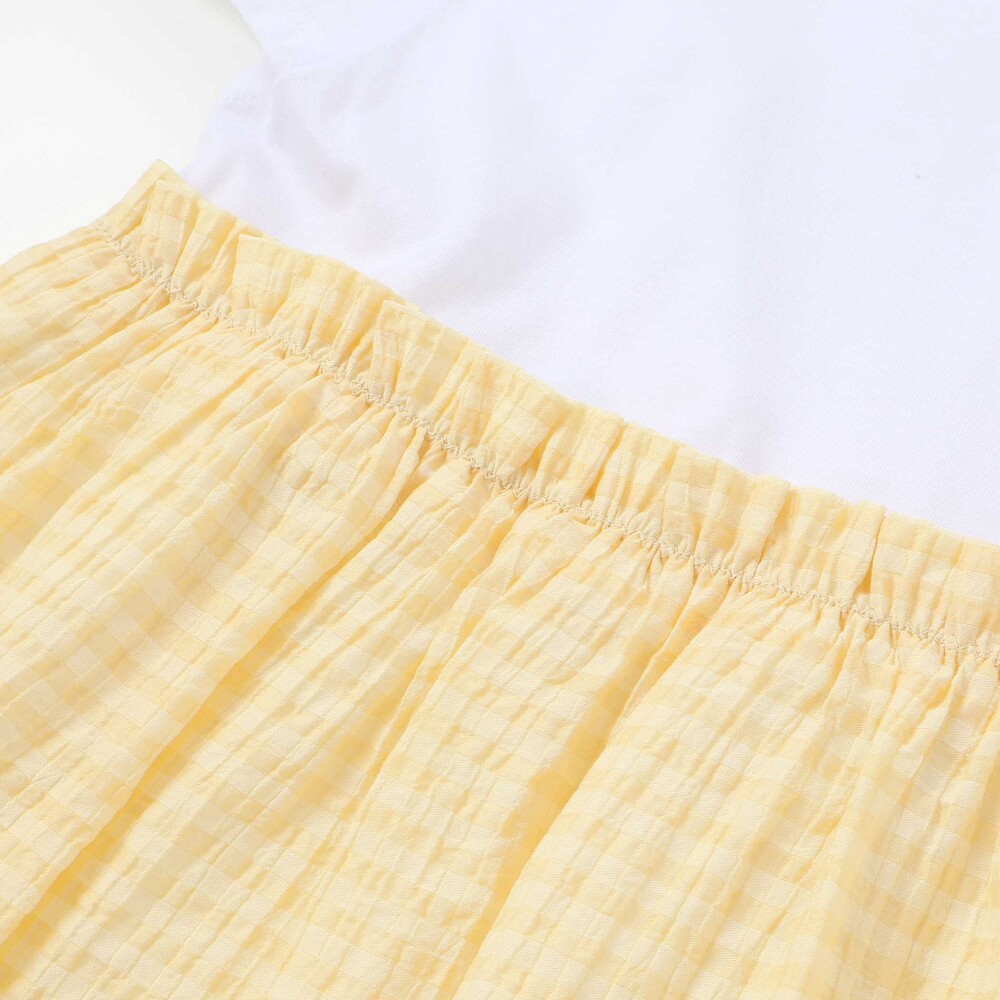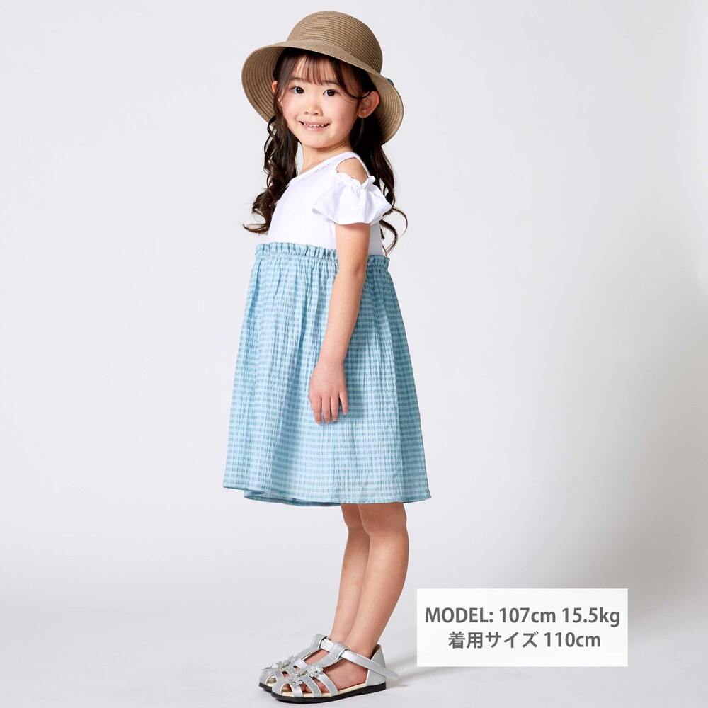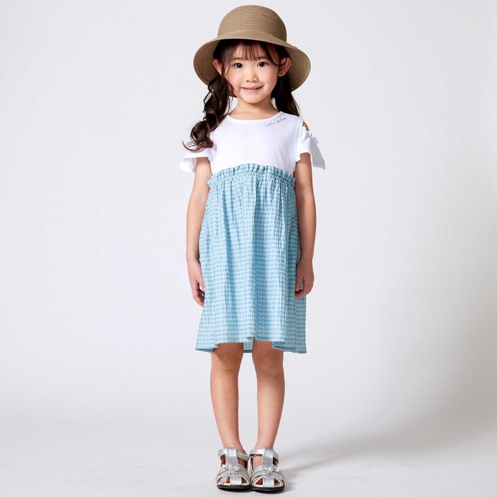 トップスは天竺生地のTシャツ、スカート部分は透け感がおしゃれなチェックの生地を使用。
