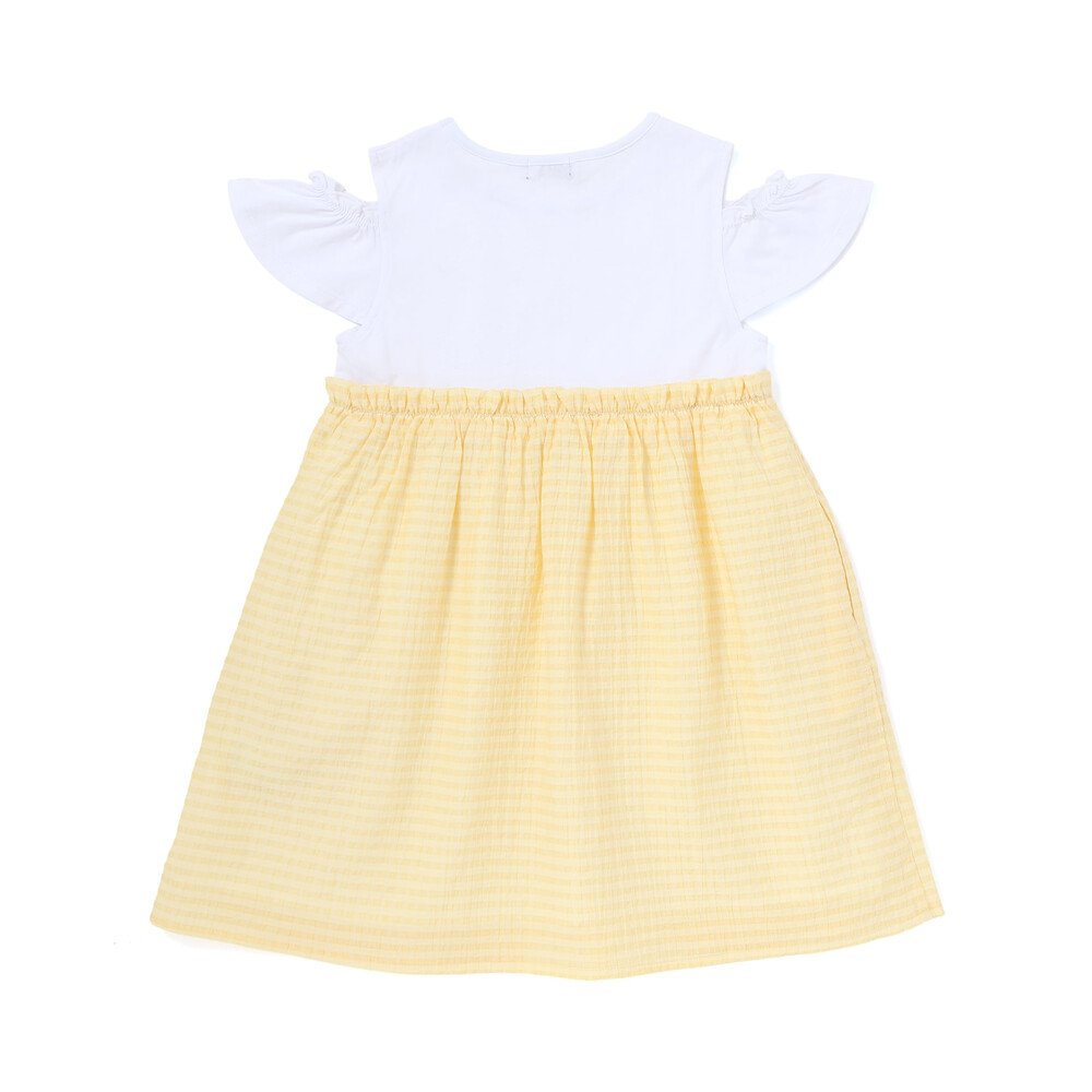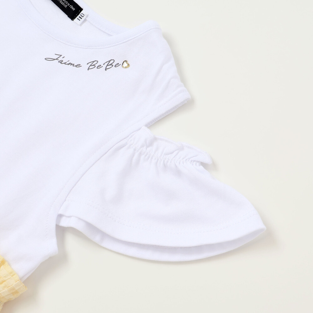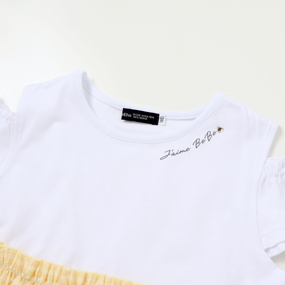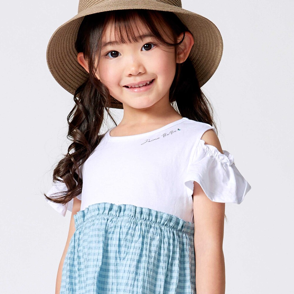トップスは天竺生地のTシャツ、スカート部分は透け感がおしゃれなチェックの生地を使用。