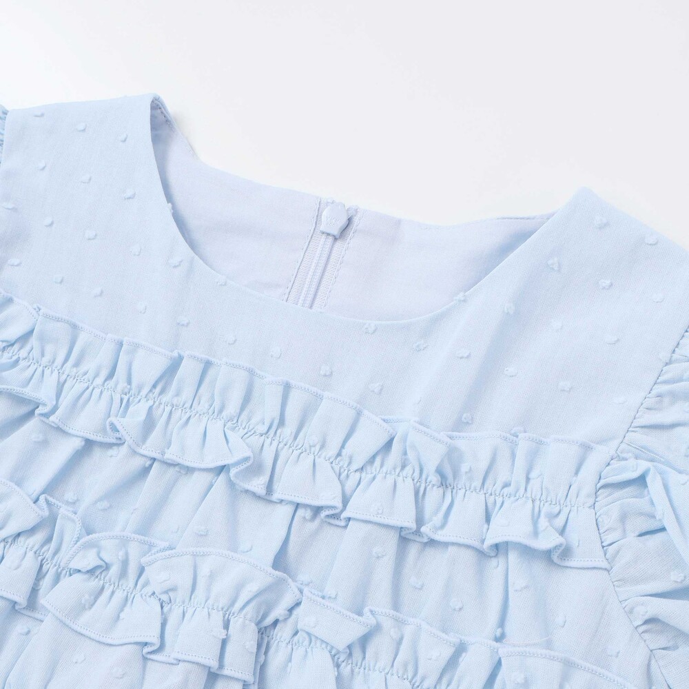 胸元にたっぷりのフリルをあしらい顔周りに華やかさをもたせたデザイン。