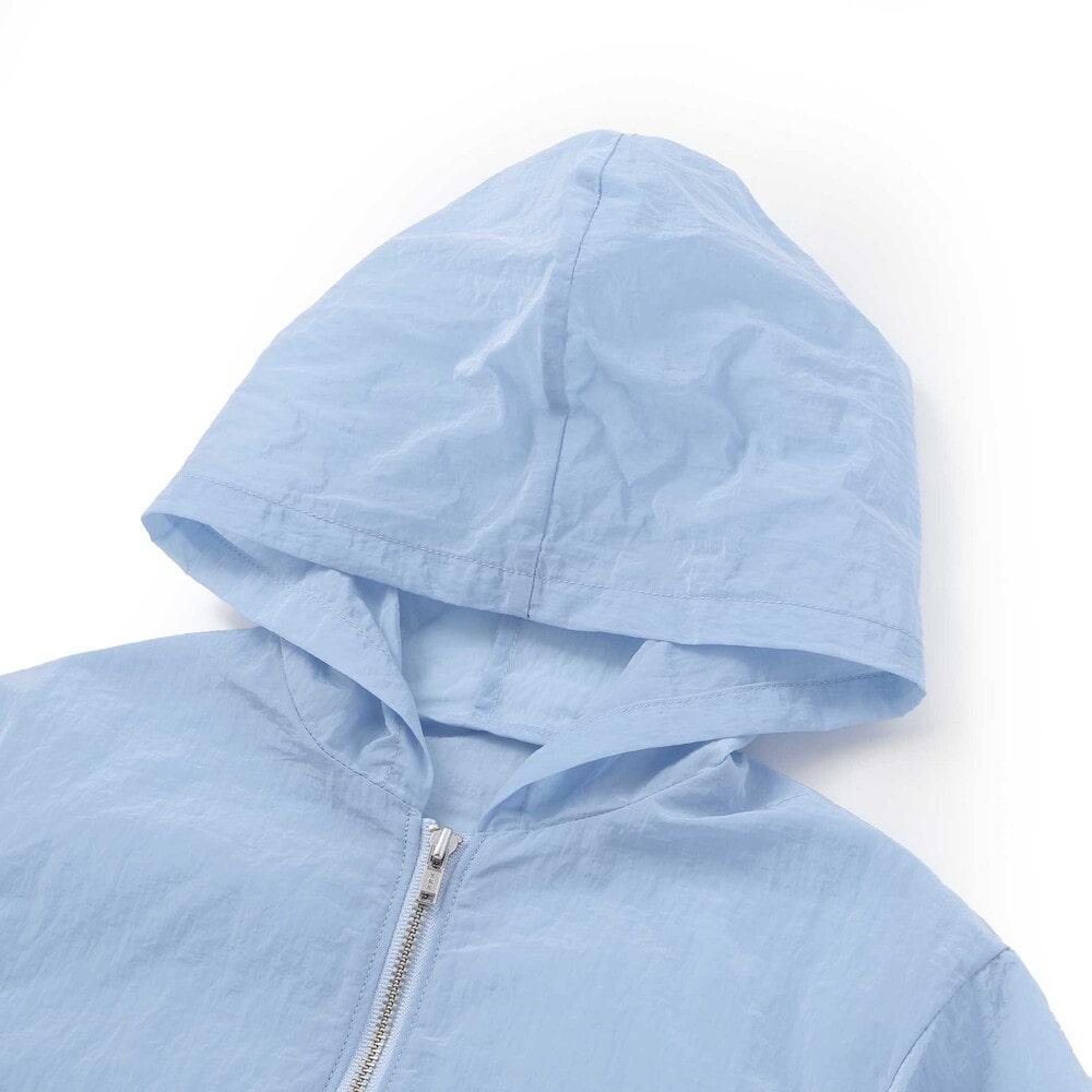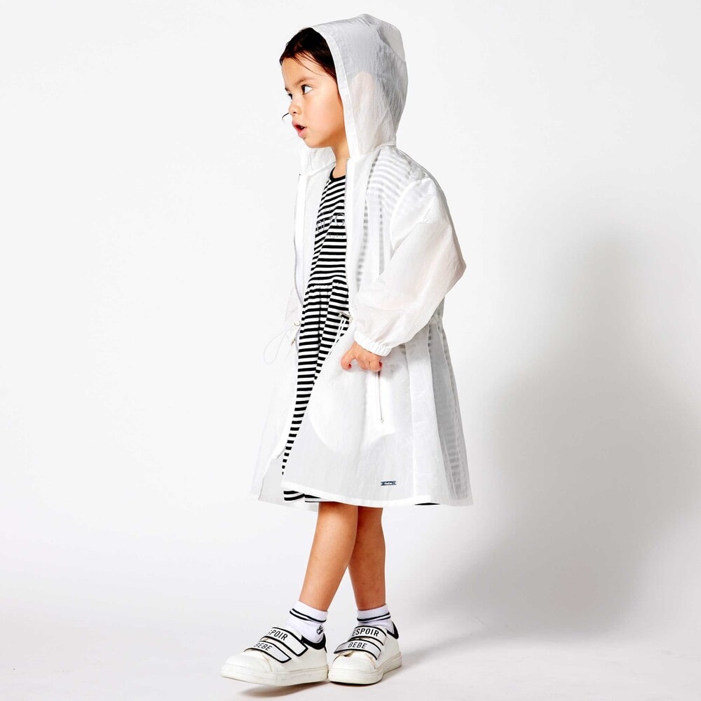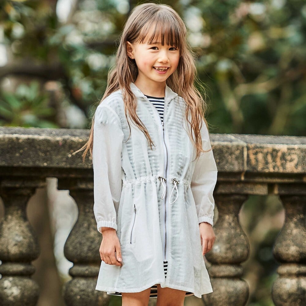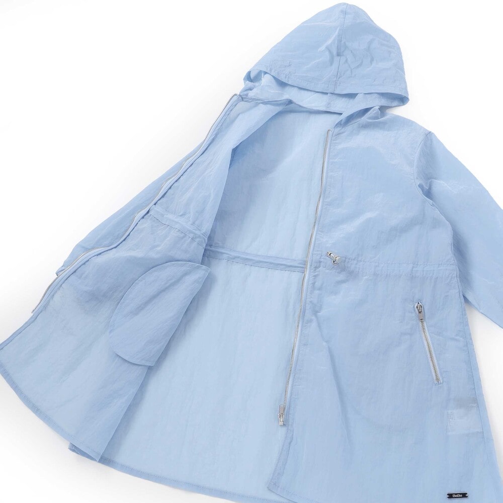 アウターは軽さのあるタフタのフード付きスプリングコート。