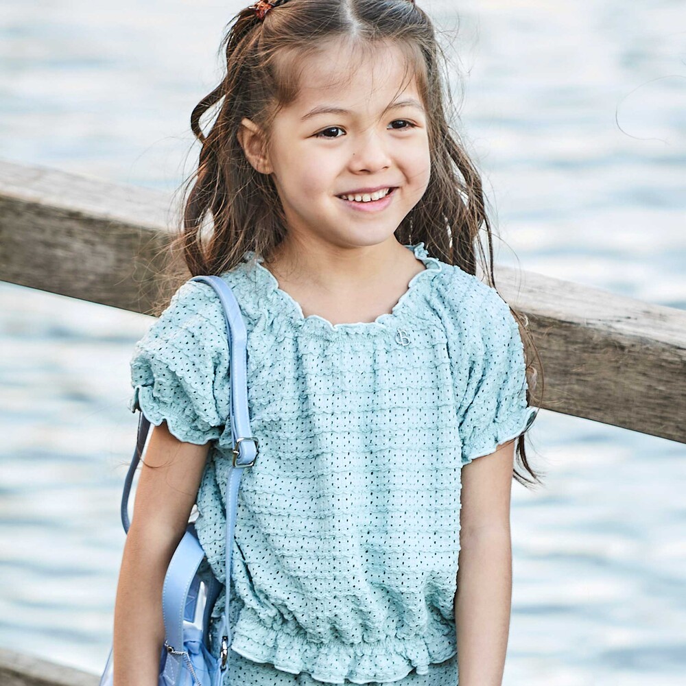 トップスは袖や裾、首ぐりにメロウフリルを施した丸みのあるギャザープルオーバー。