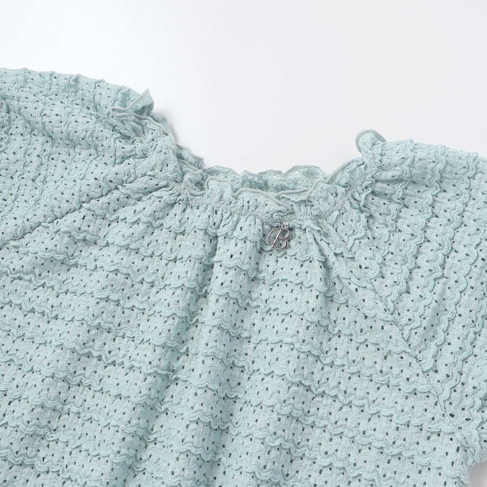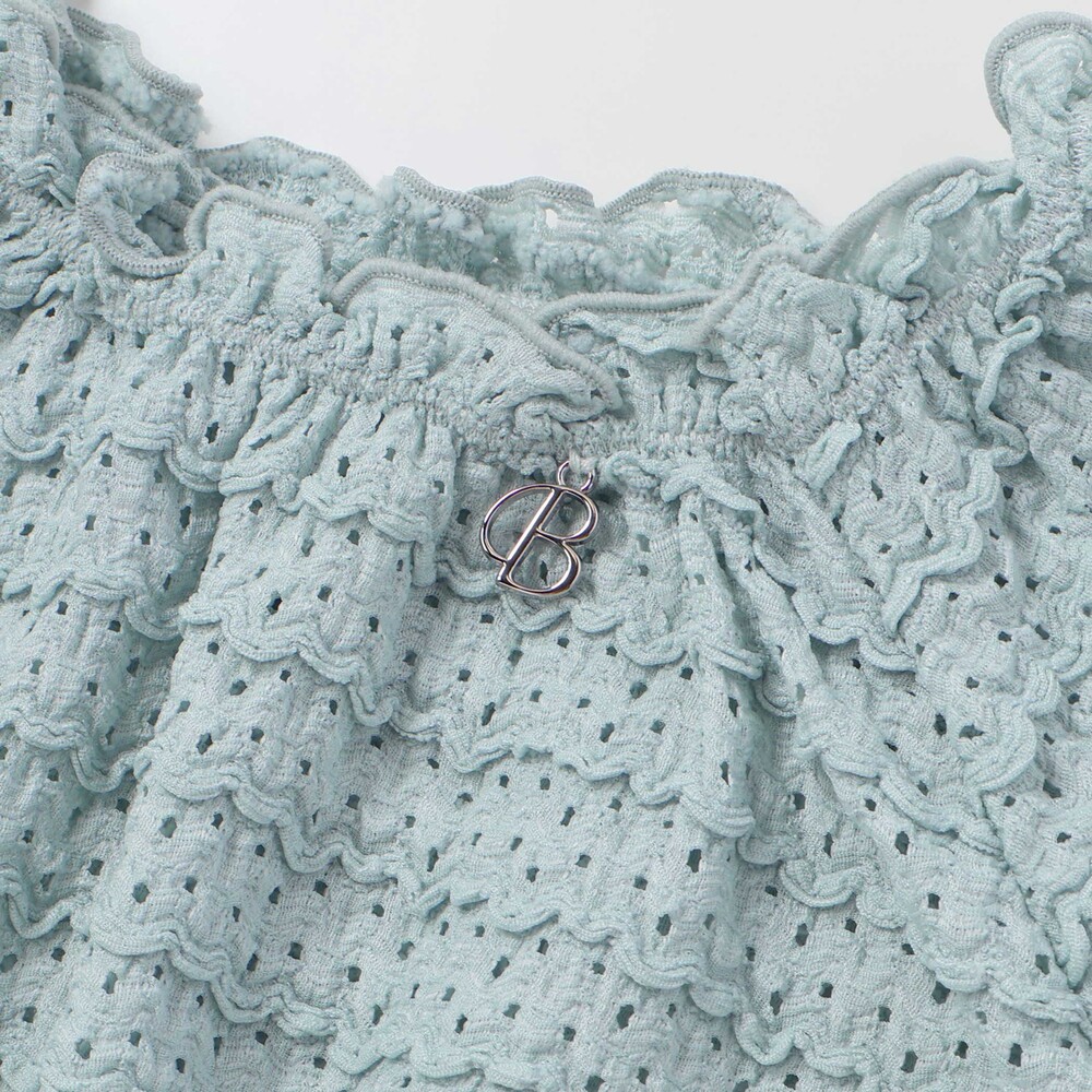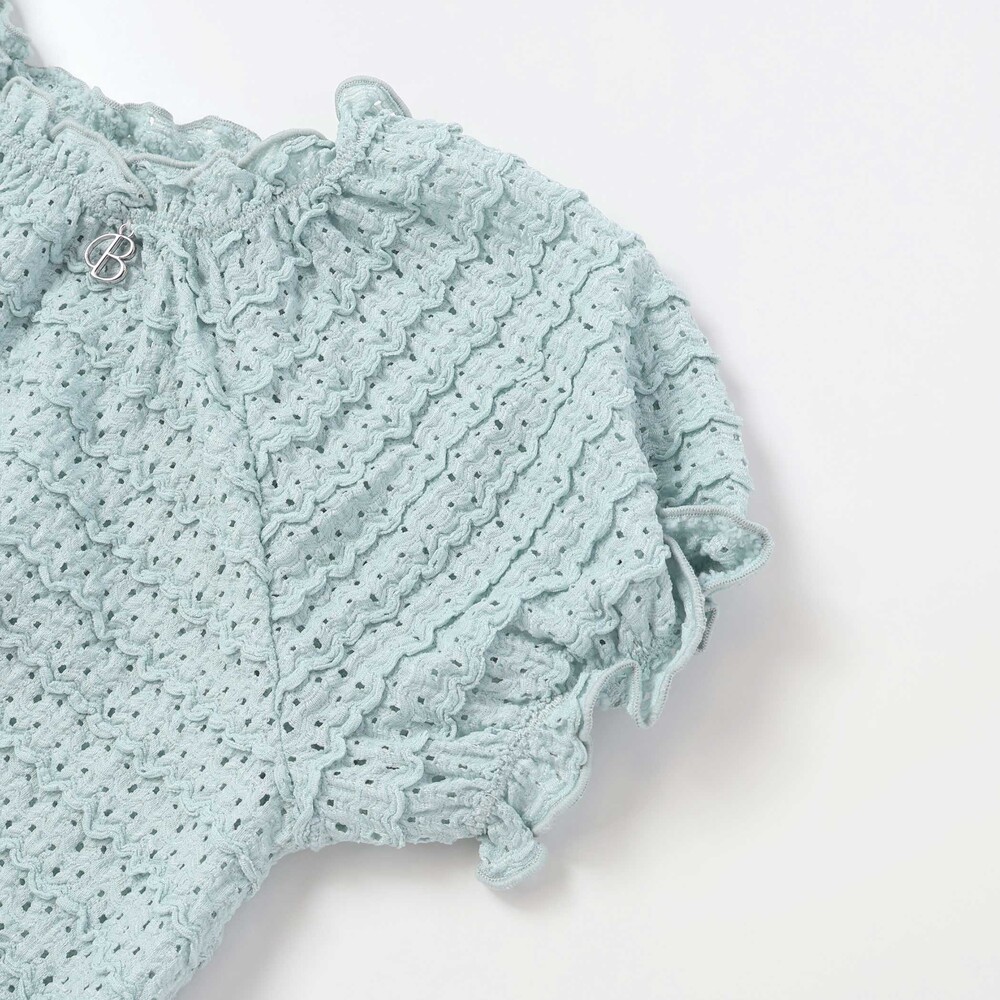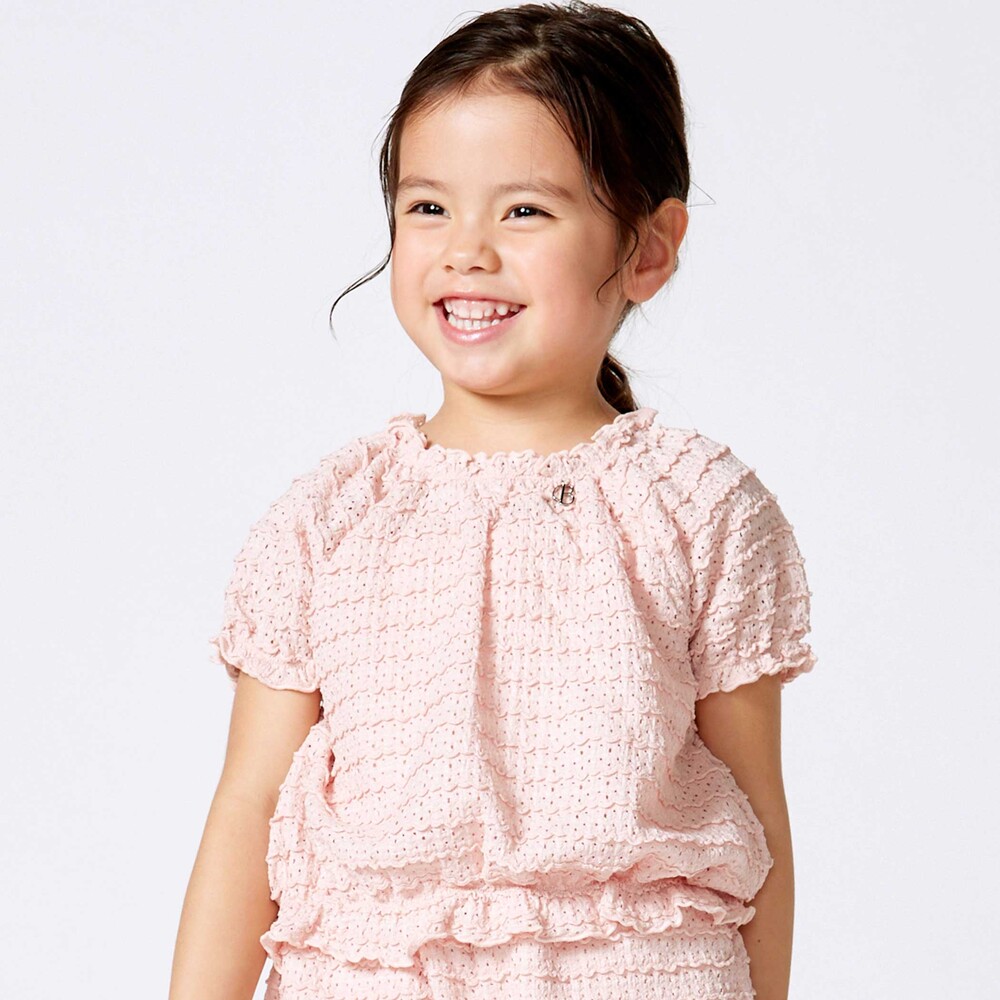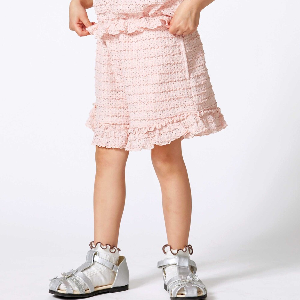 ボーダー風のポコポコとしたフリルが可愛らしいレース生地のセットアップ。