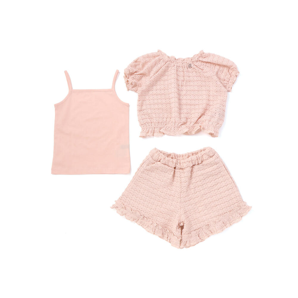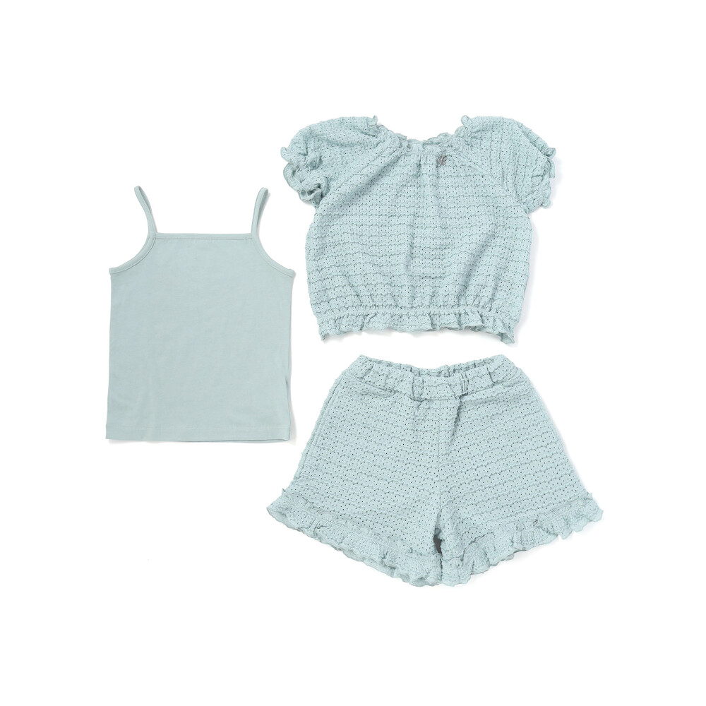 | 素材 | 【トップス】ポリエステル98% ポリウレタン2% 【ボトムス】(表)ポリエステル98% ポリウレタン2% (裏)綿100% 【キャミソール】綿100% |
