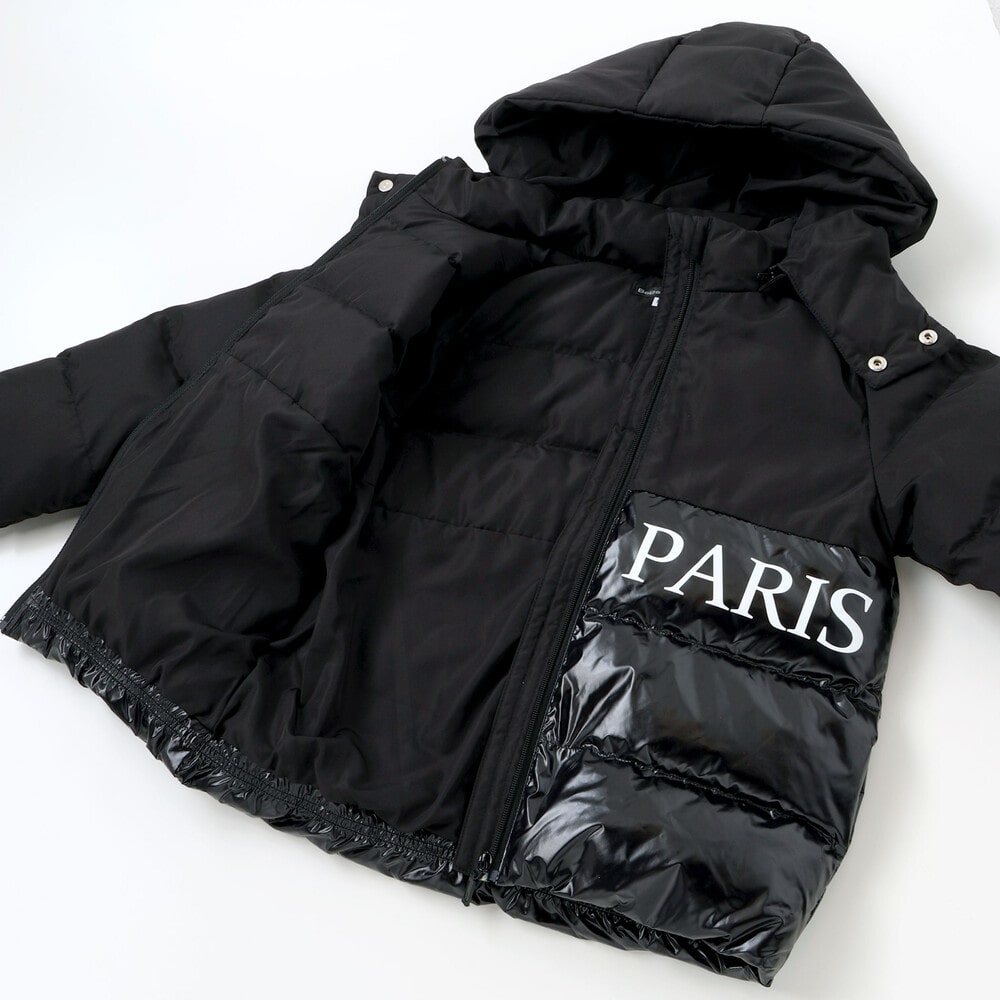 マット×光沢のタフタを切り替えたフード付き中綿コート。