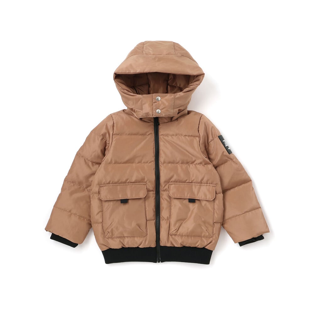 落ち着いたカラーと大きなプラップ付きのポケットがメンズライクなダウンコート。