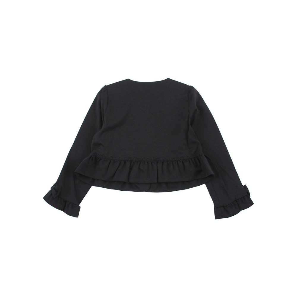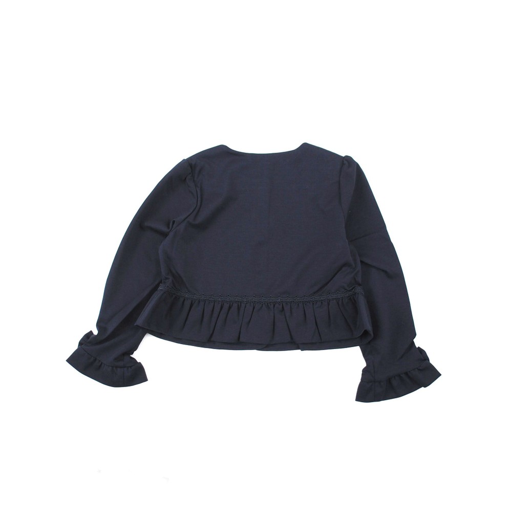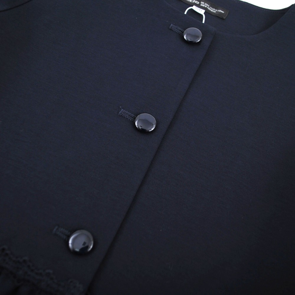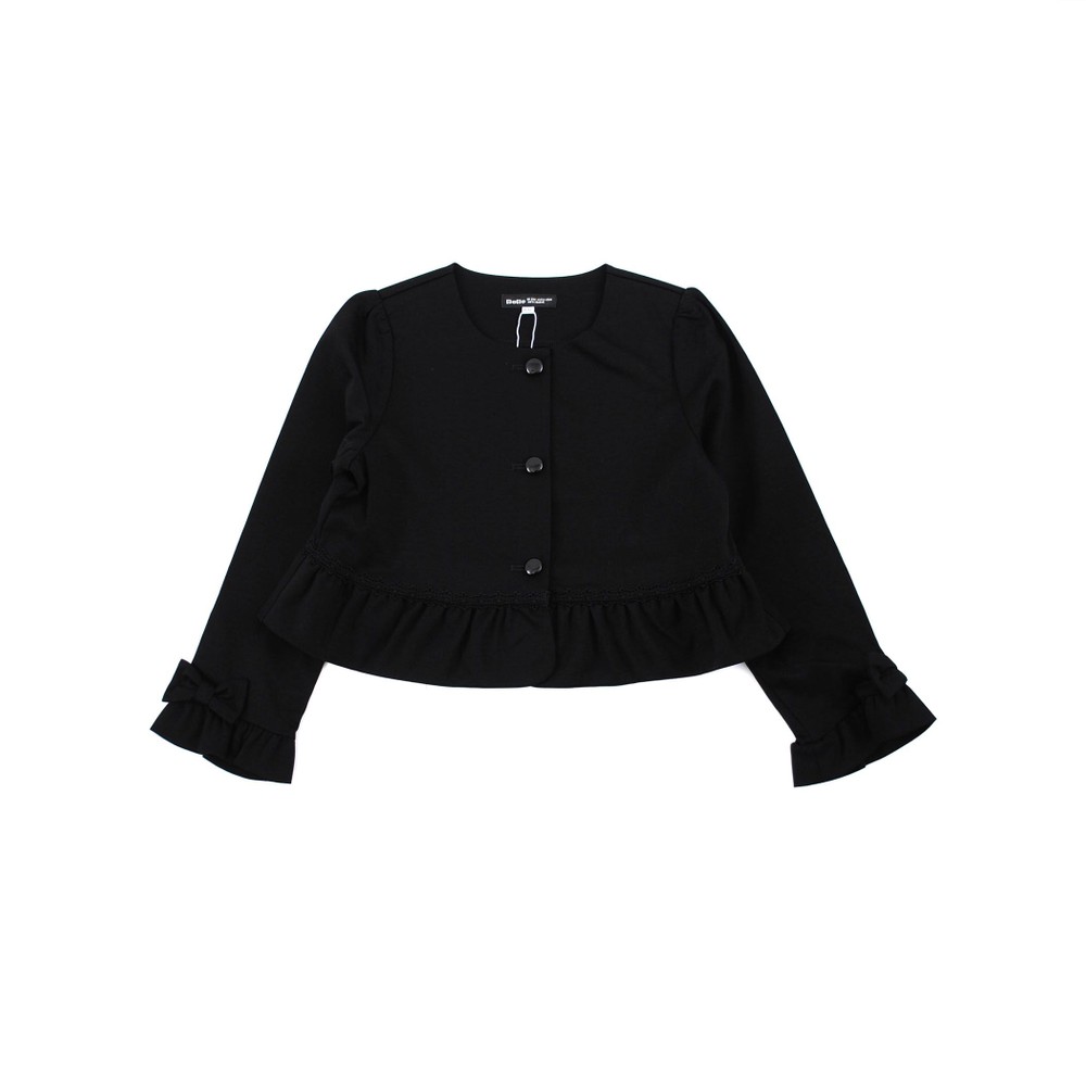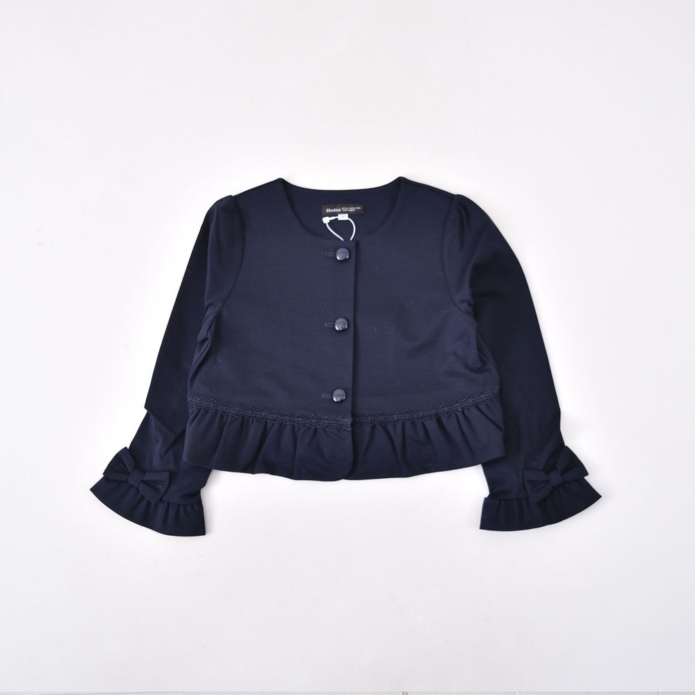 ノーカラーのデザインやフリル使いが、やわらかい雰囲気で着用して頂けるジャケット。