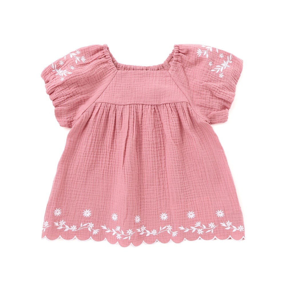 手刺し風の太めの糸の刺しゅうと柔らかいガーゼ素材がナチュラルな雰囲気なブラウス。