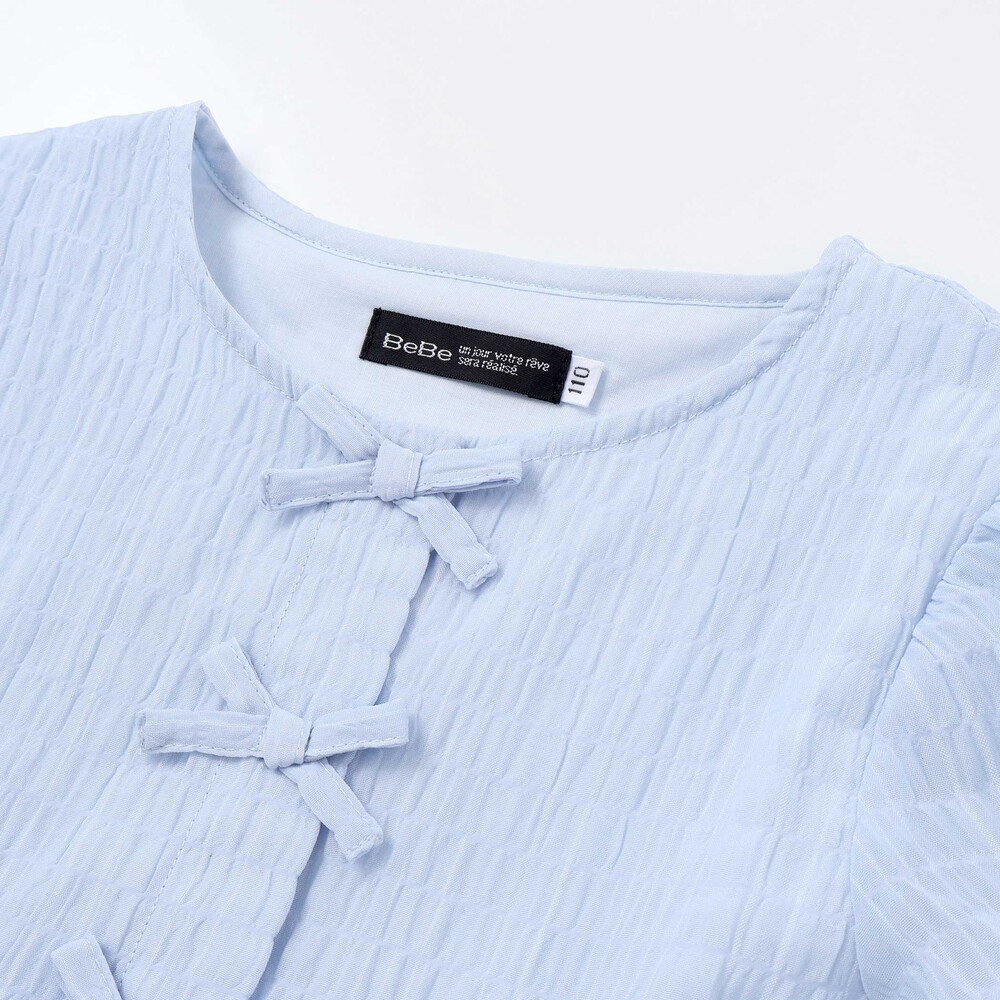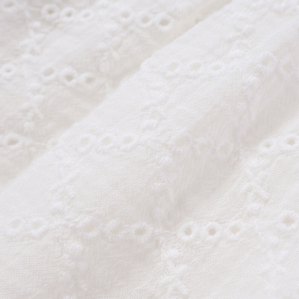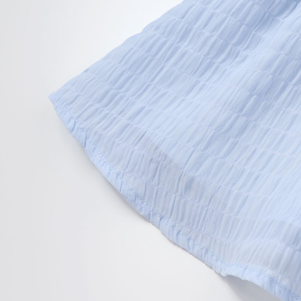 ホワイトはシアー感がかわいいレース生地、ブルーは表面感あるシャーリング生地を使用しています。