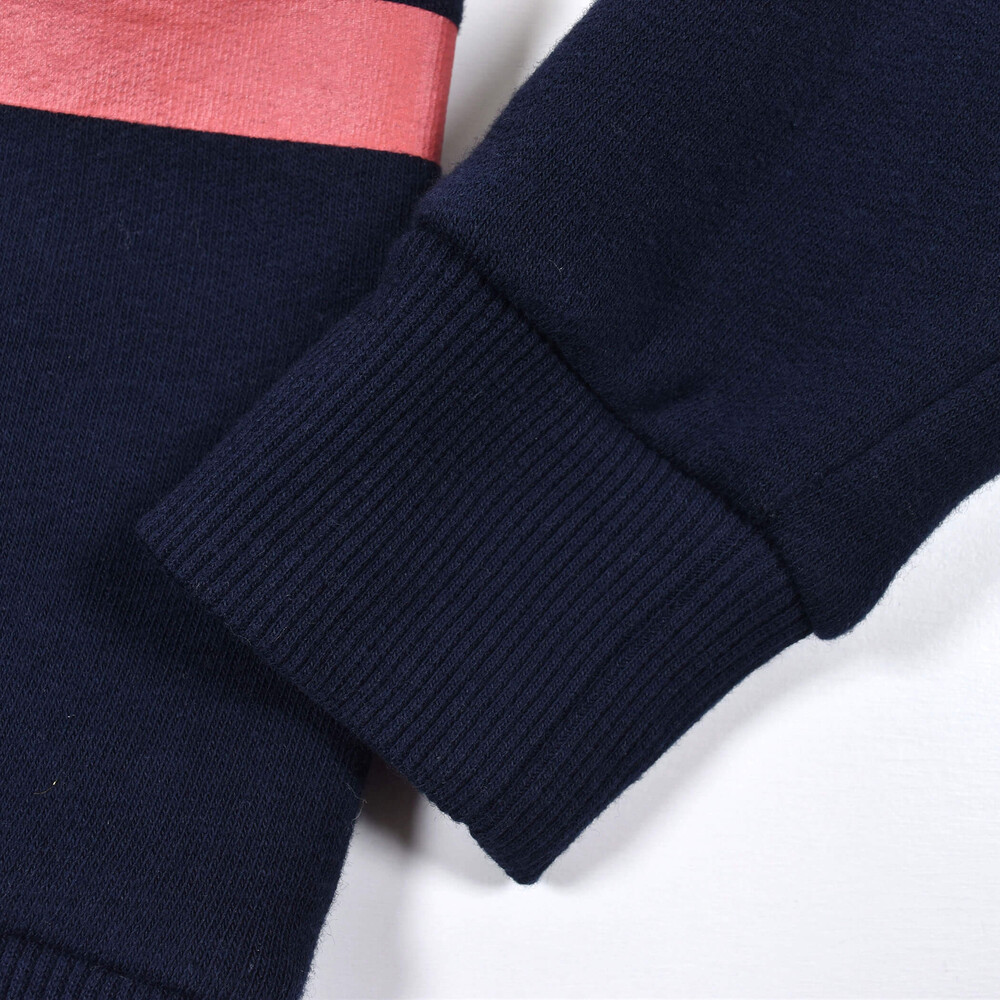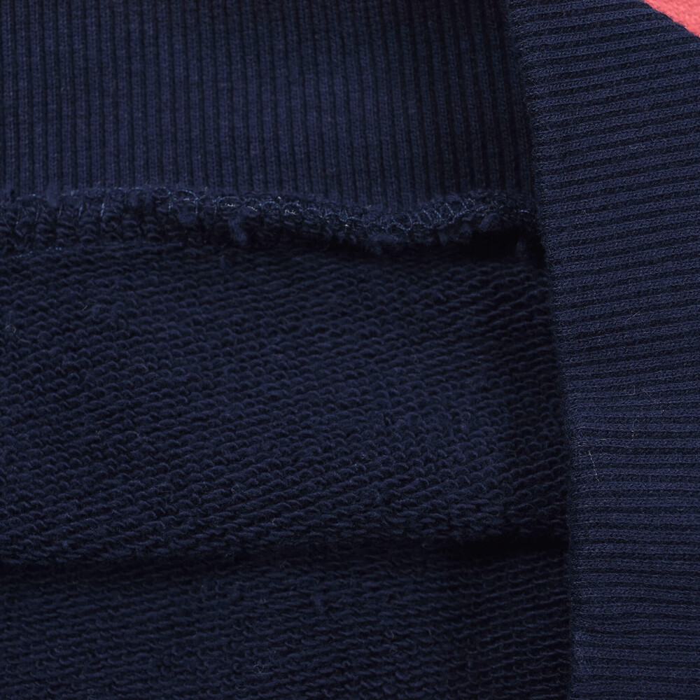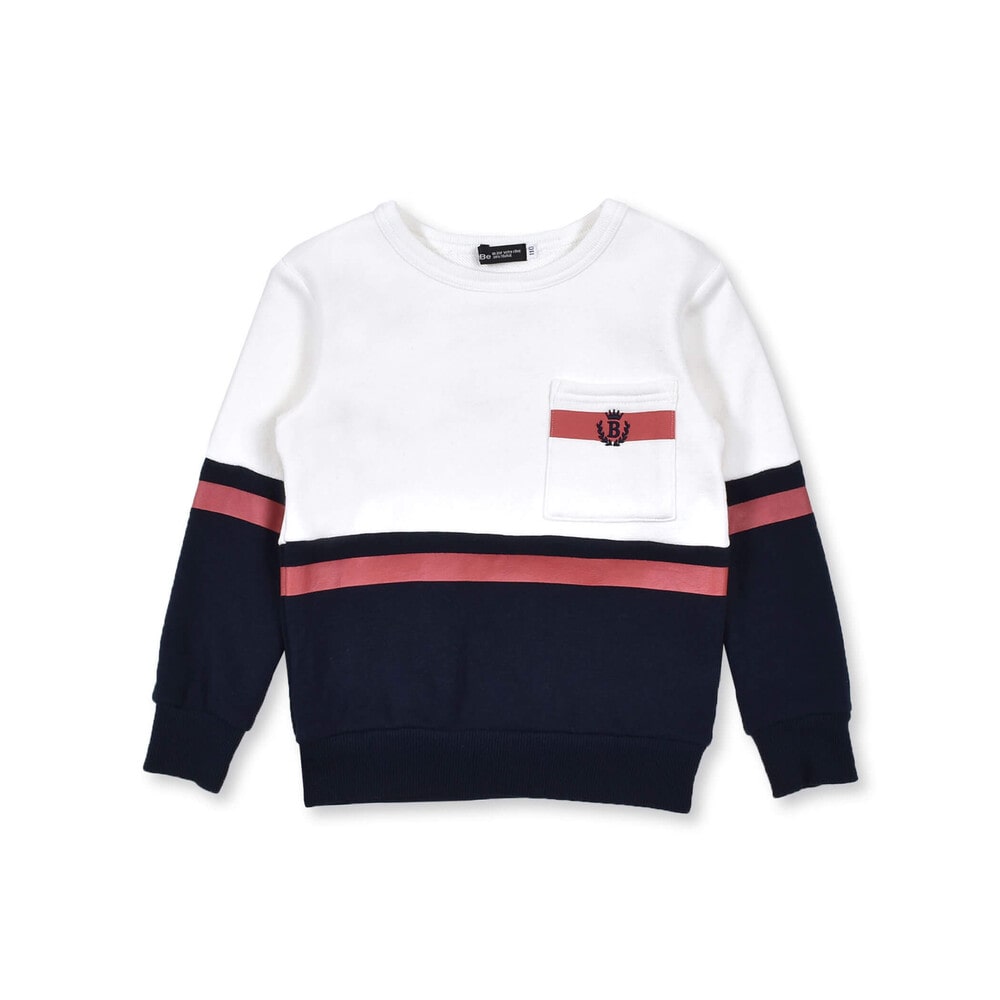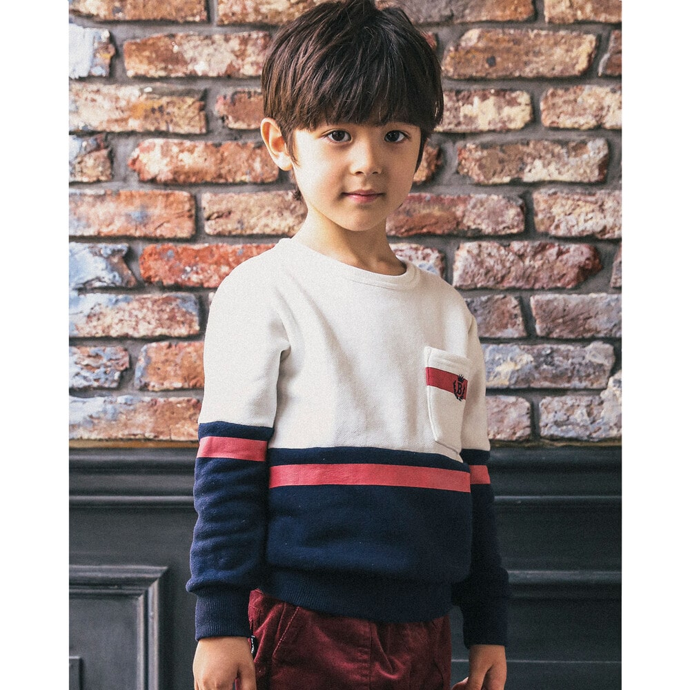 身頃や袖、ポケットにラインプリントの入ったバイカラーデザインのトレーナー。