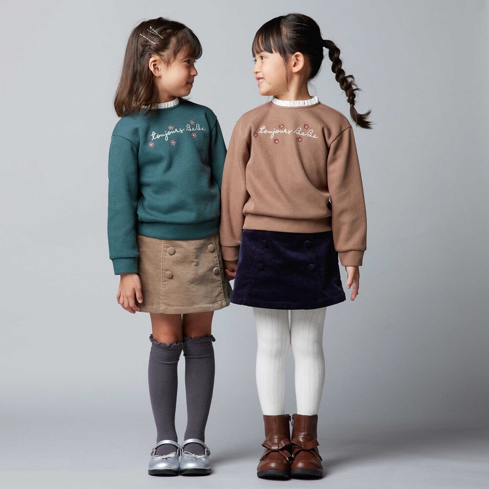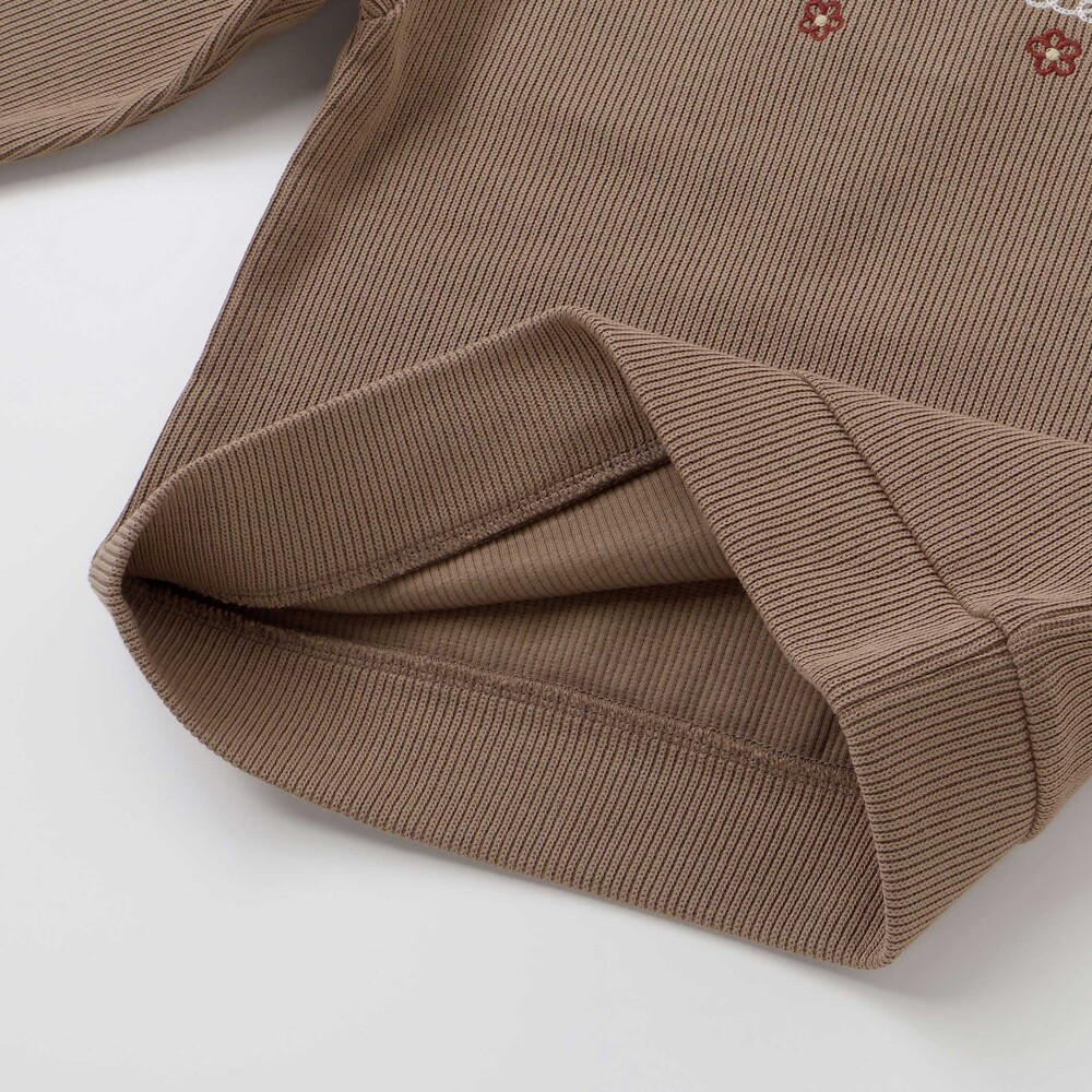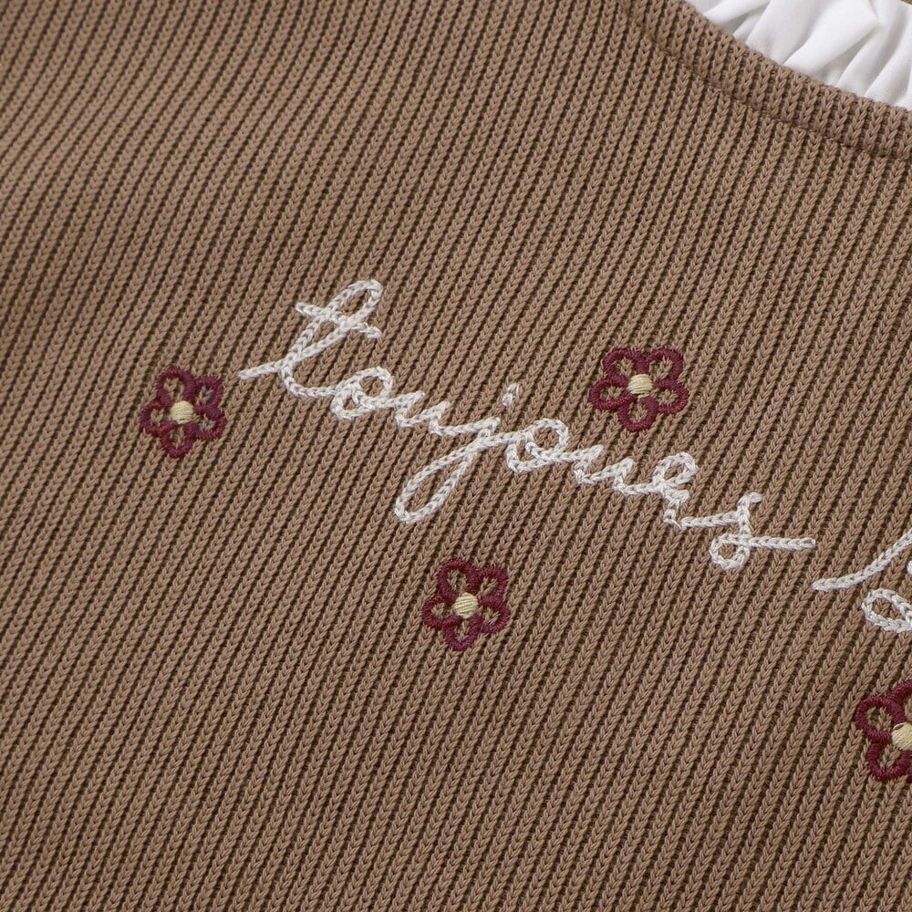 手書き風のロゴと小花の刺しゅうは温もりのあるカラーリングで柔らかい雰囲気に。