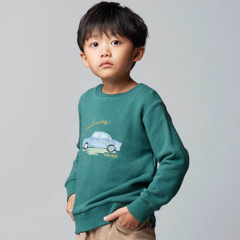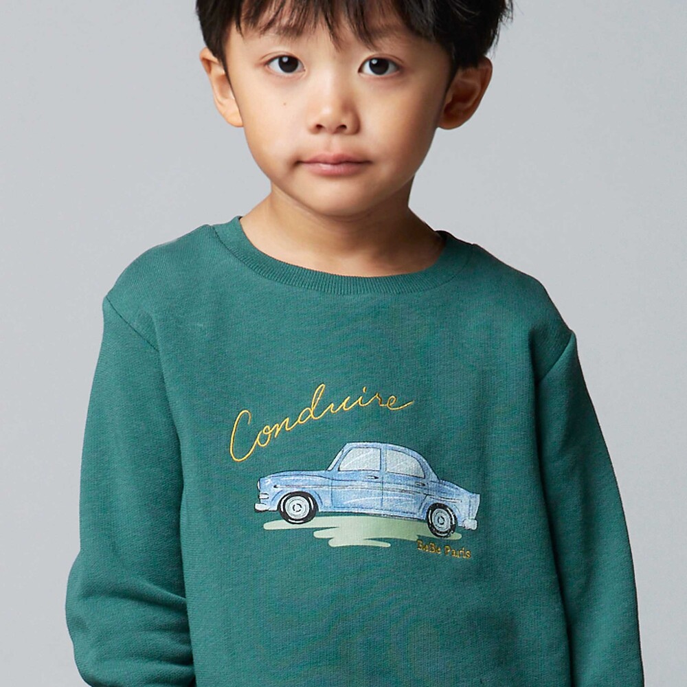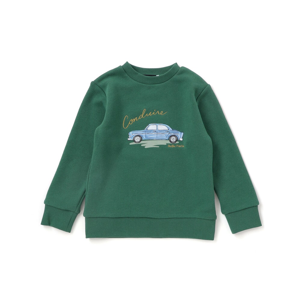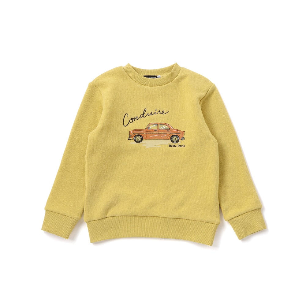 水彩タッチのクラシックカーとロゴ刺しゅうが遊び心のあるトレーナー。
