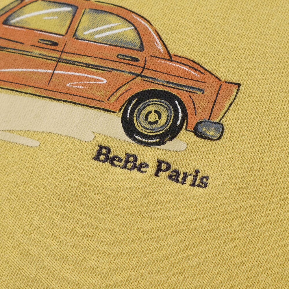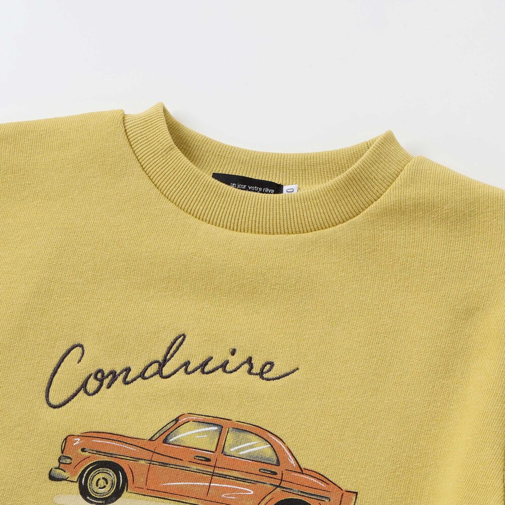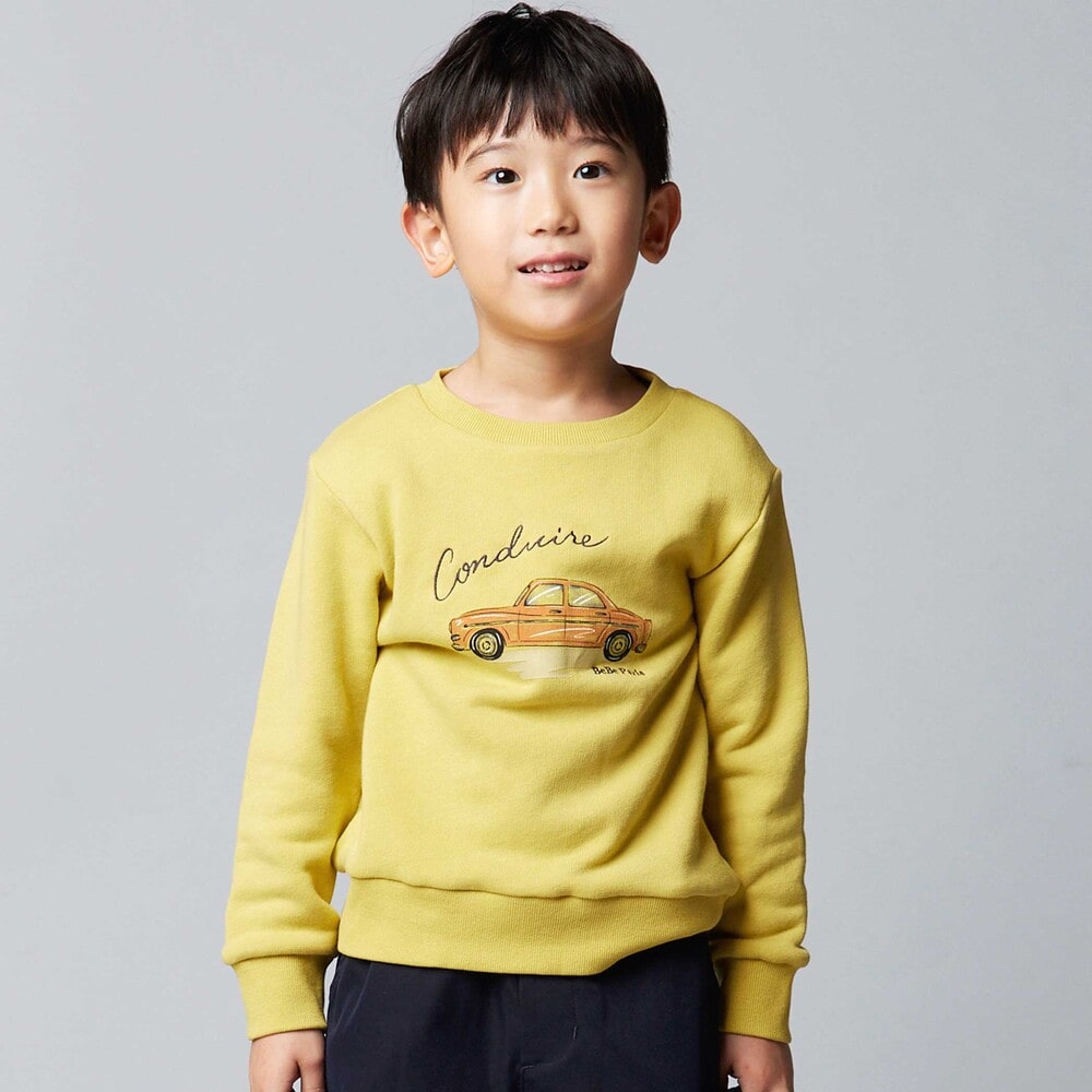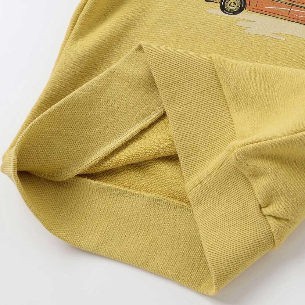 水彩タッチのクラシックカーとロゴ刺しゅうが遊び心のあるトレーナー。