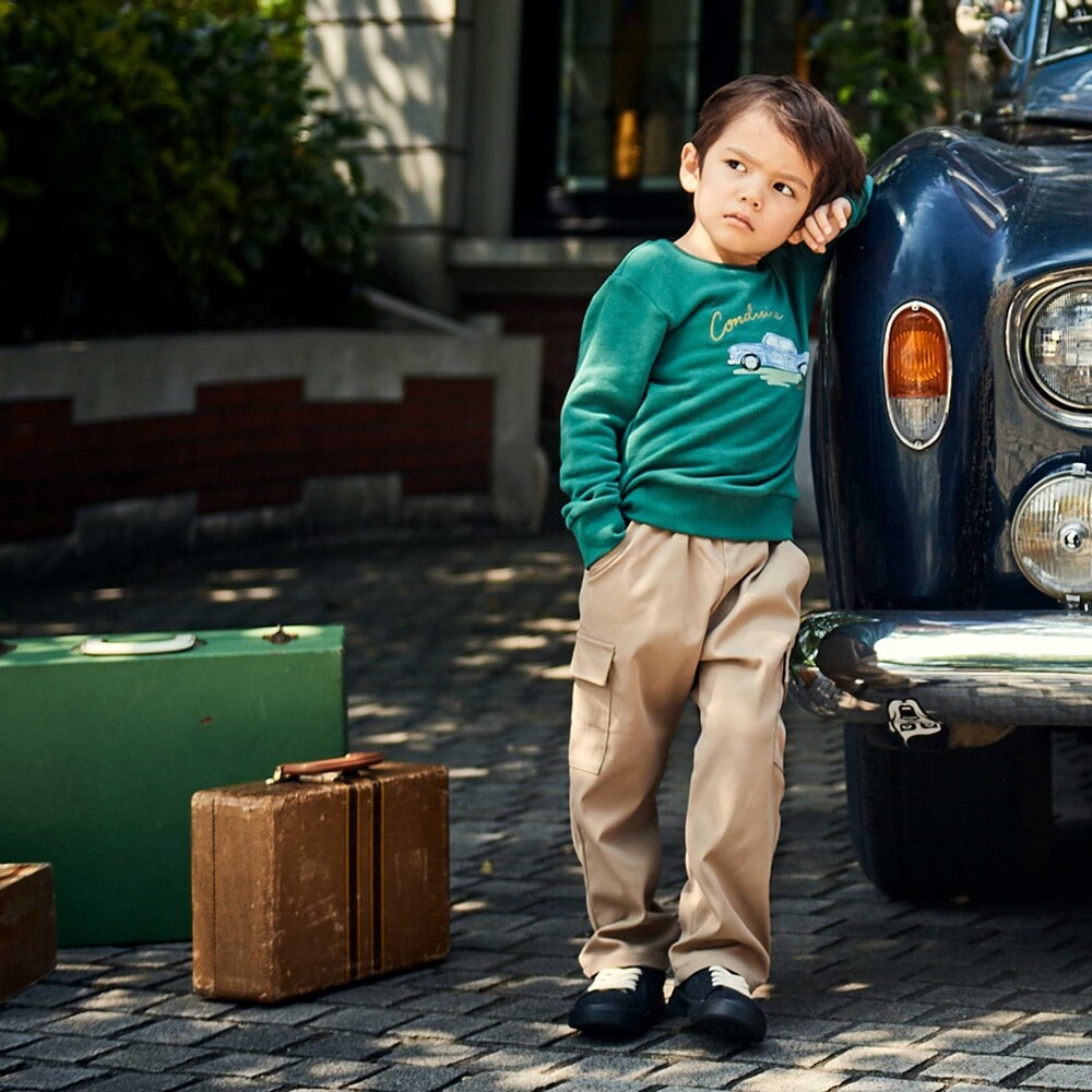 乗り物プリントでも子供っぽくなりすぎずかっこよく着られるデザインです。