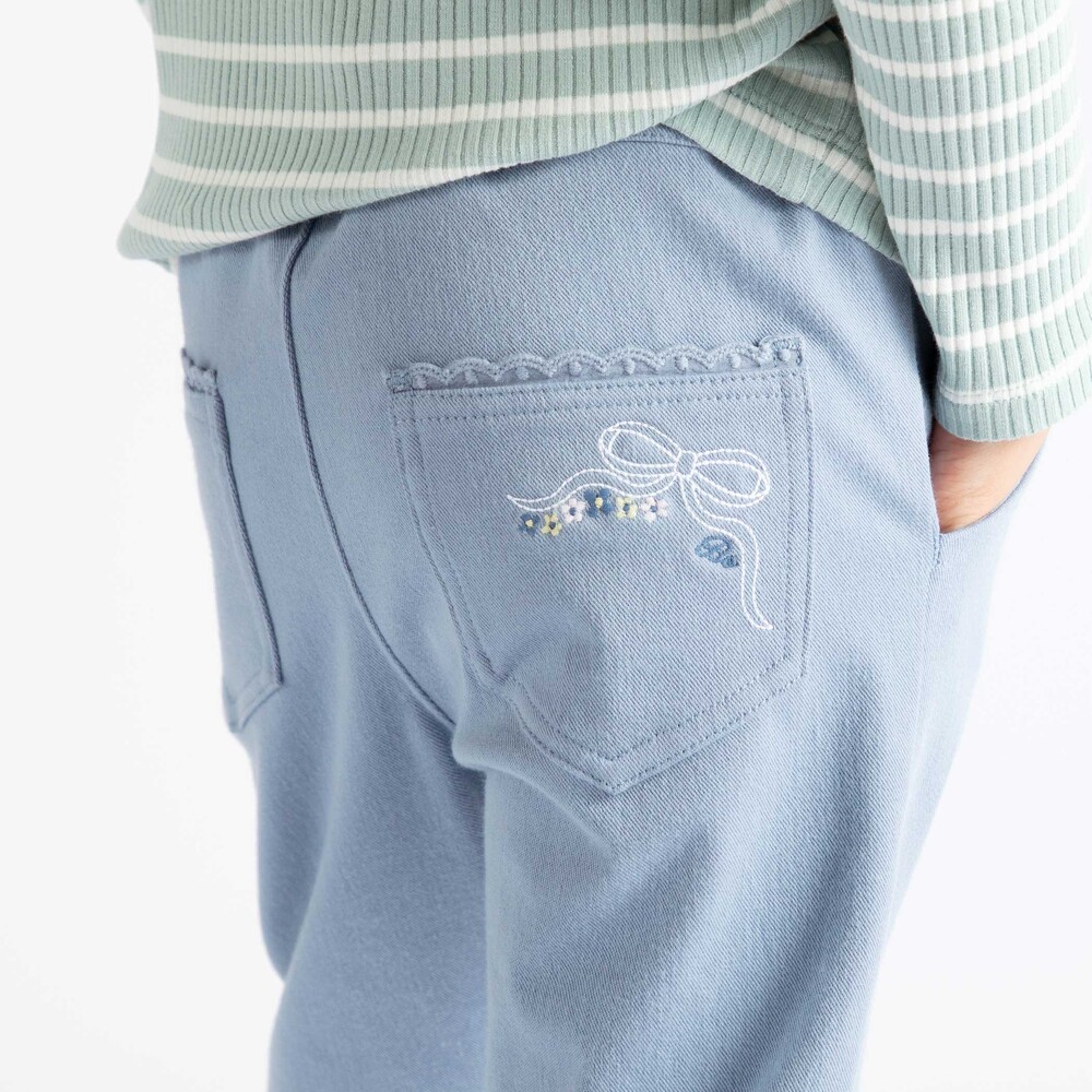 後ろポケットのリボンとお花を組み合わせた刺しゅうが女の子らしいデザイン。