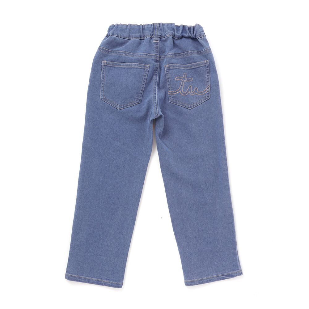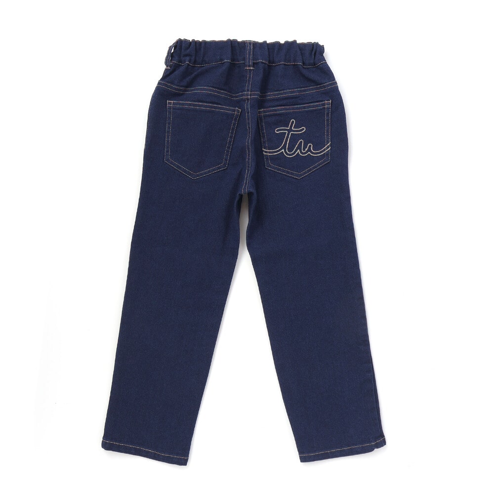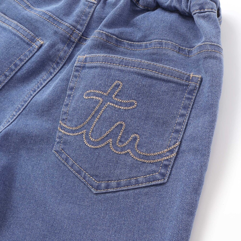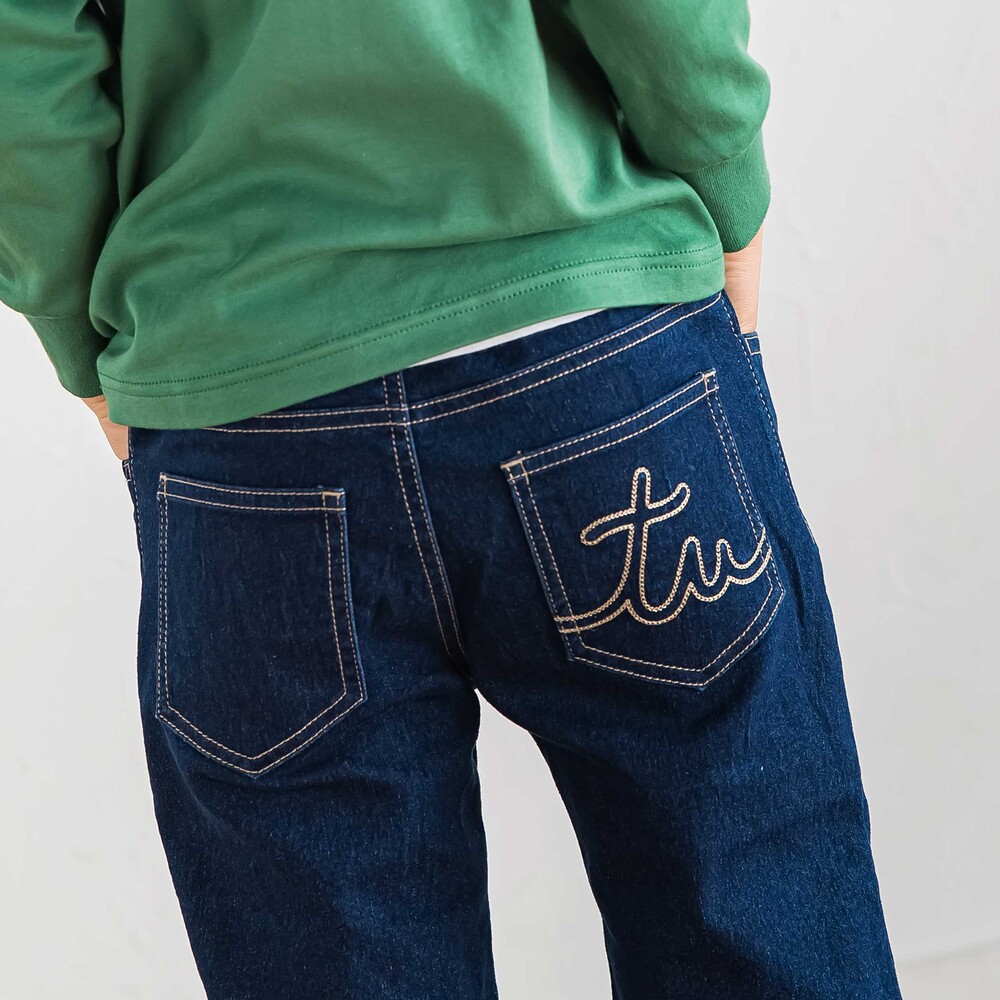 おしりのポケットにはチェーンステッチでロゴ刺しゅうを入れています。
