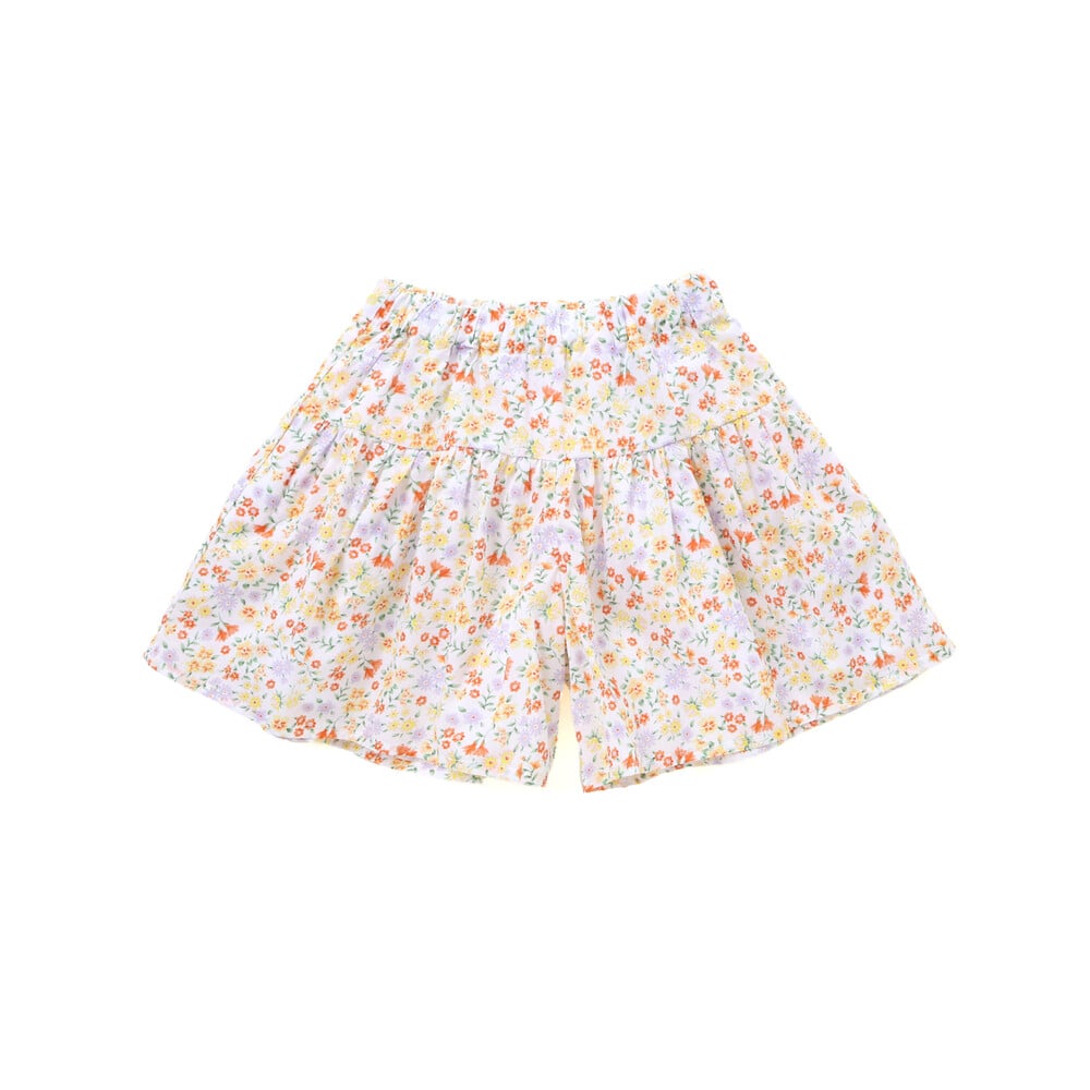 満開の花畑にちょこんと座ったような鮮やかで可愛らしい小花柄のキュロットパンツ。