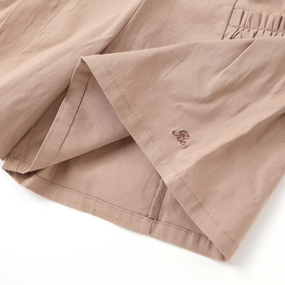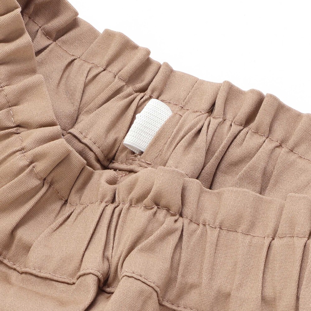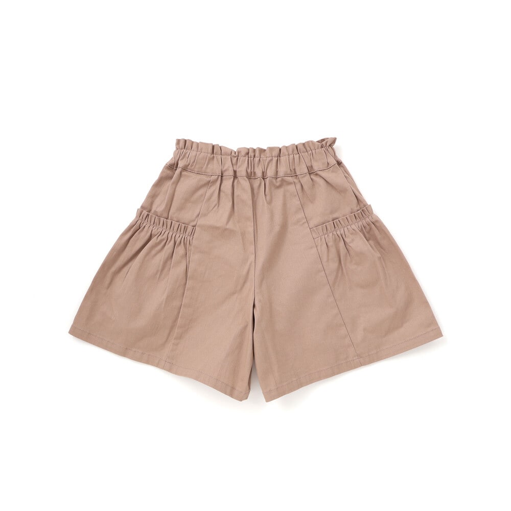 ウエストだけでなくサイドの切り替え部分にもギャザーを寄せたキュロットタイプのシルエット。