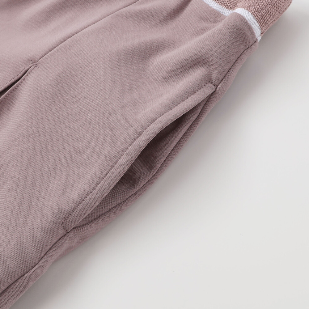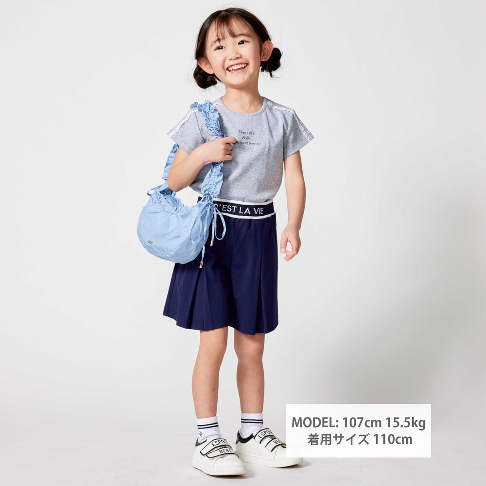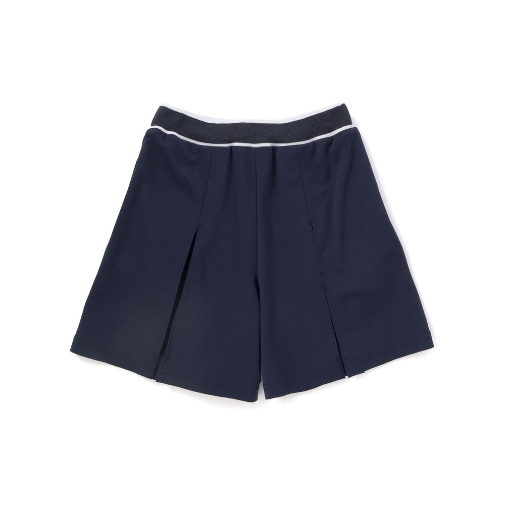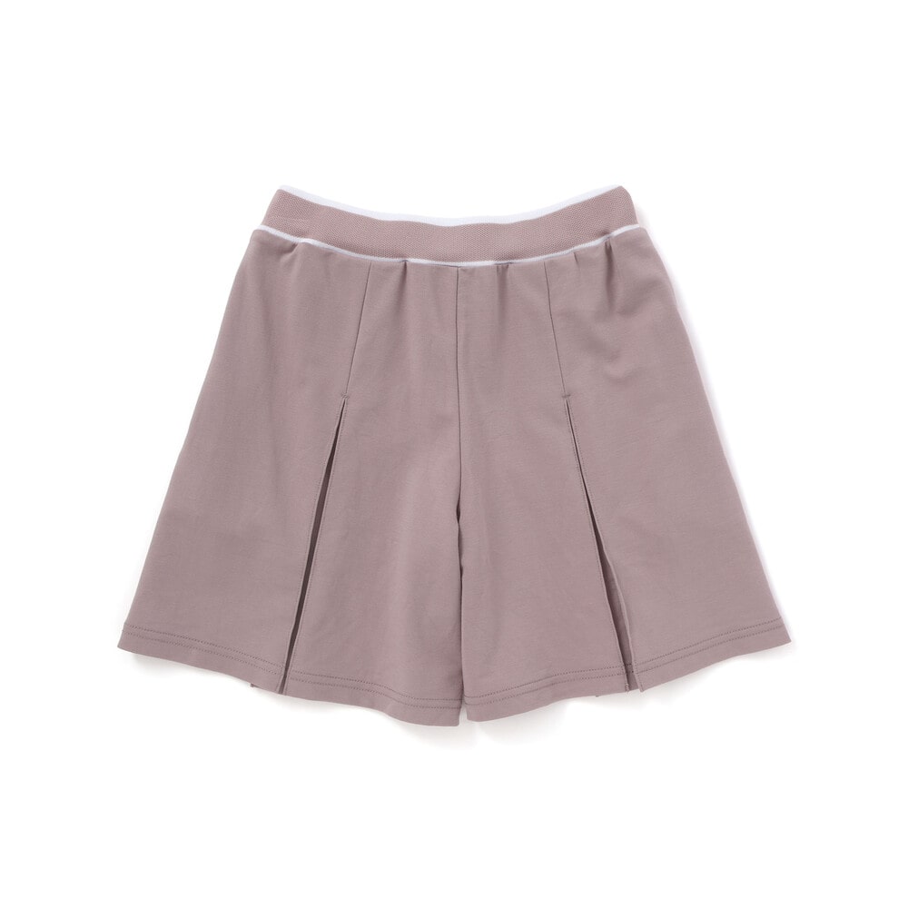 編み立てリブのロゴ入りのウエストがスポーティーな印象のキュロットパンツ。