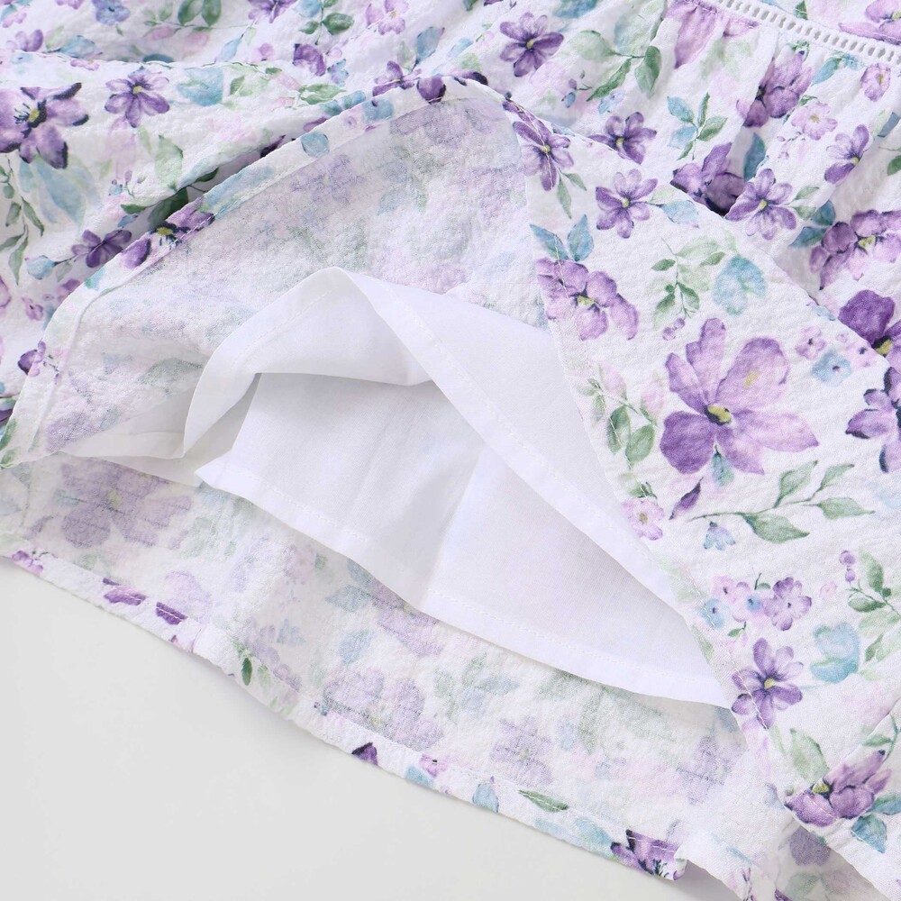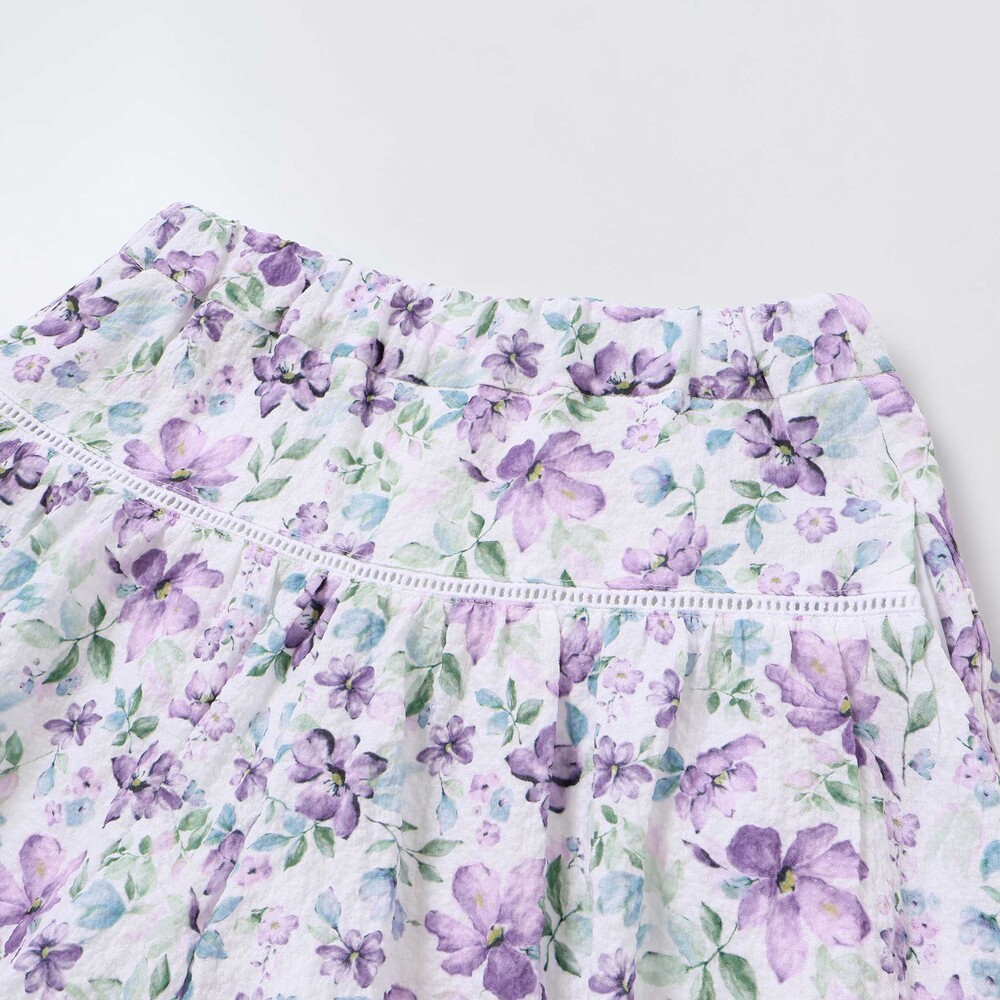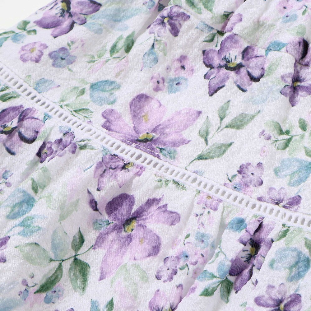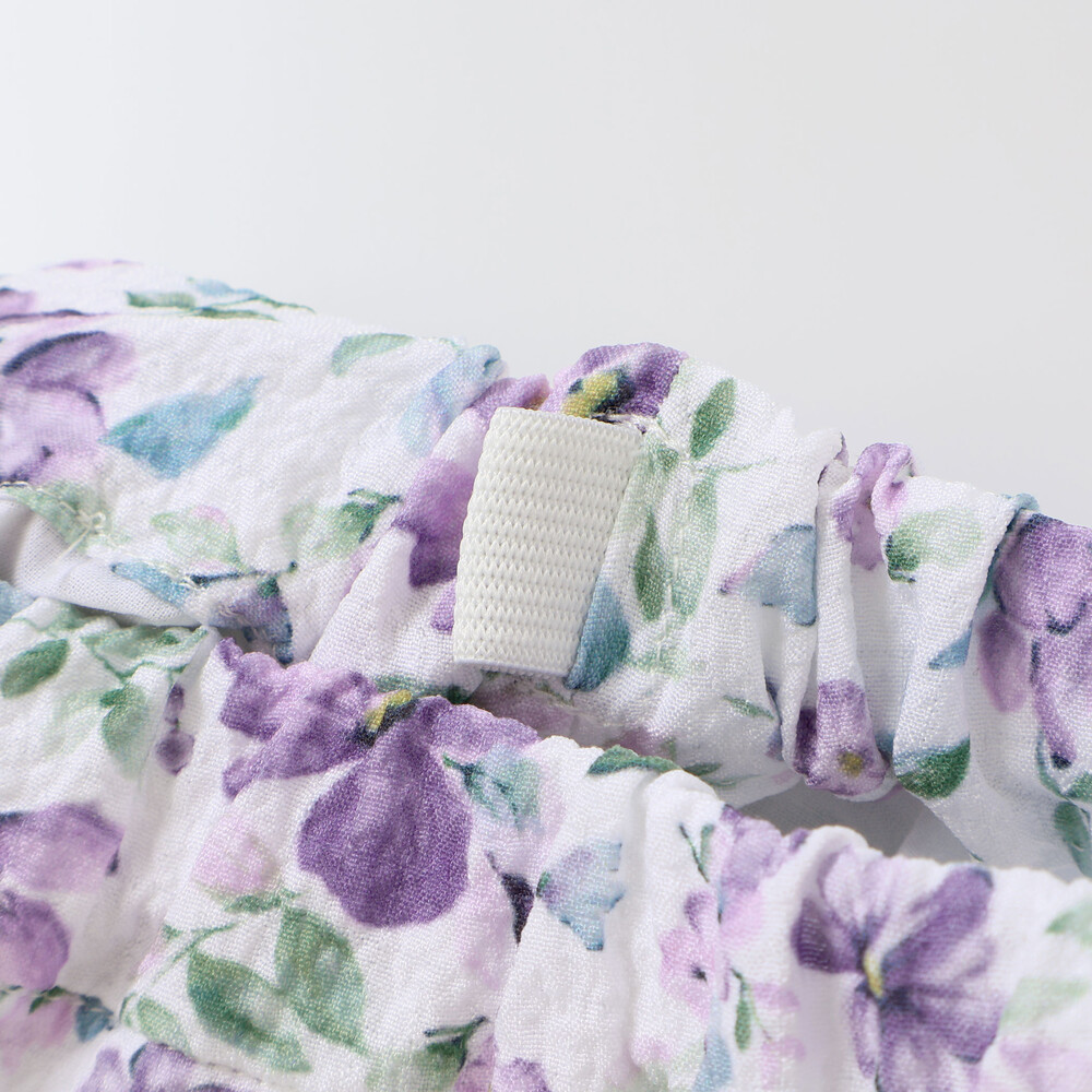軽いシアー感のあるサッカー生地に水彩タッチの花柄プリントをのせたオリジナルファブリックのショートパンツ。