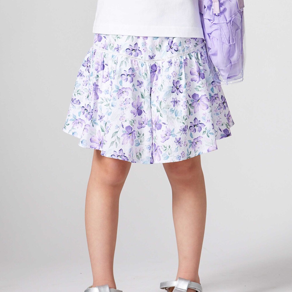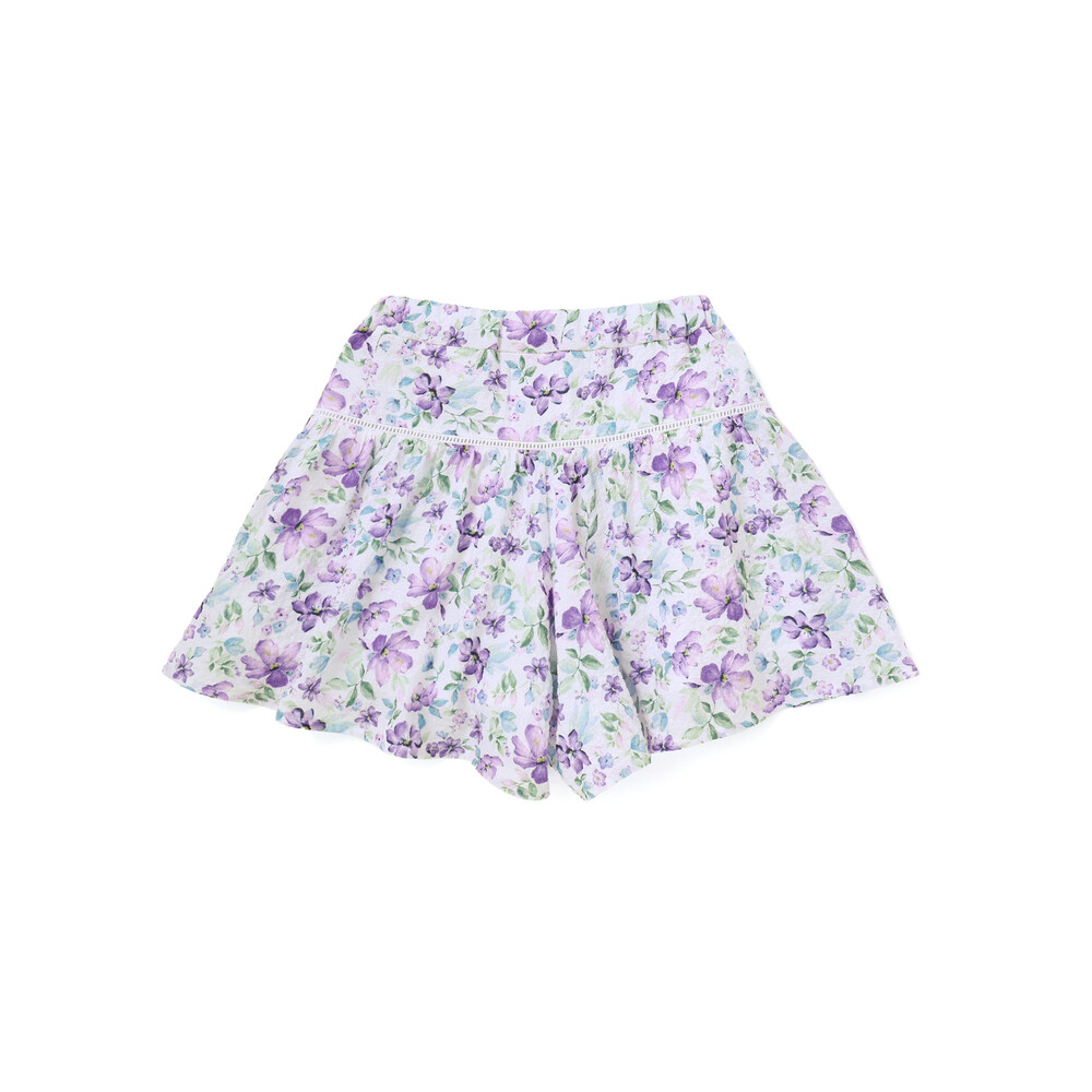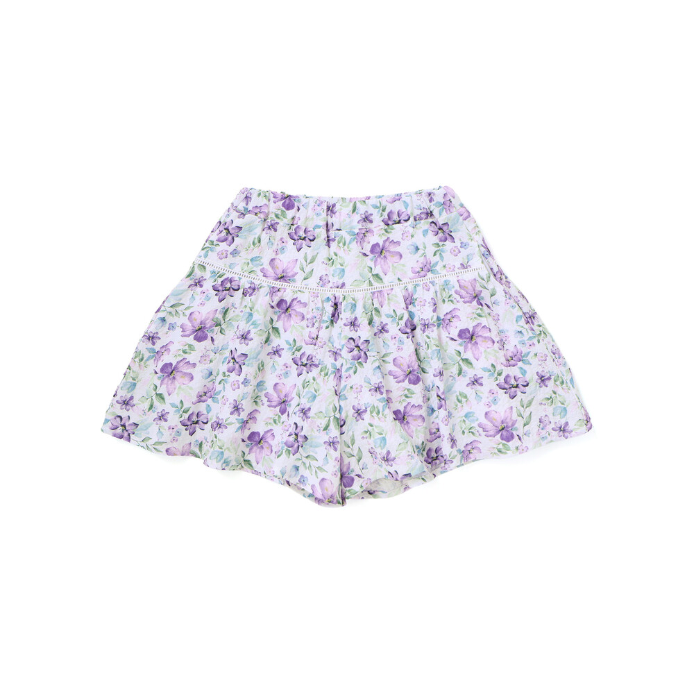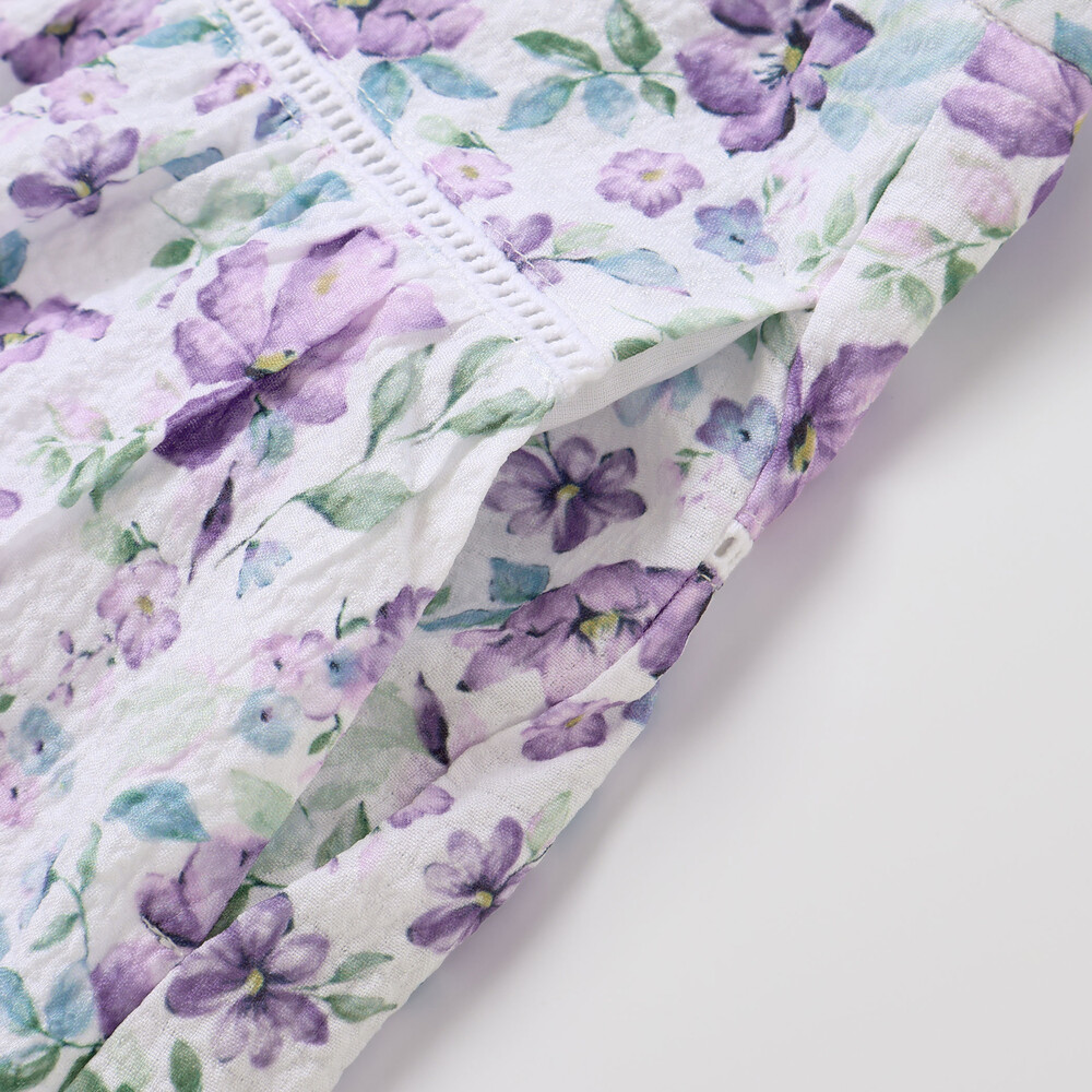 軽いシアー感のあるサッカー生地に水彩タッチの花柄プリントをのせたオリジナルファブリックのショートパンツ。