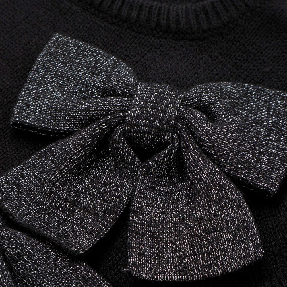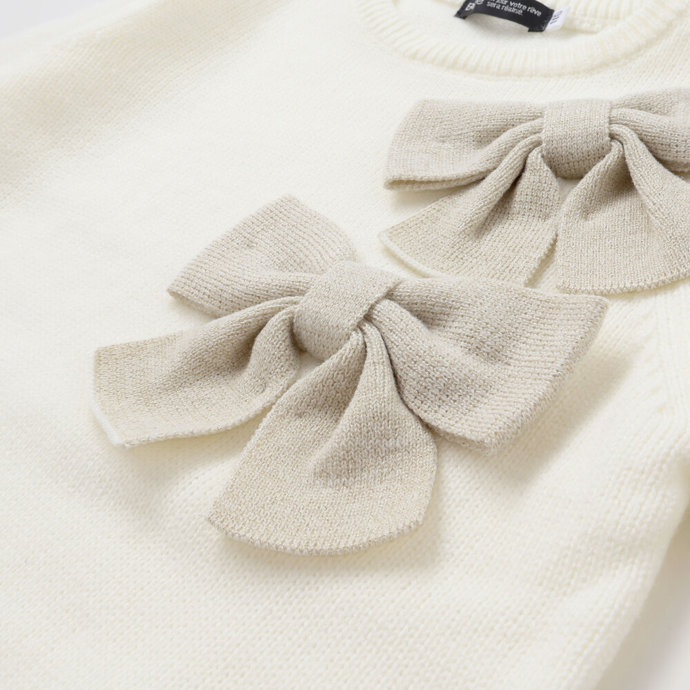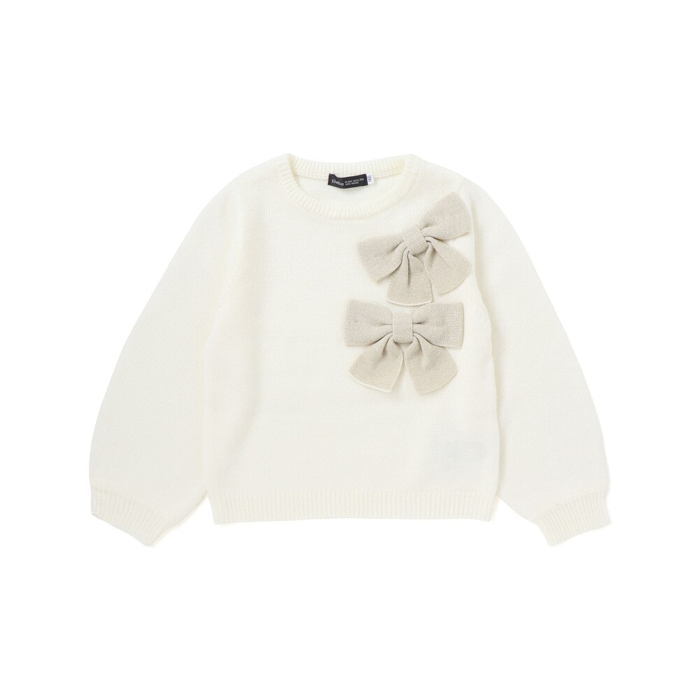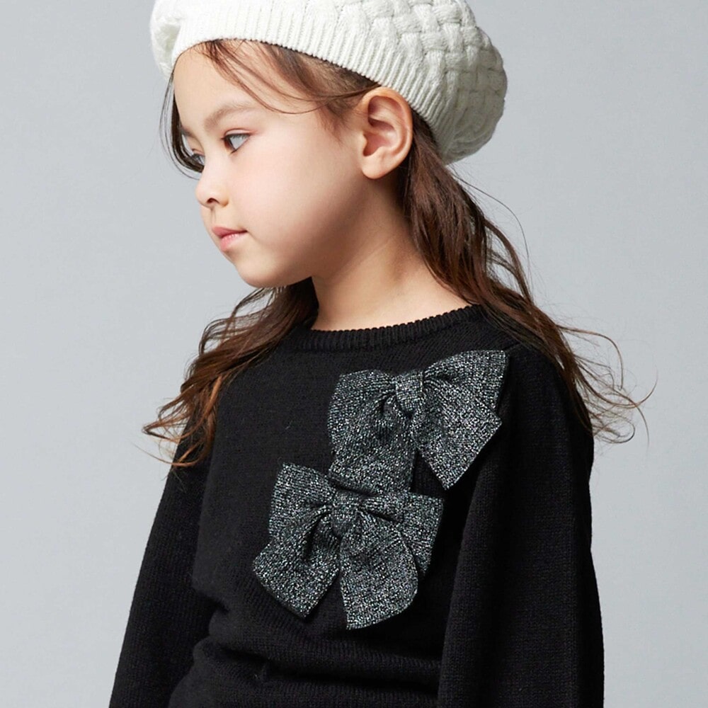 胸元に並んだ大きなリボンモチーフが華やかなセーター。