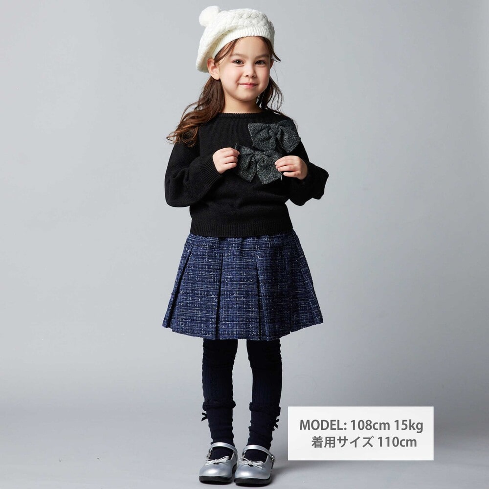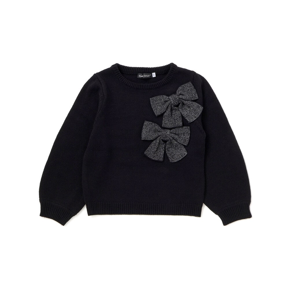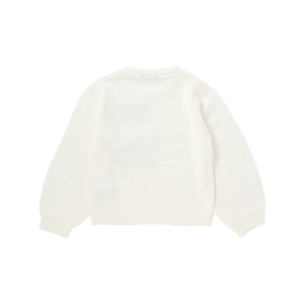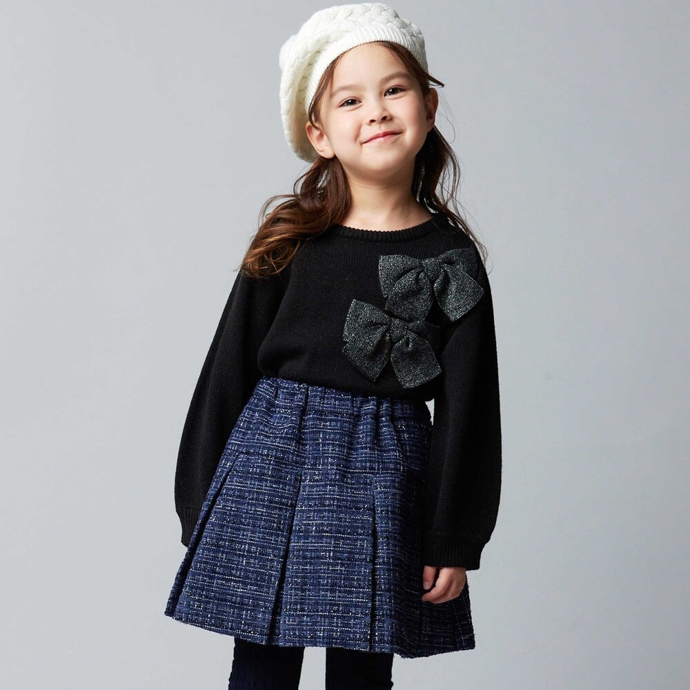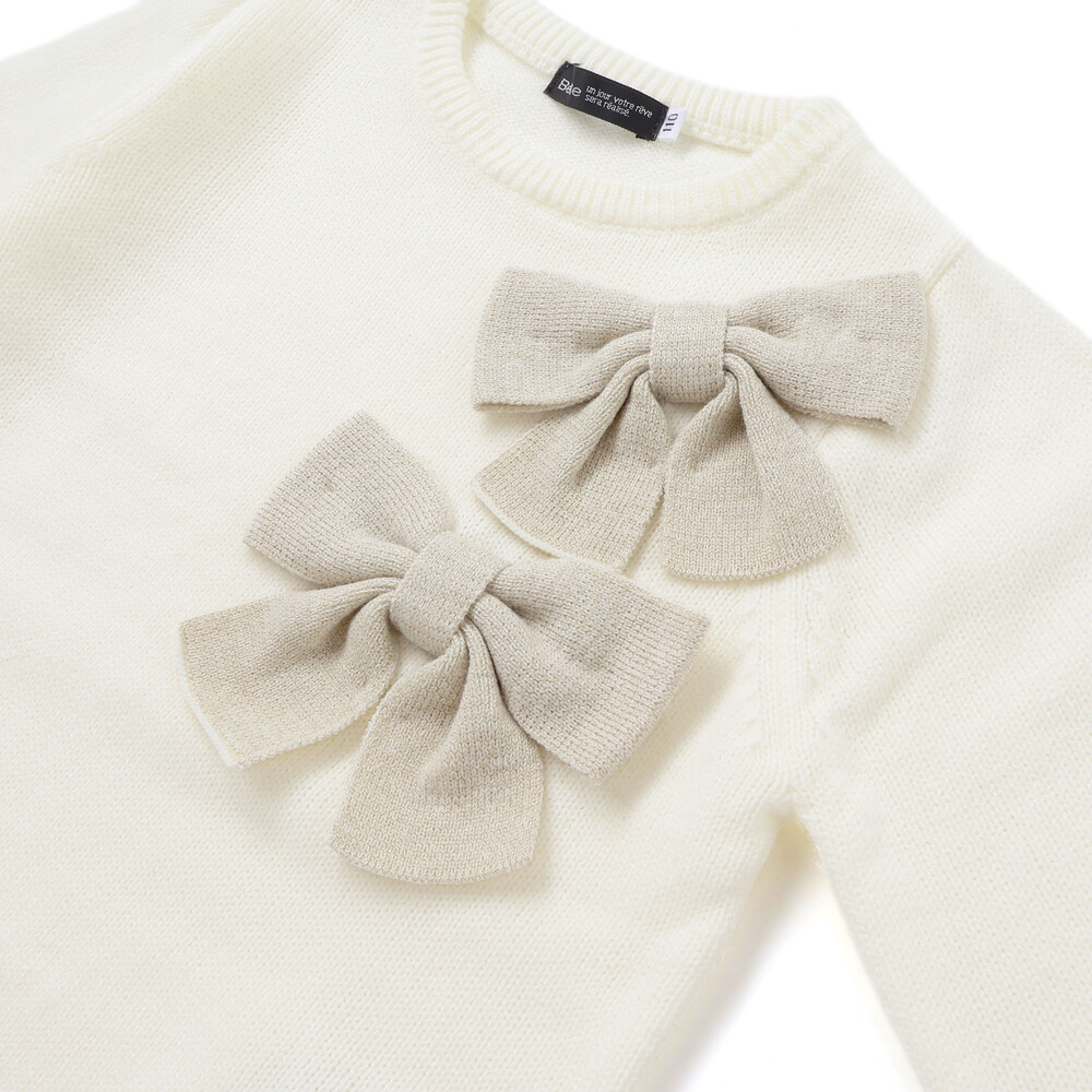 胸元に並んだ大きなリボンモチーフが華やかなセーター。