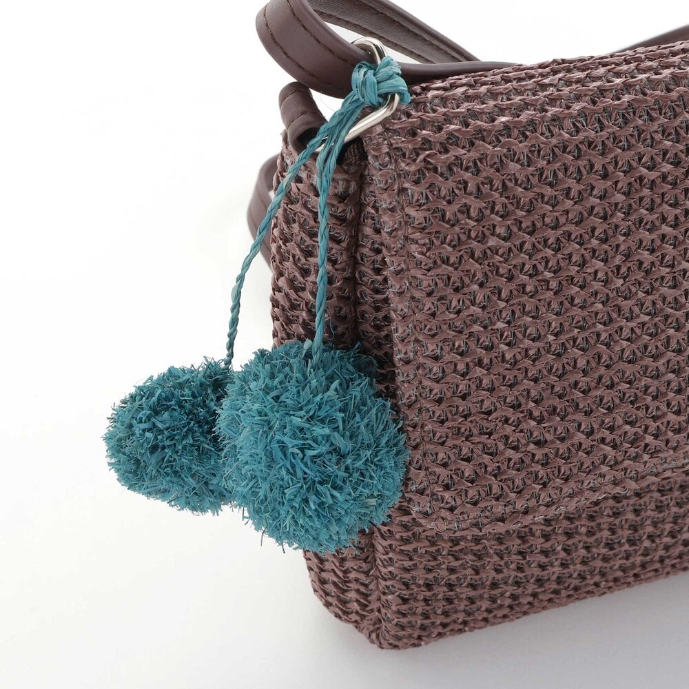 脇に下げられたラフィアのポンポンがポイントになっています。