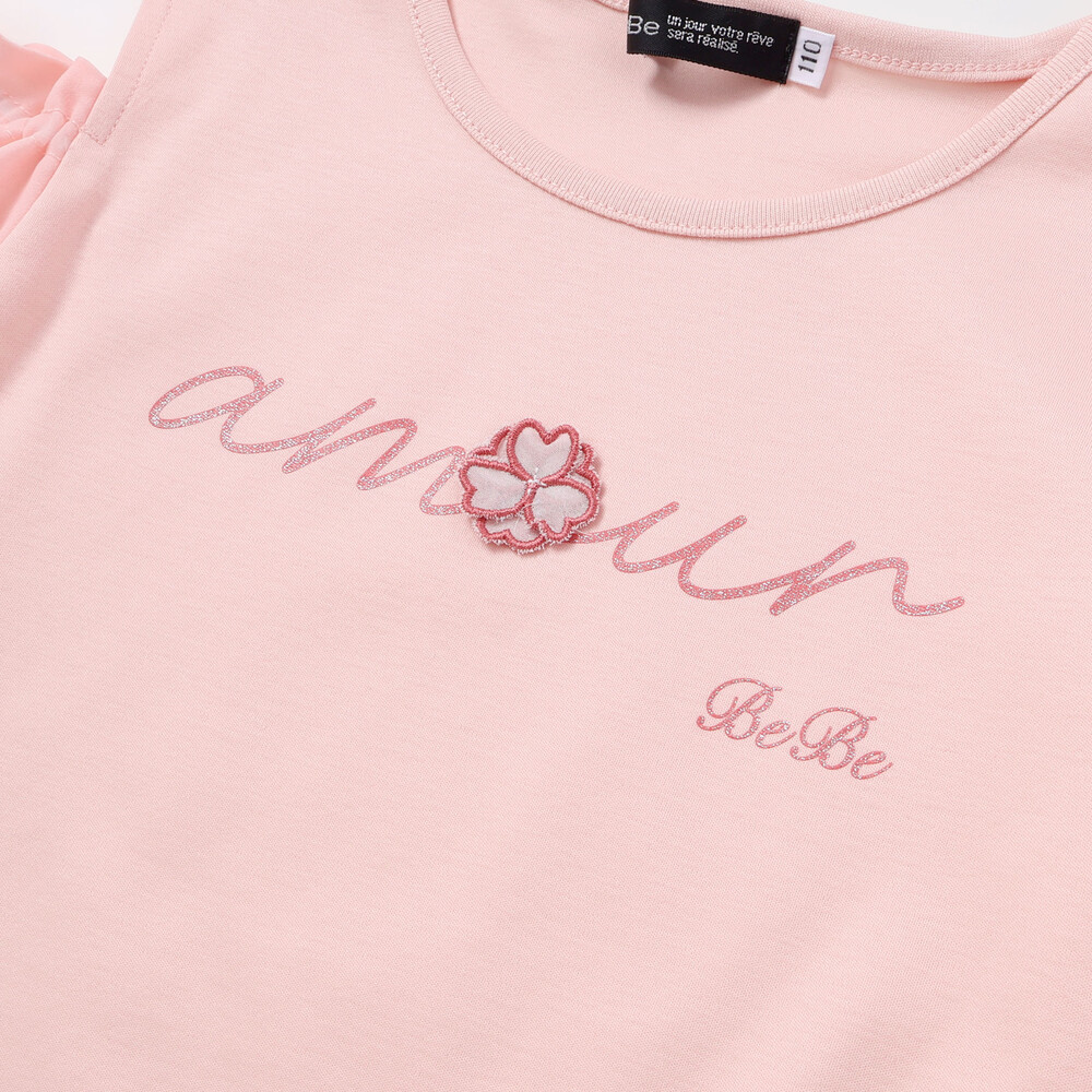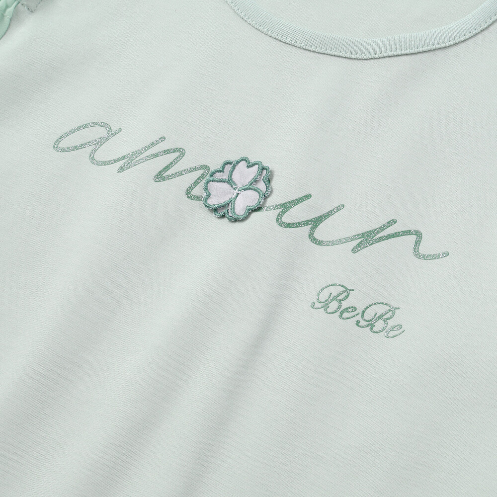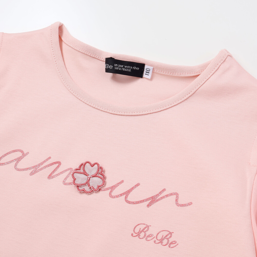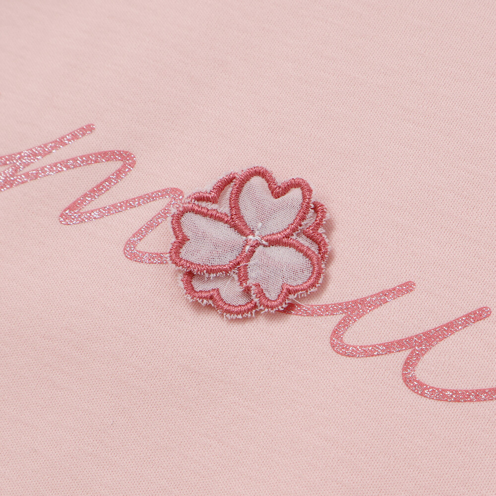 胸元にはキラキラとしたグリッタープリントのロゴと可愛いワンポイントのフラワーモチーフ付き。