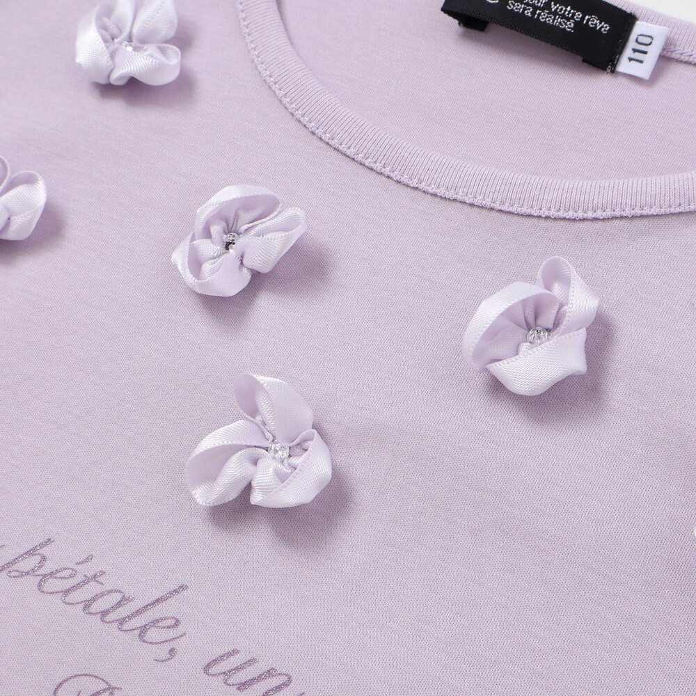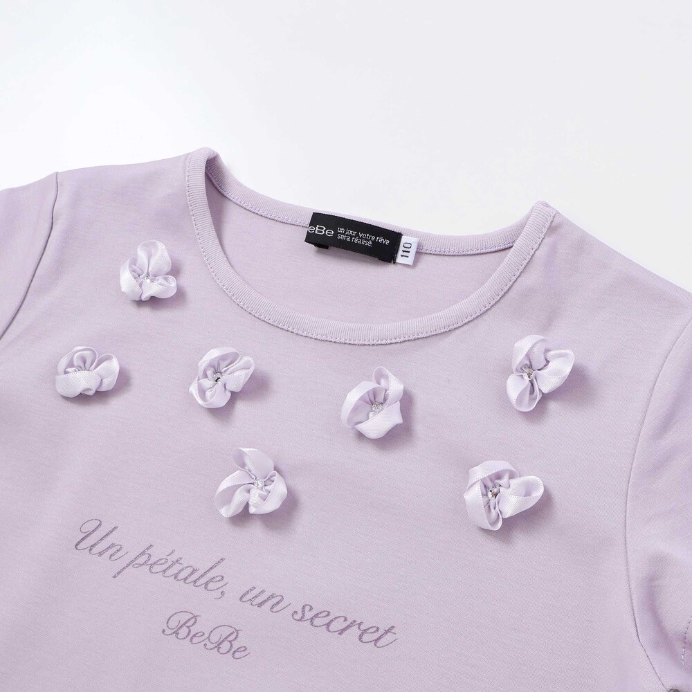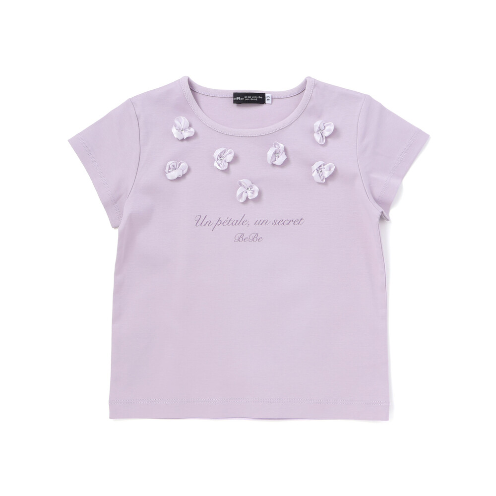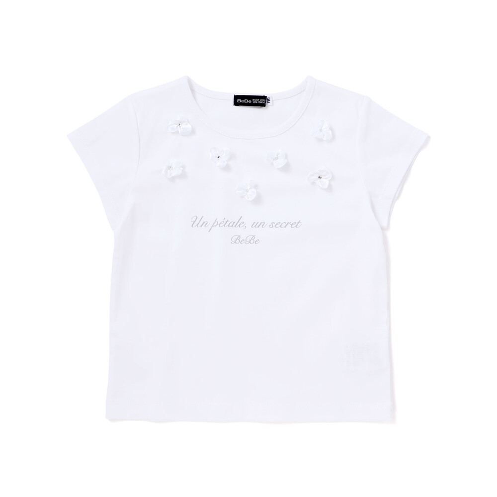 光沢感のあるサテンのフラワーモチーフが散りばめられた半袖Tシャツ。