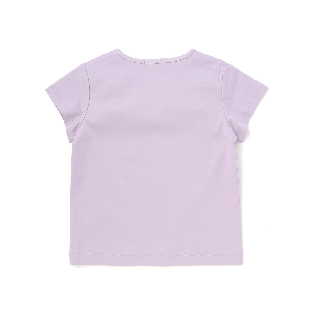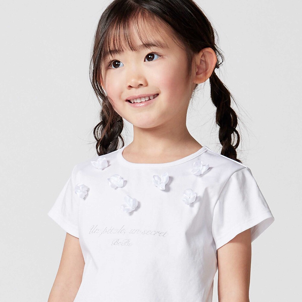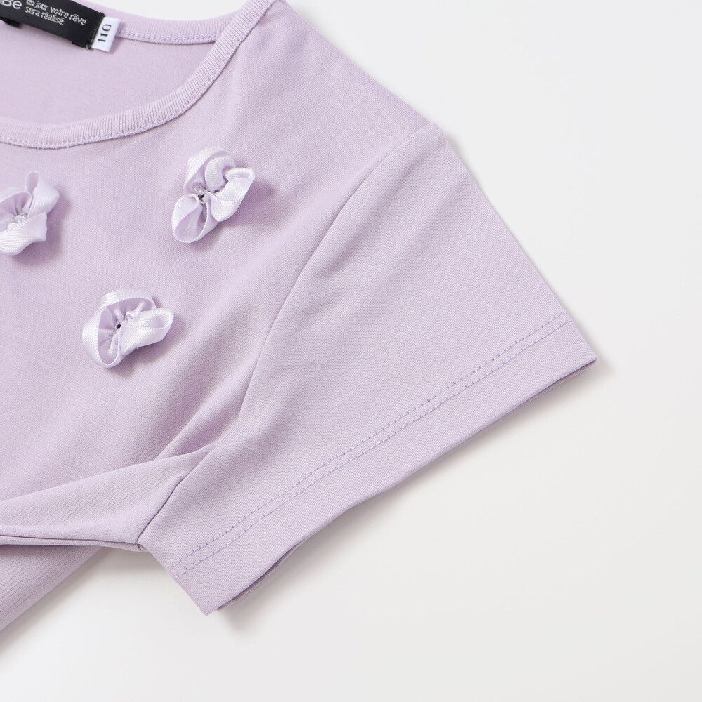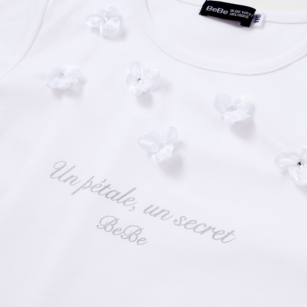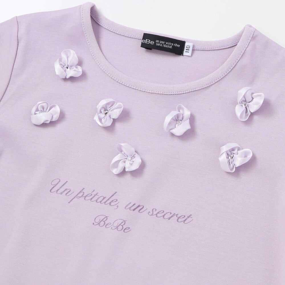 光沢感のあるサテンのフラワーモチーフが散りばめられた半袖Tシャツ。