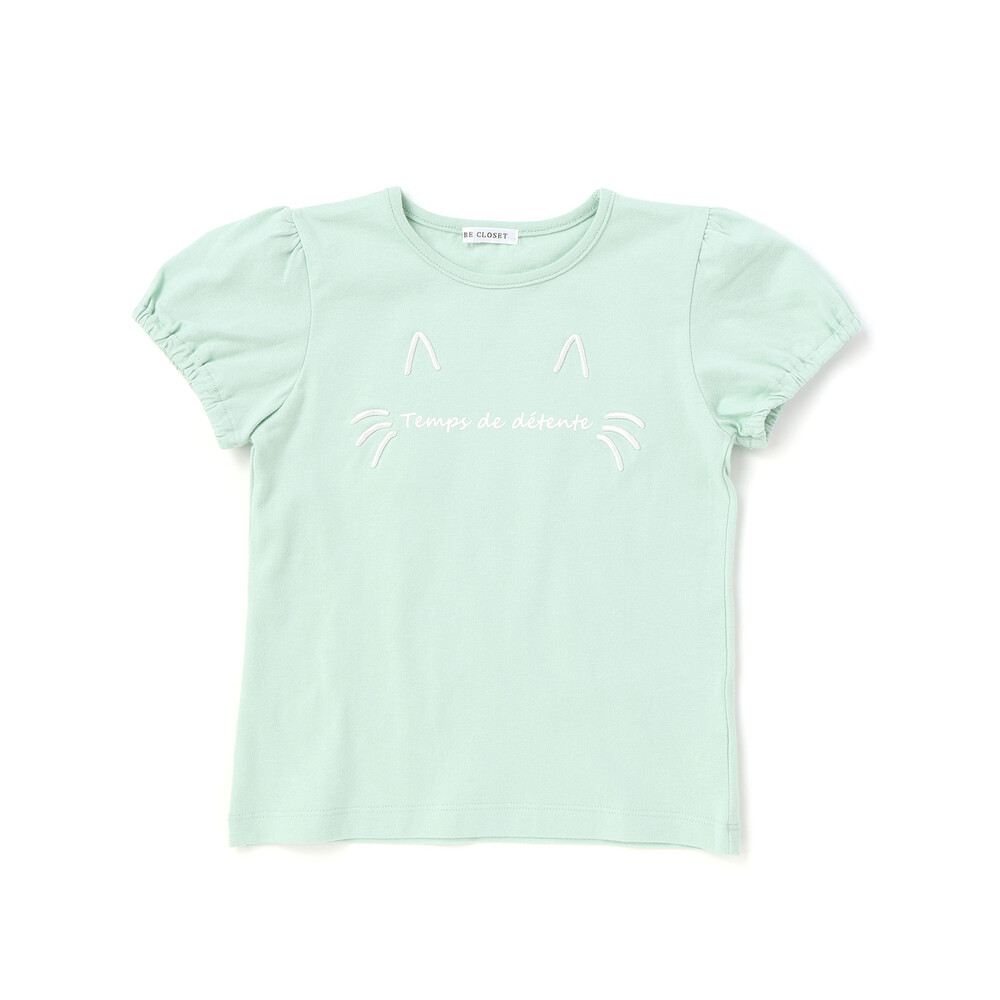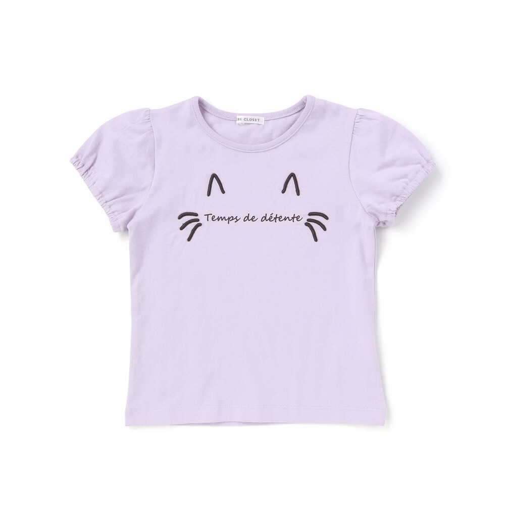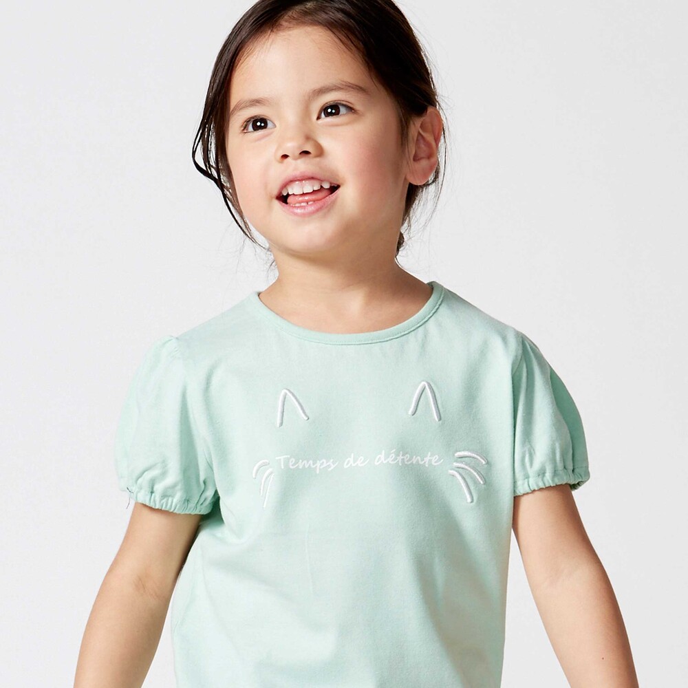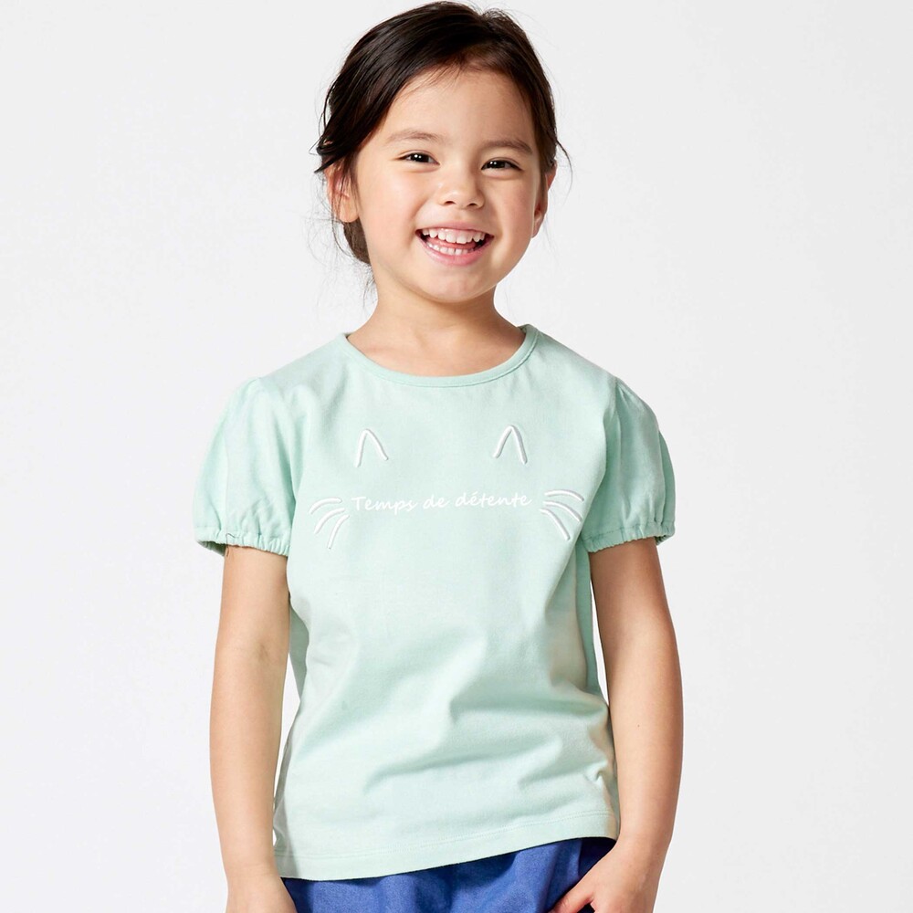 ネコ耳のシルエットを刺しゅうで表現した女の子用半袖Tシャツ。