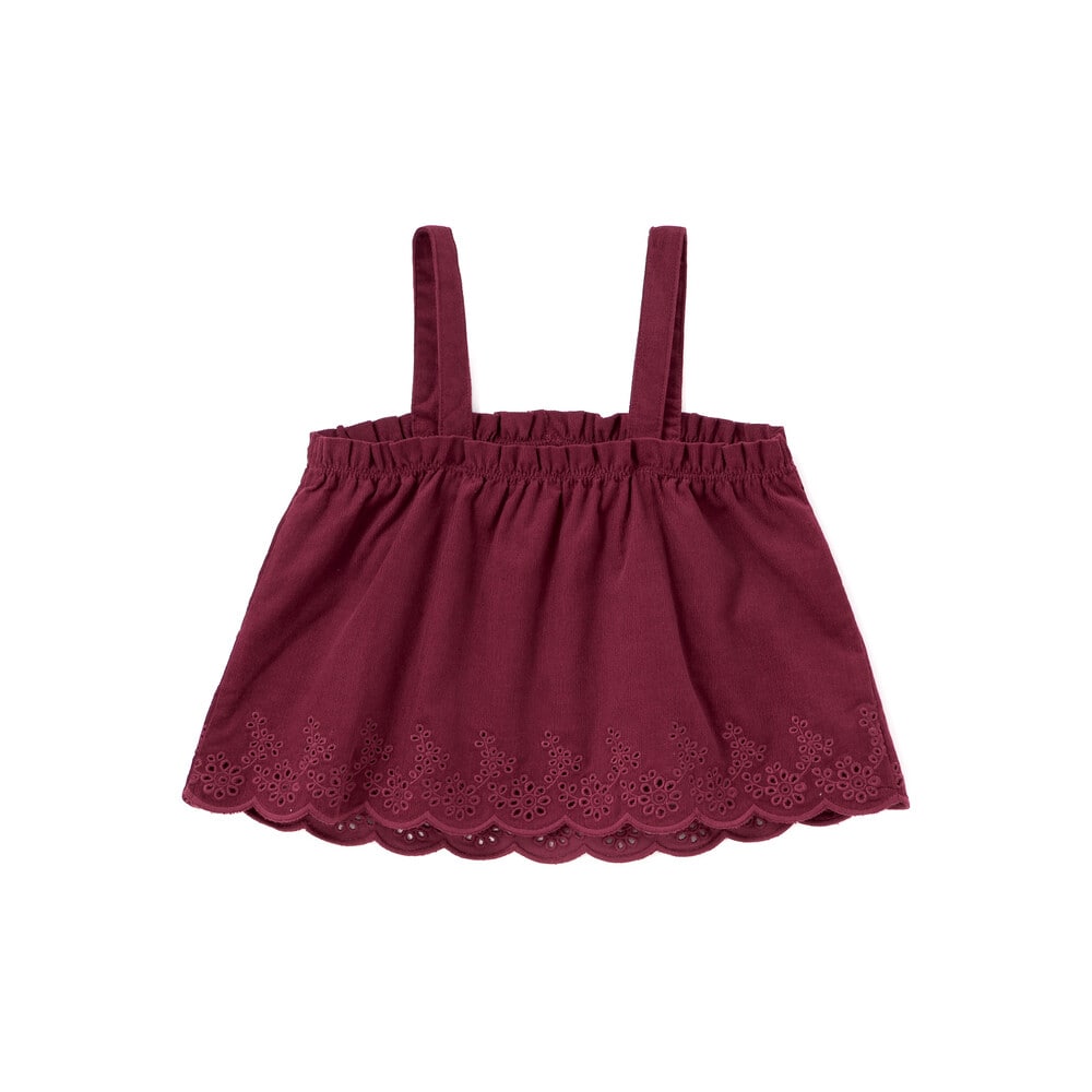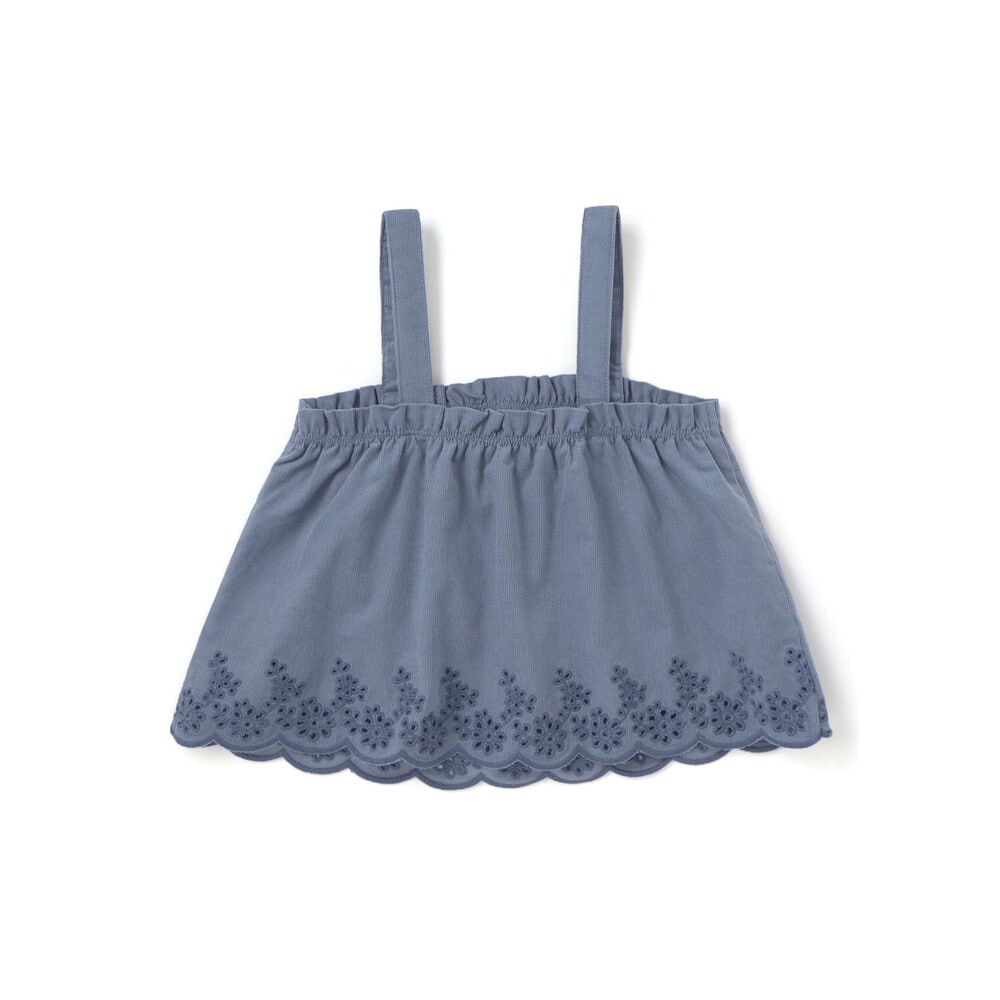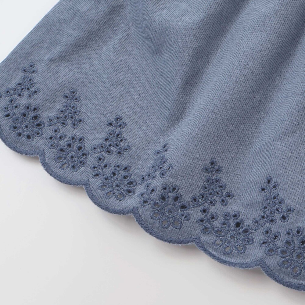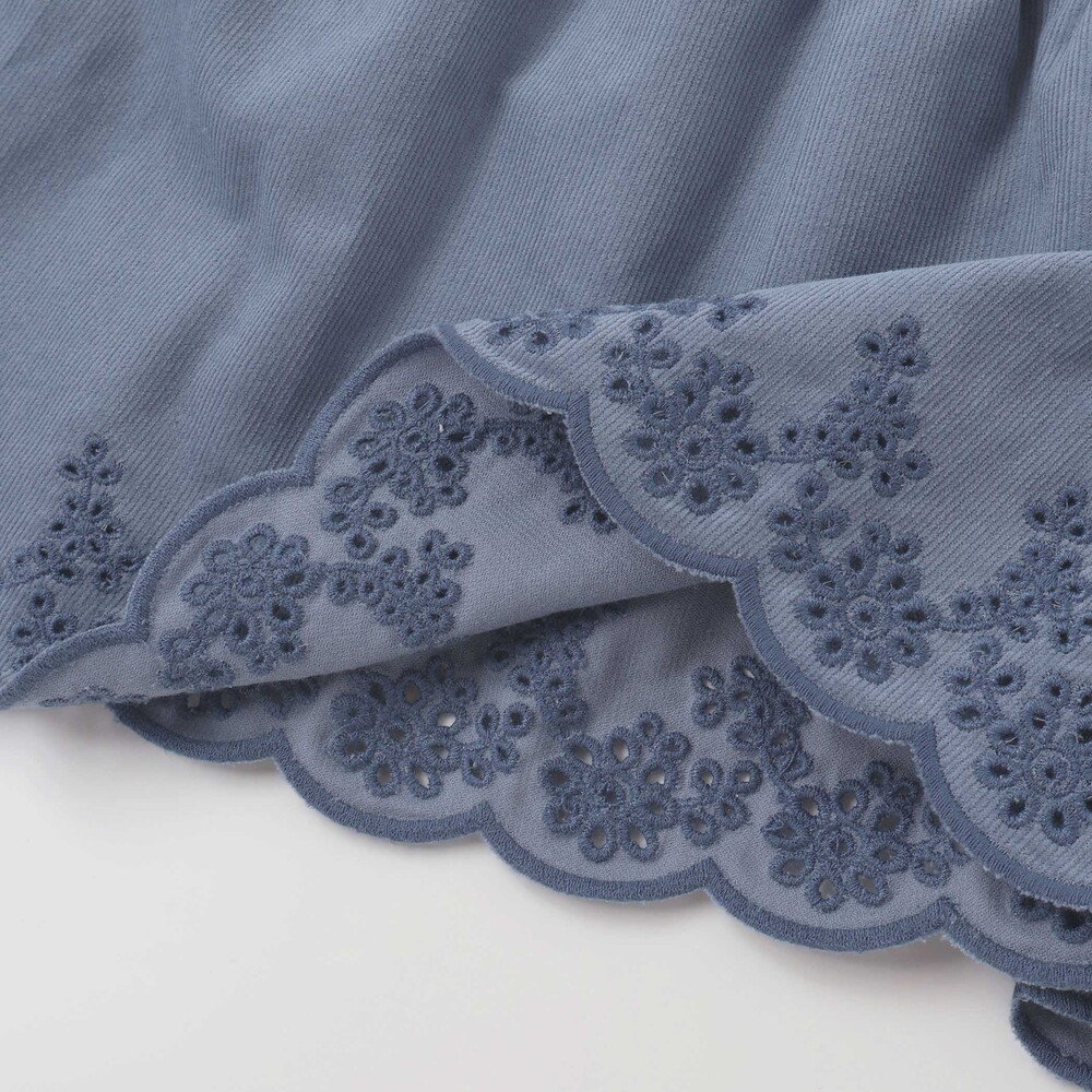 シャツコール生地のビスチェは裾のスカラップ刺しゅうが華やかなデザイン。
