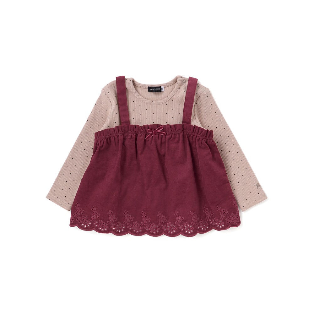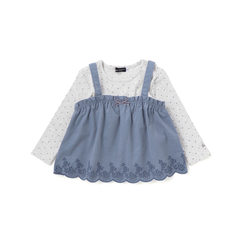 ドットプリントの長袖Tシャツとシャツコールのビスチェの2点セット。