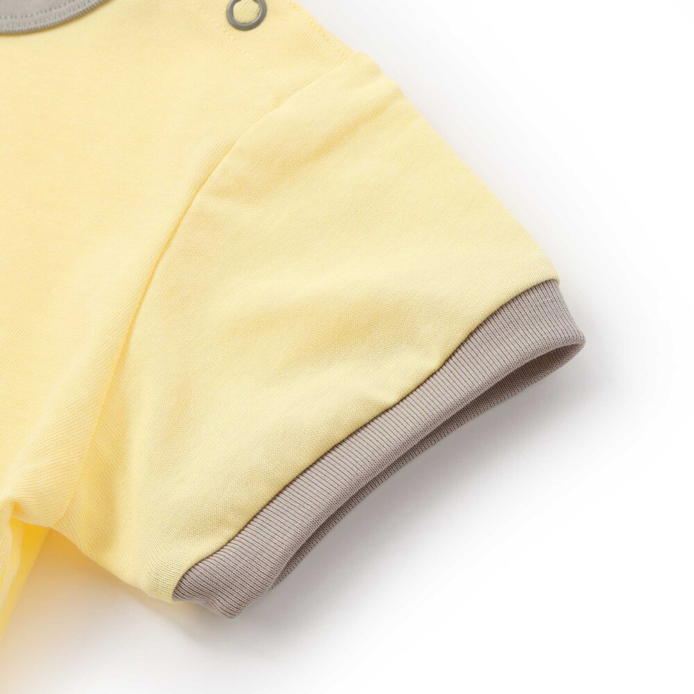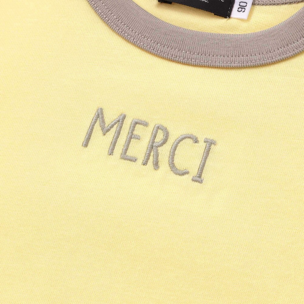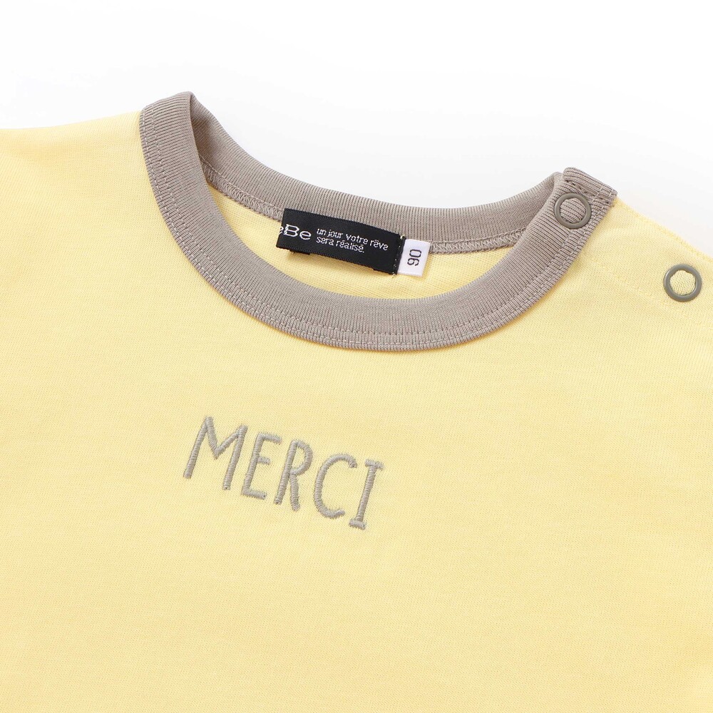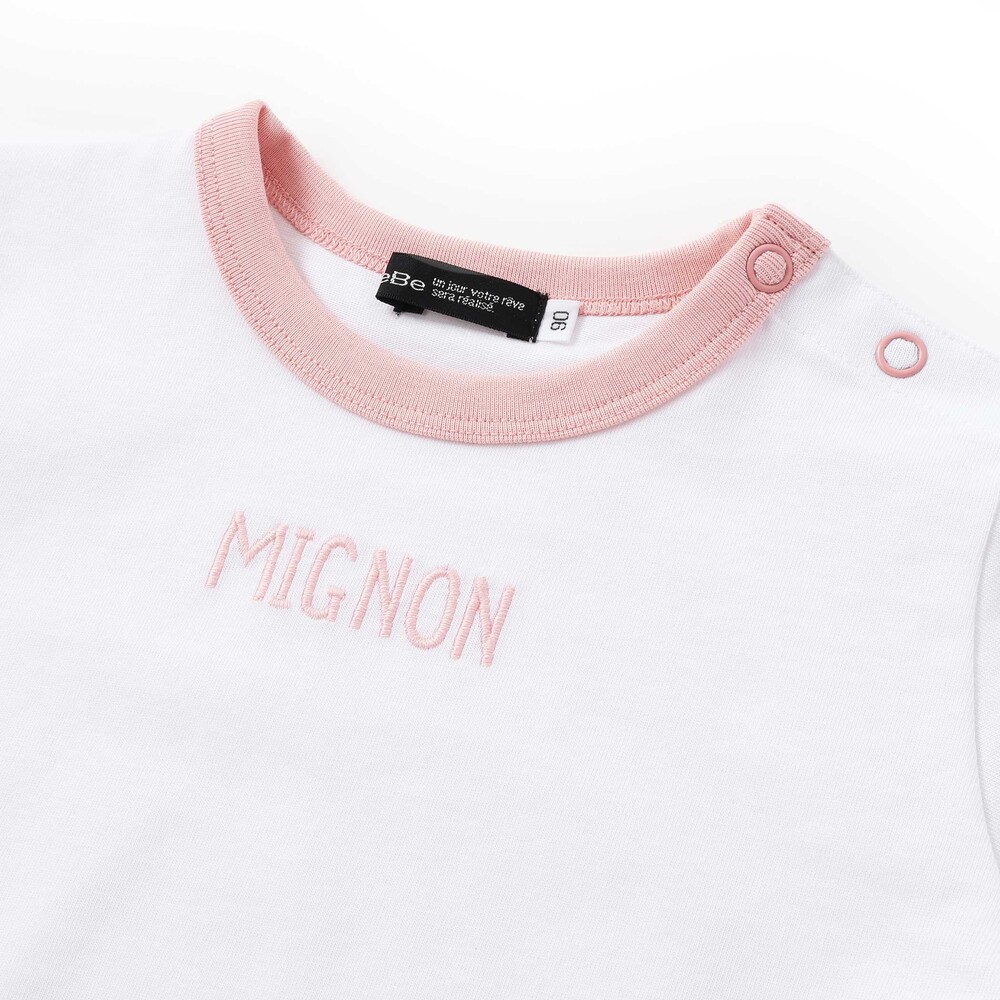 Tシャツは首ぐりや袖口と刺しゅうカラーをパンツの色とリンクさせることで、セットアップ感を出しました。