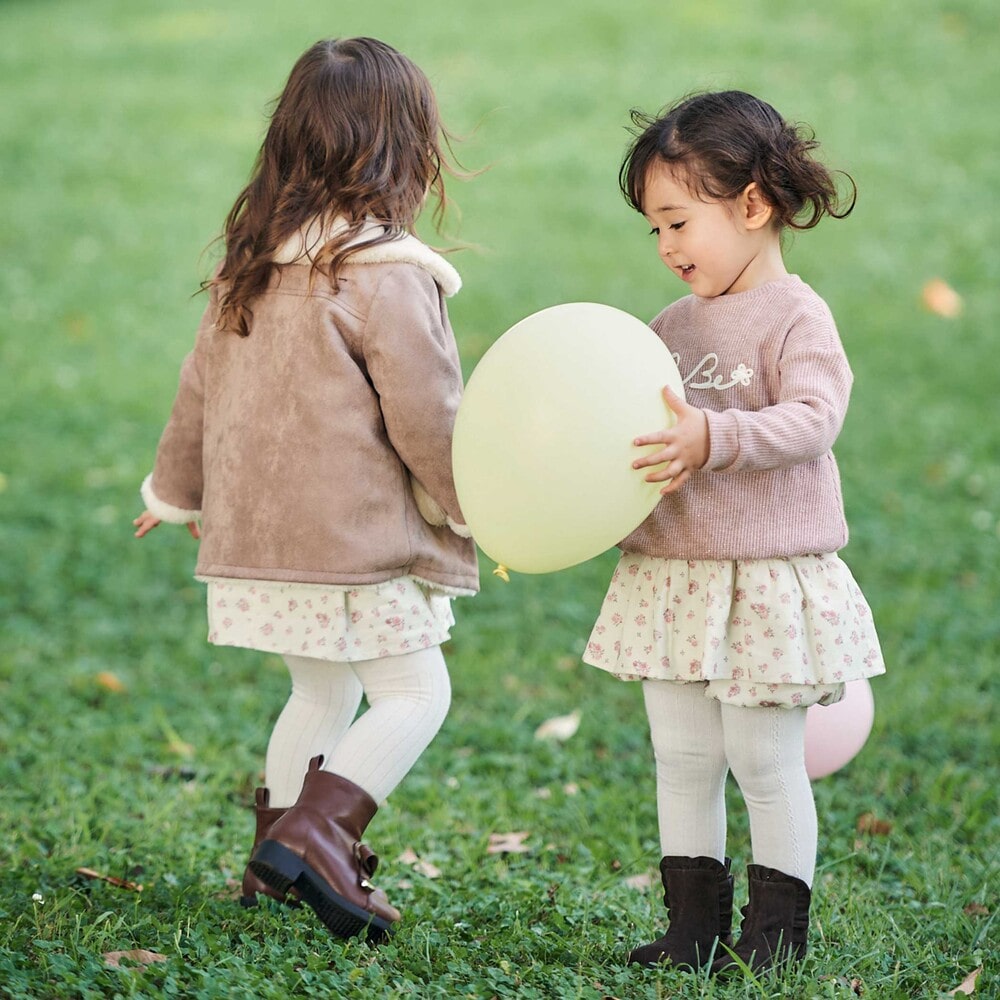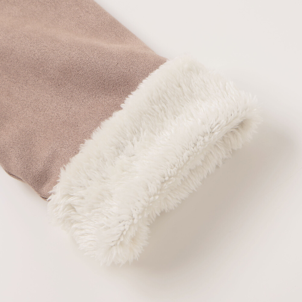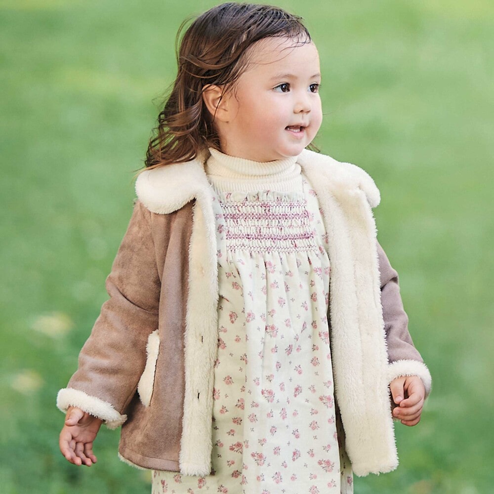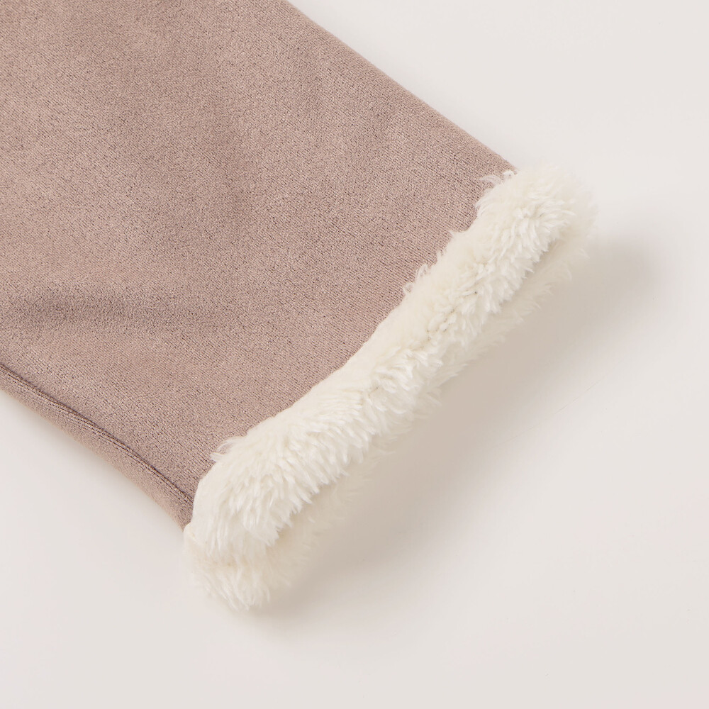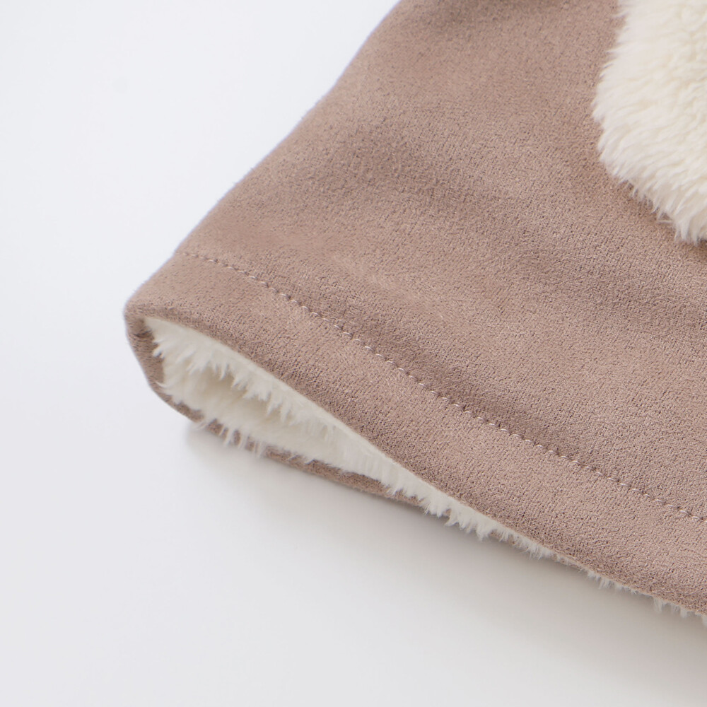 スウェード調のココアブラウンとふわふわボアのクリーム色のコントラストがやさしい。