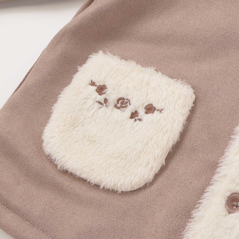 丸い襟やお花の刺しゅうが入ったポケットなど細部までベビーらしく可愛いデザインに仕上げました。