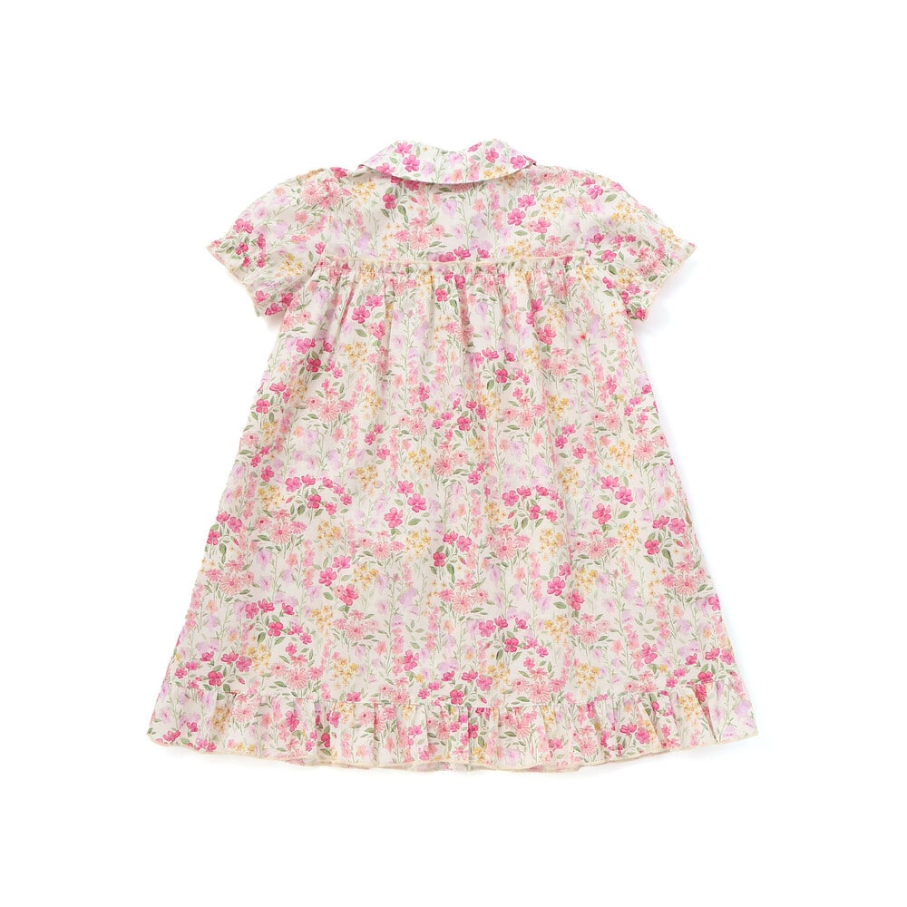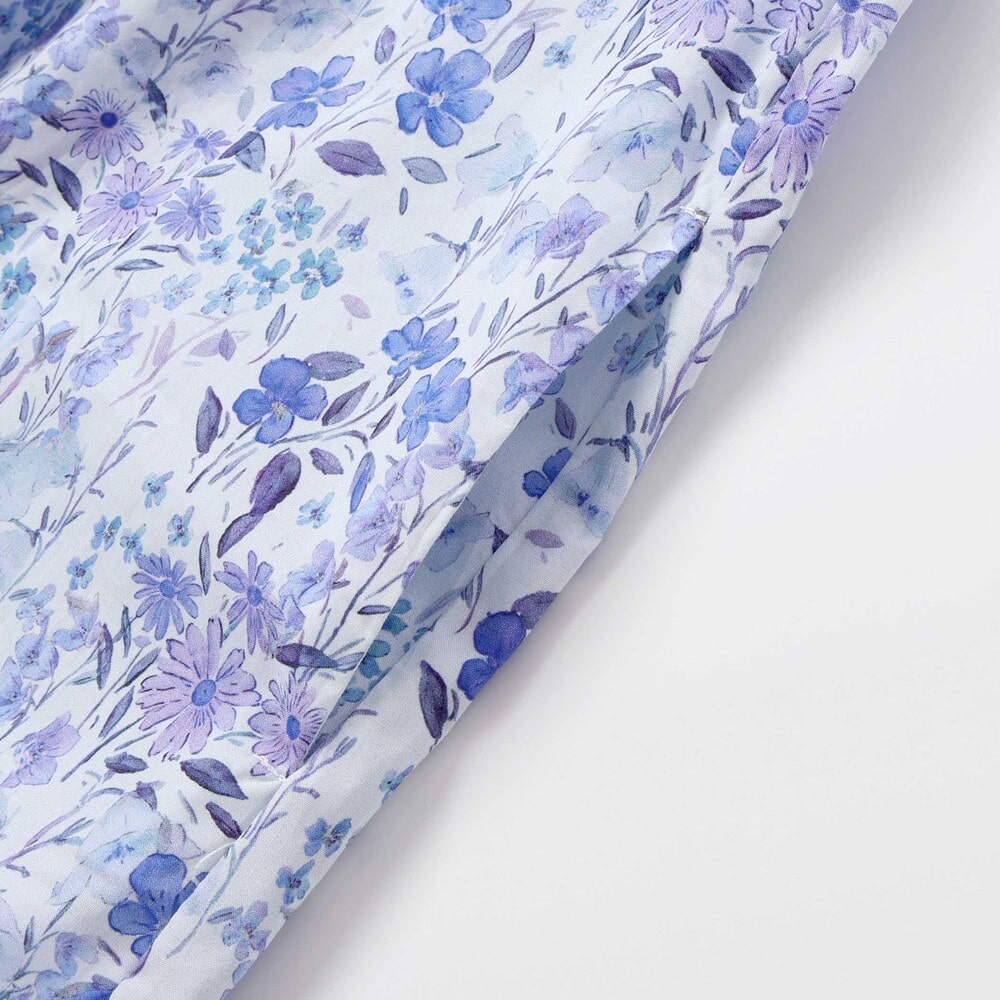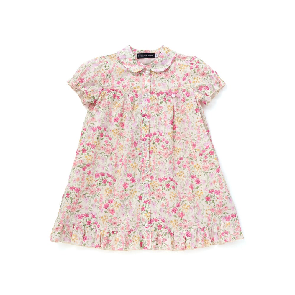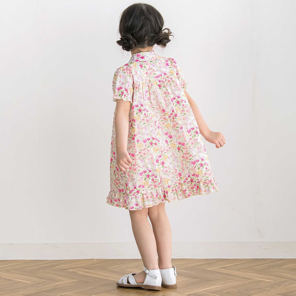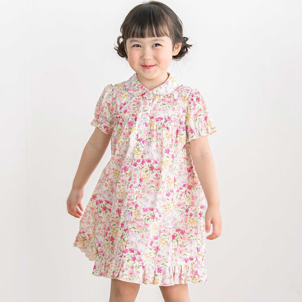 水彩画みたいな華やかな花柄が目を引く半袖ワンピース。
