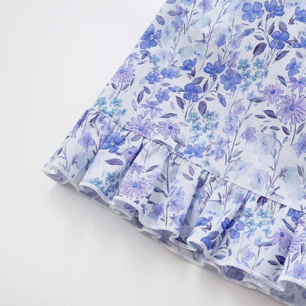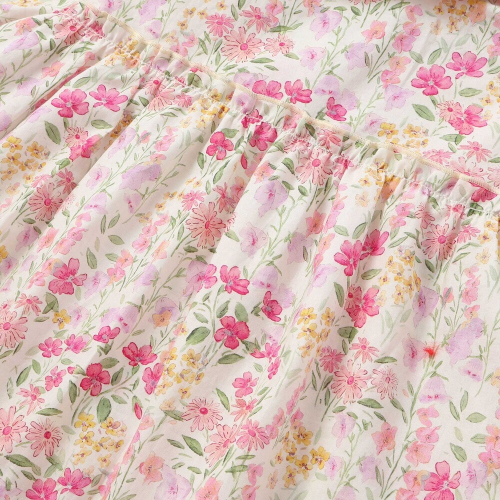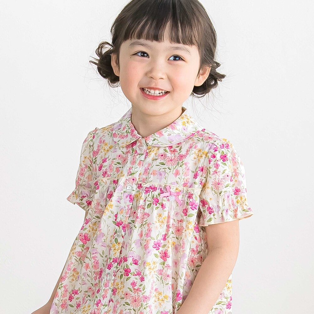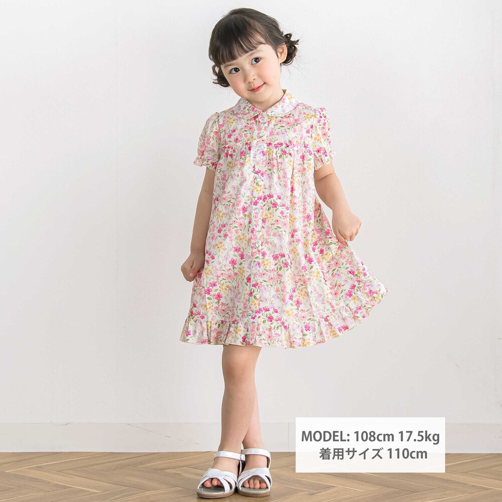 水彩画みたいな華やかな花柄が目を引く半袖ワンピース。