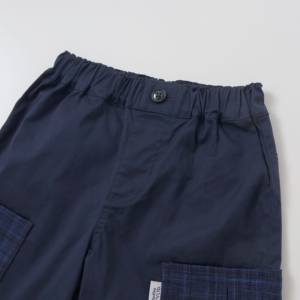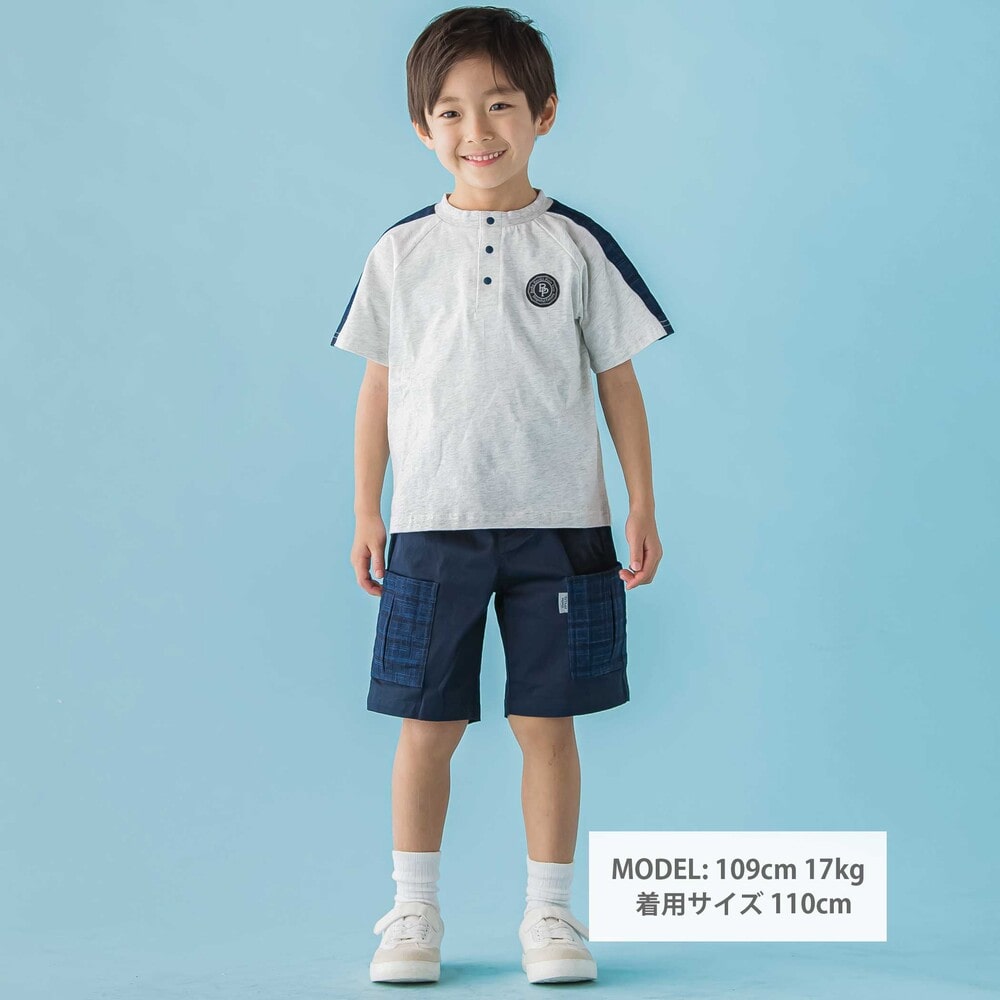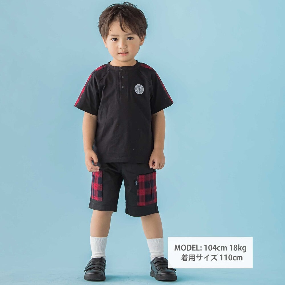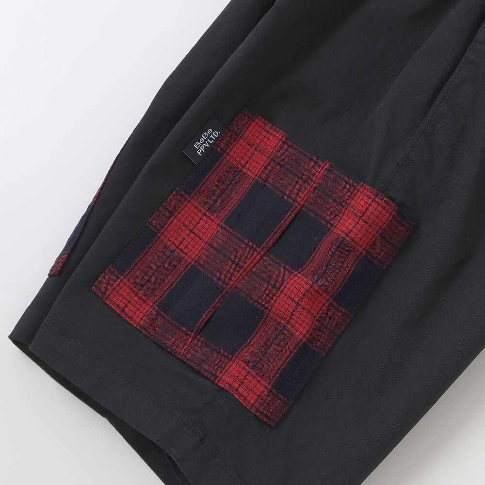 ショートパンツのポケットにもチェック柄をプラスし、さりげなくリンクしたデザインでクールに決まります。