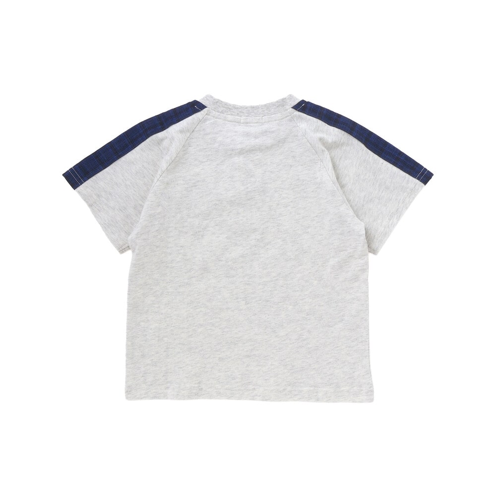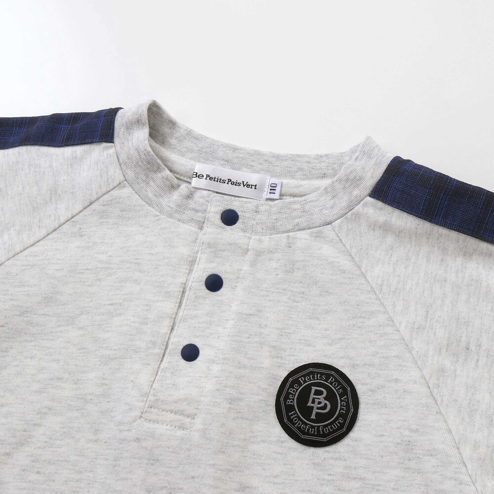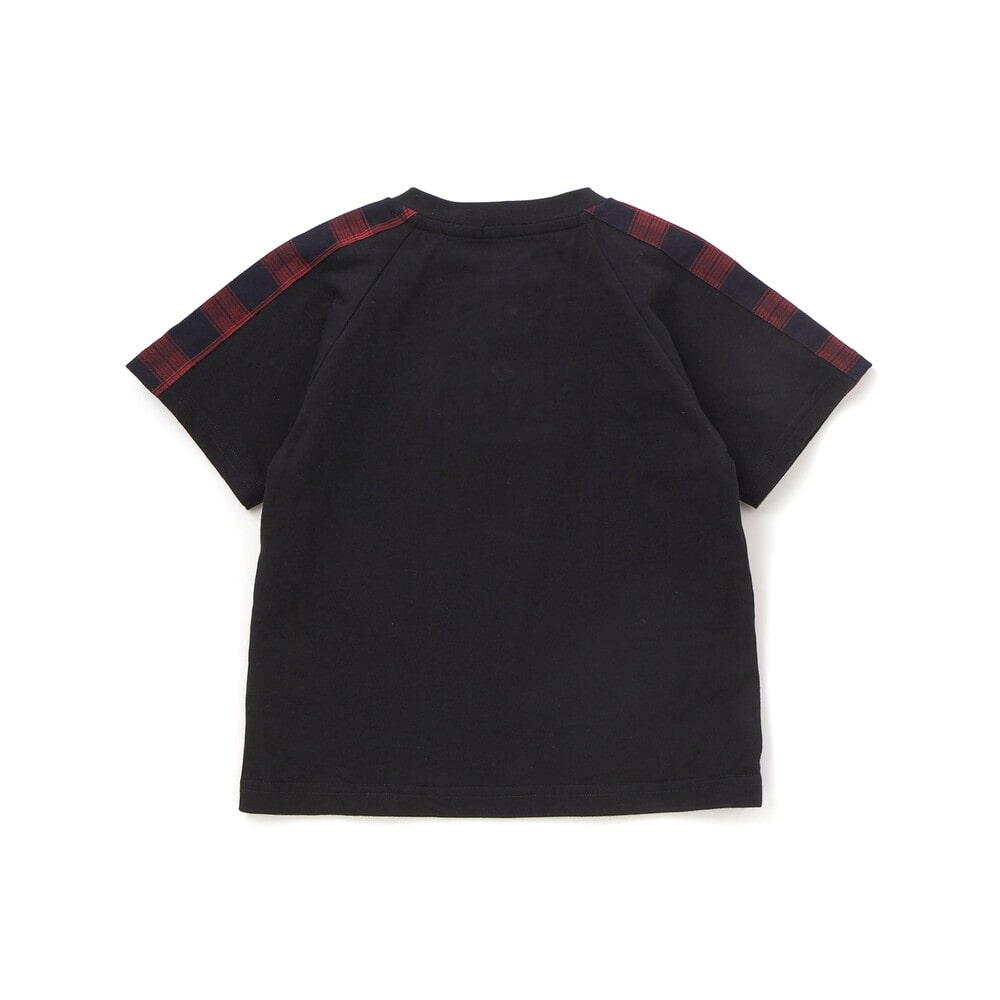 トップスは肩ラインにチェック柄を切り替えた、スポーティーなラグラン風デザイン。