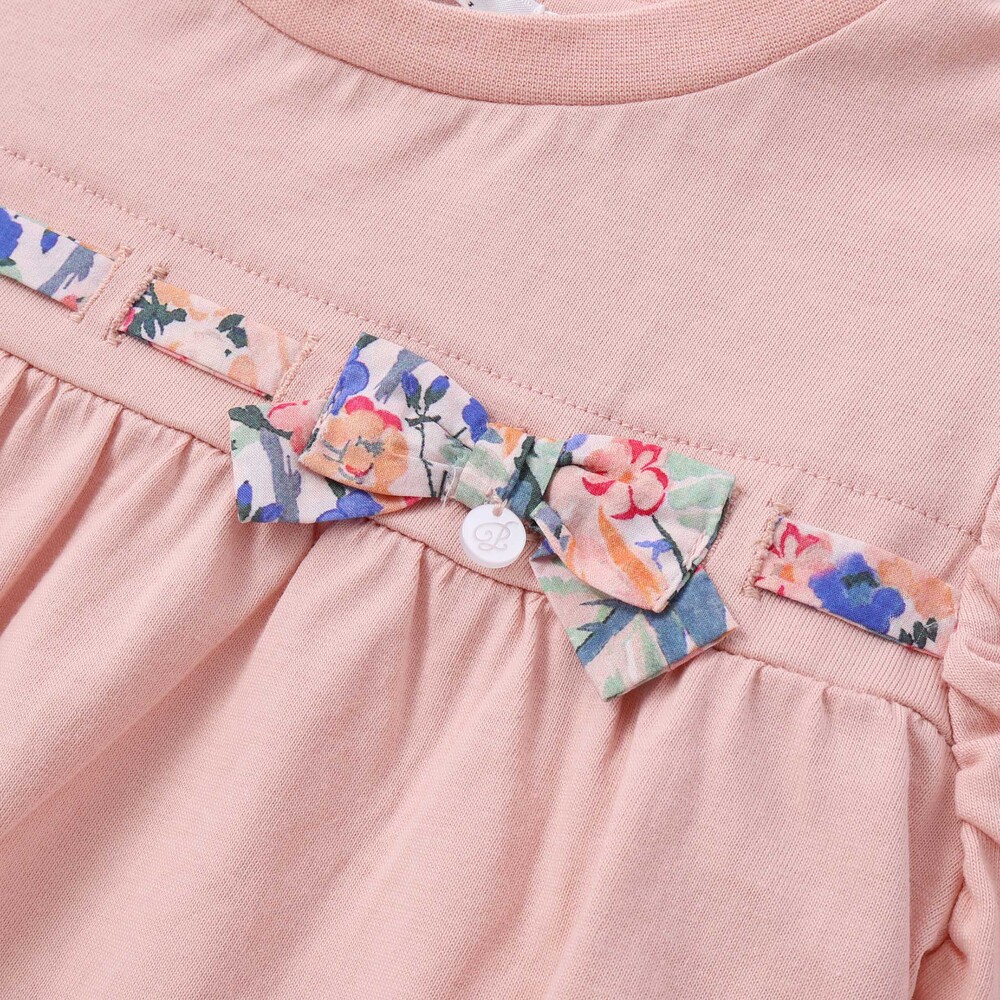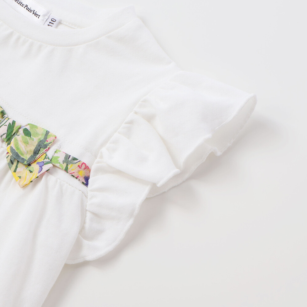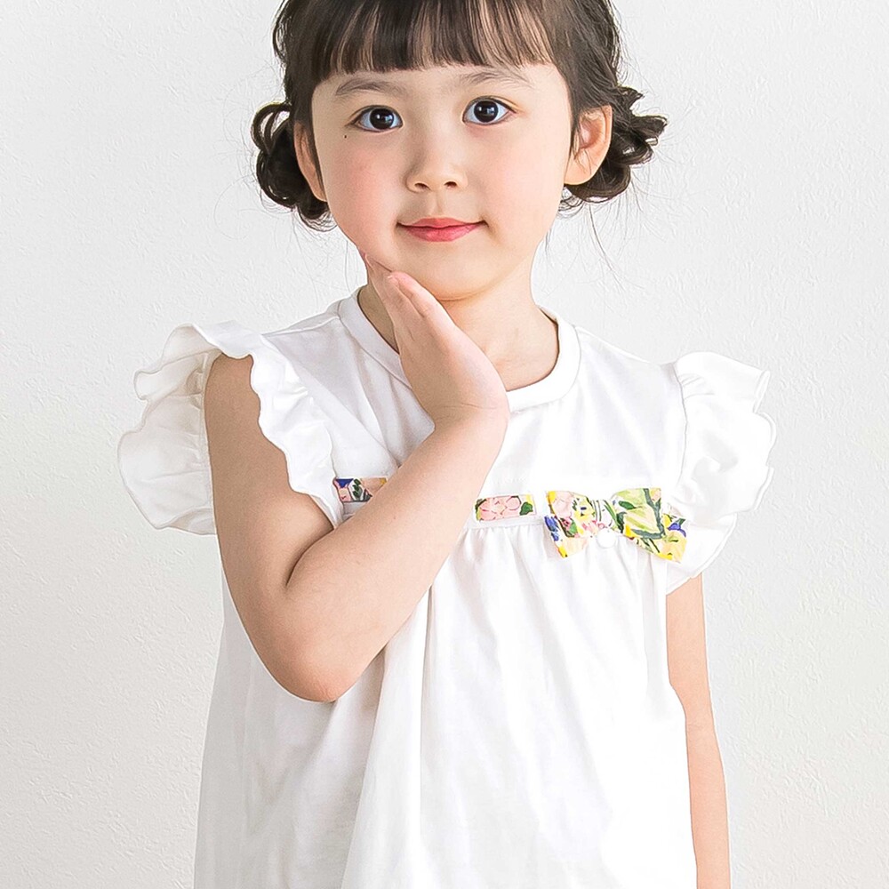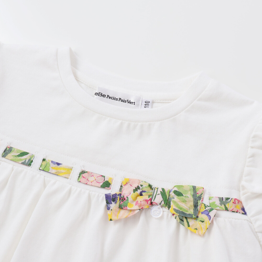 トップスはシンプルな無地に、胸元の花柄リボンがアクセントに。