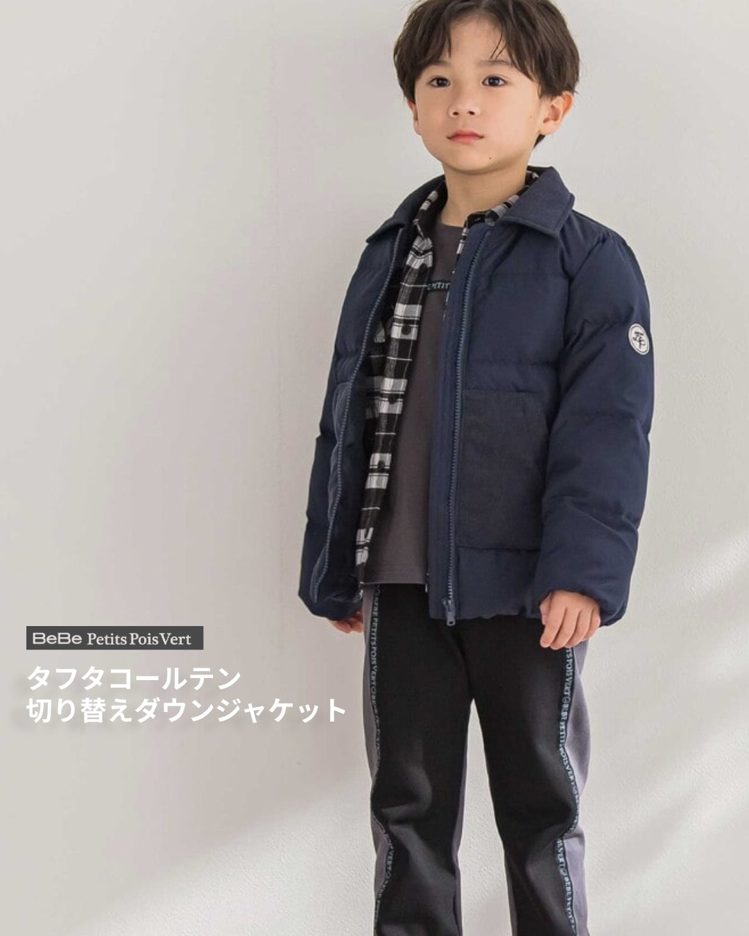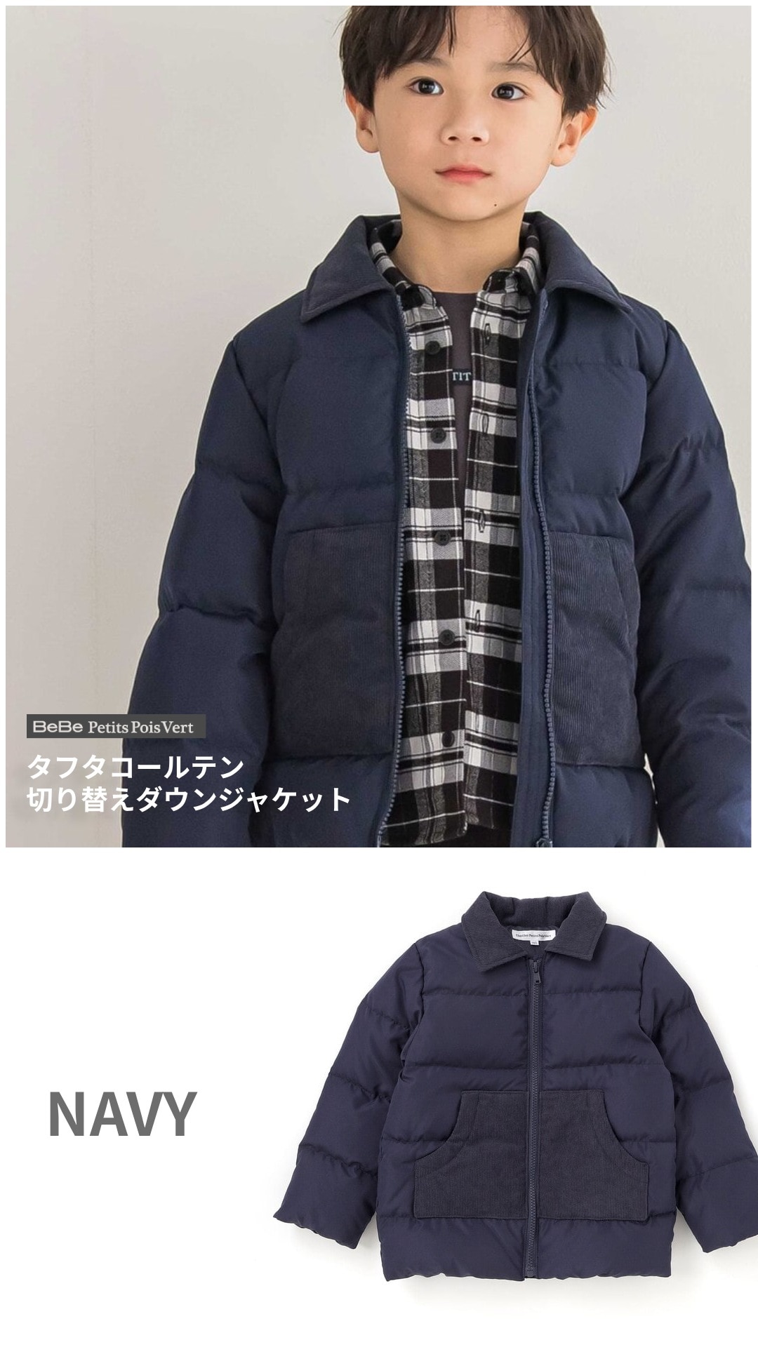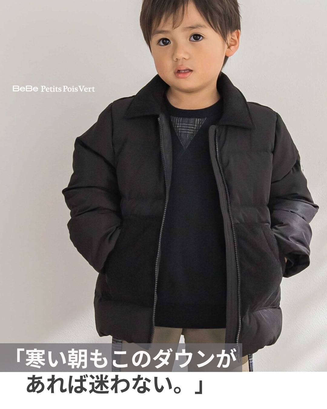 異素材切り替えが映える、あったかダウンの男の子用ジャケット。