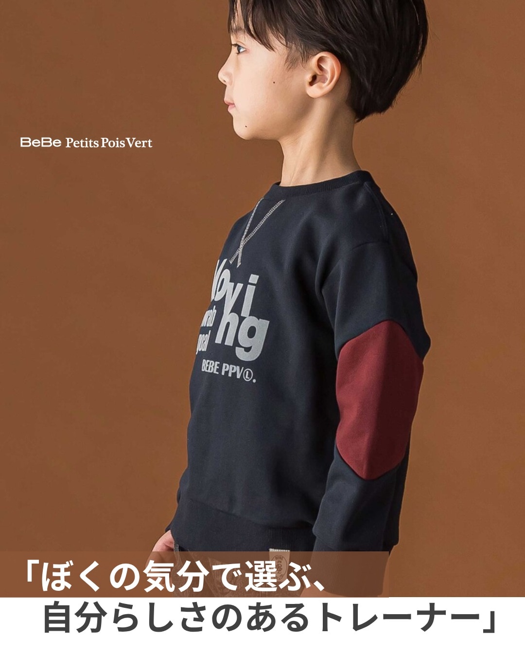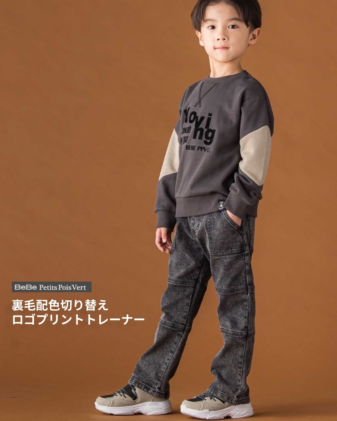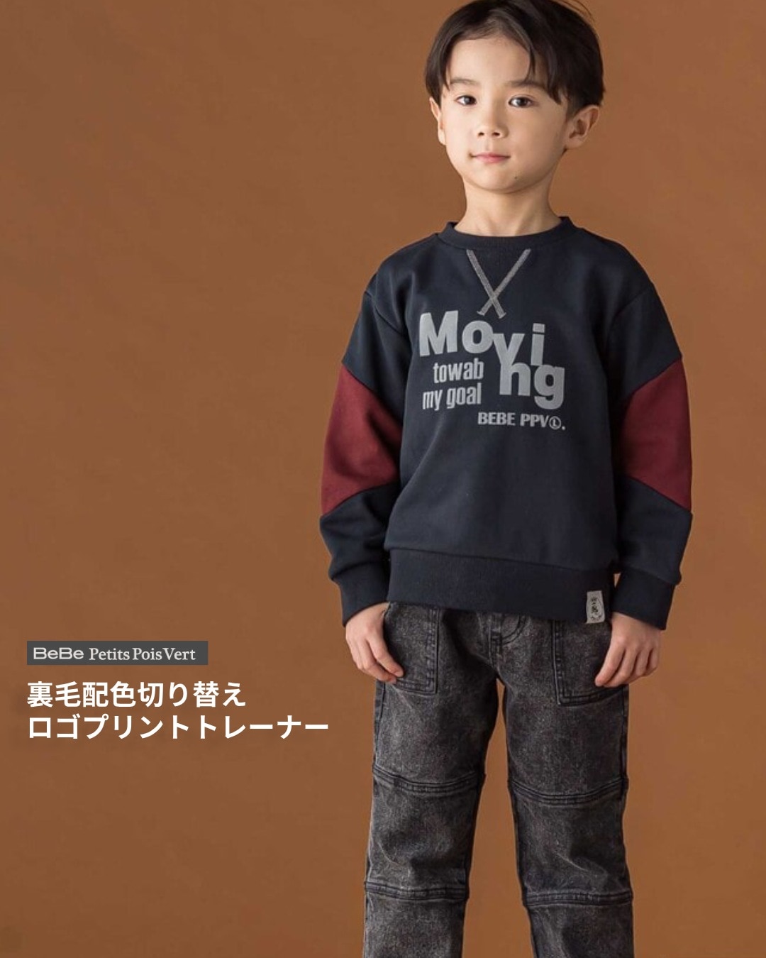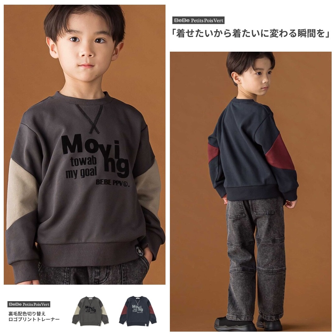 袖の配色とフロッキープリントが映える、男の子用裏毛トレーナー。