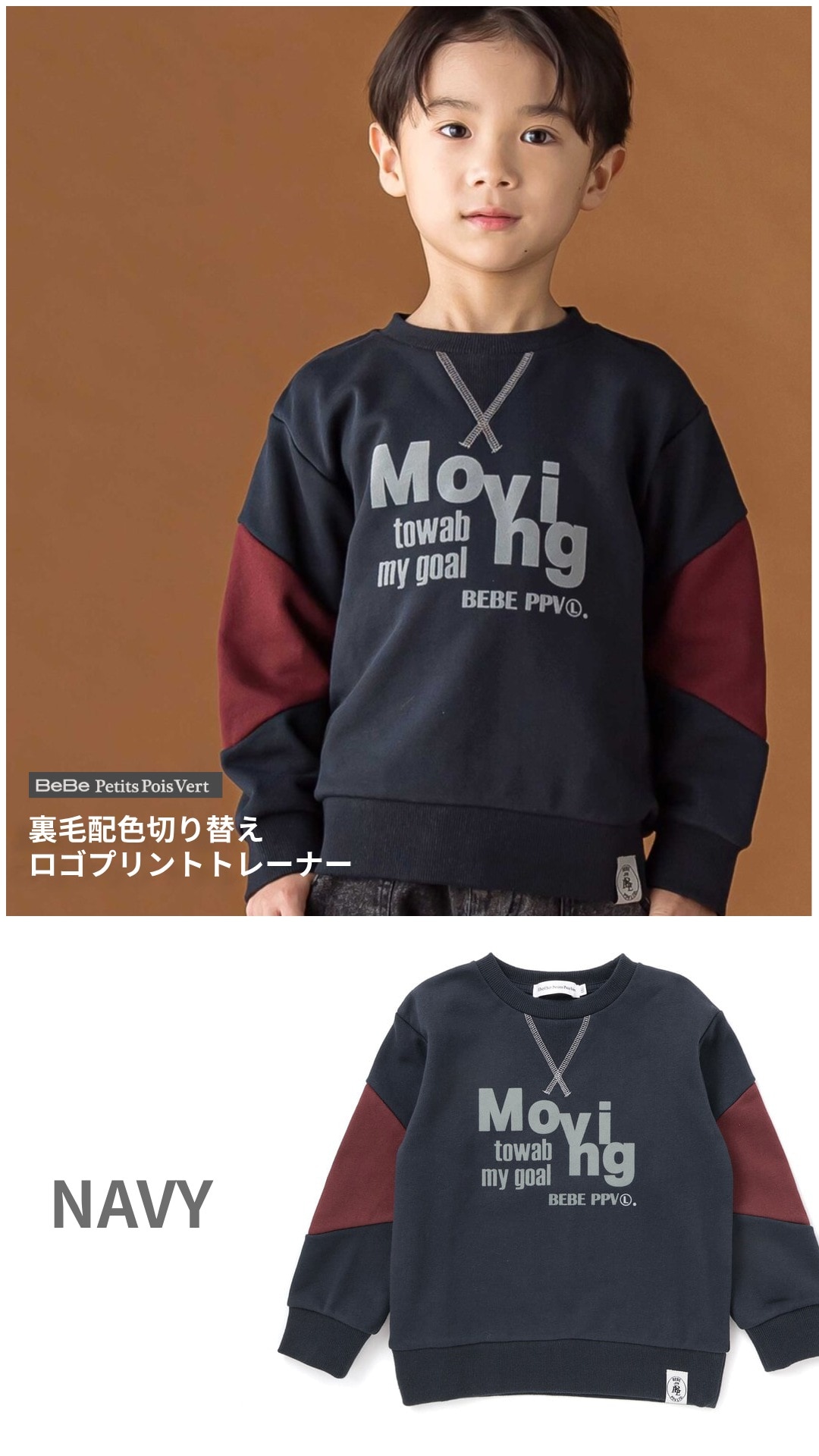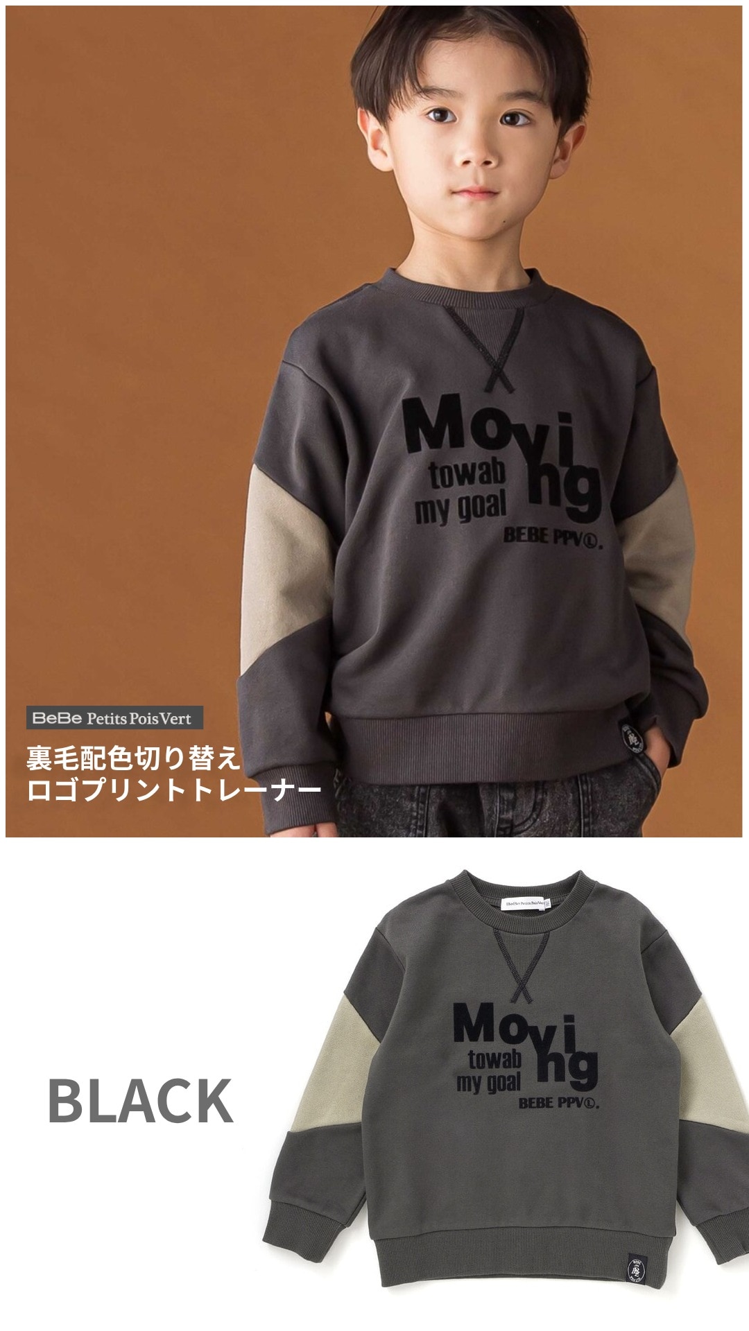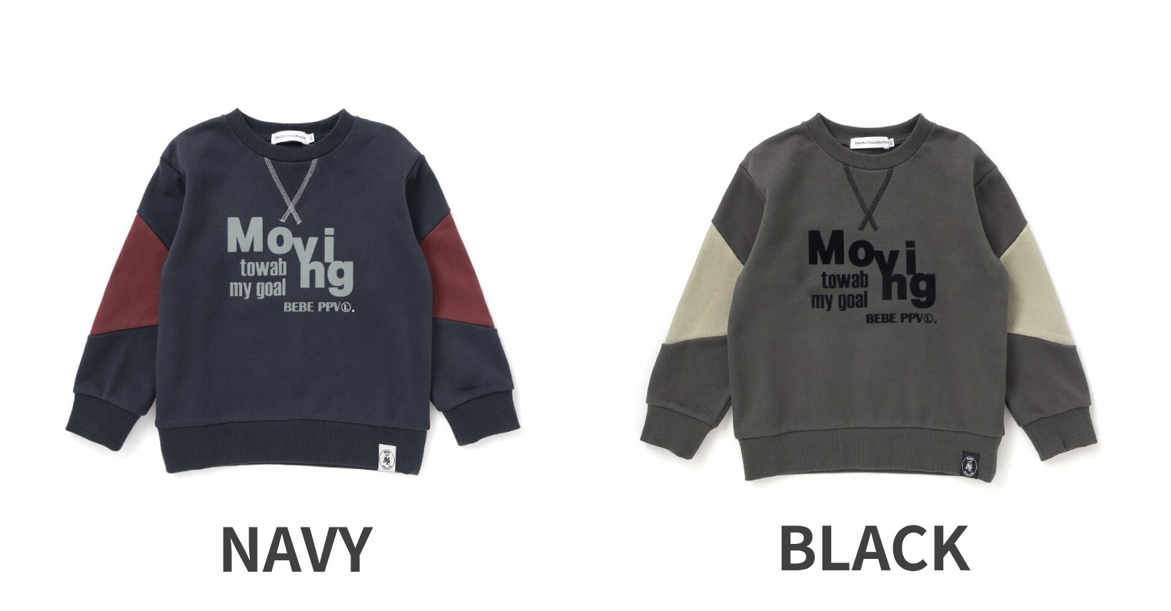 袖の配色とフロッキープリントが映える、男の子用裏毛トレーナー。