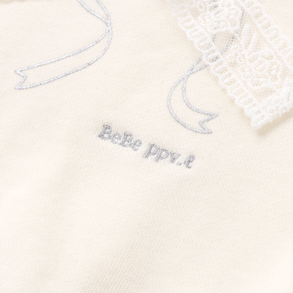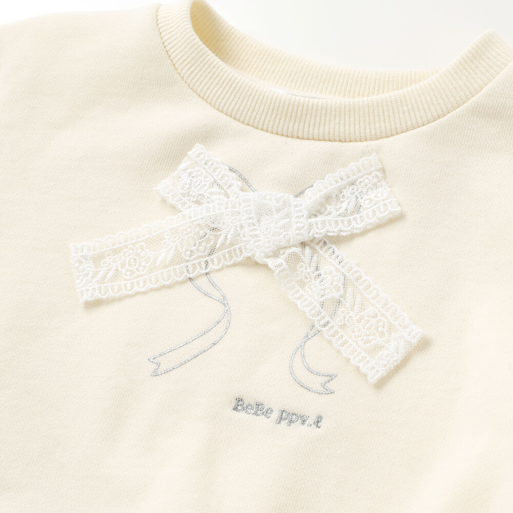 胸元にはリボン刺しゅうの上にレースリボンを重ね、フェミニンなアクセントをプラス。