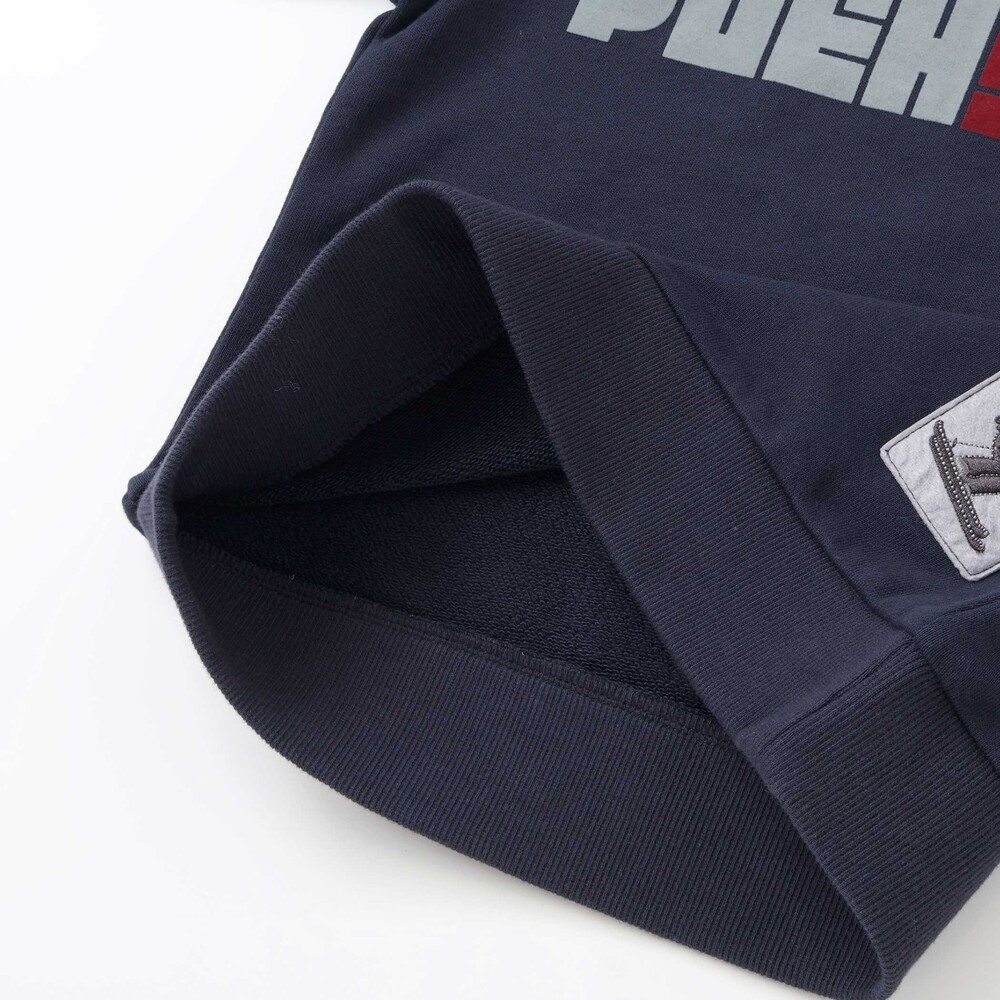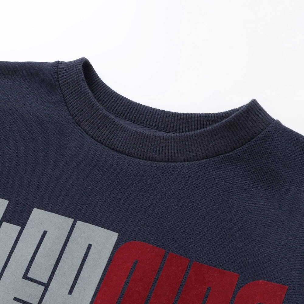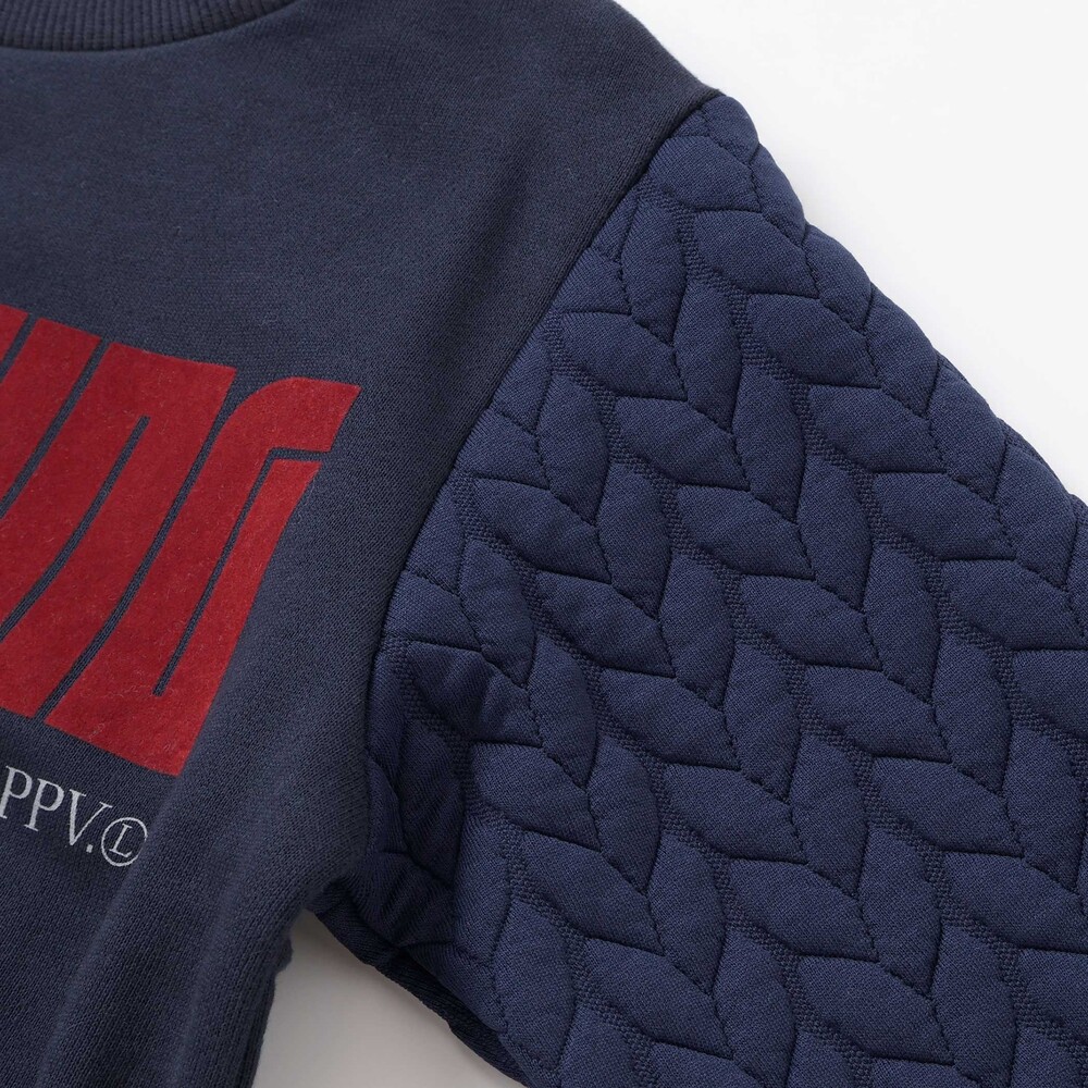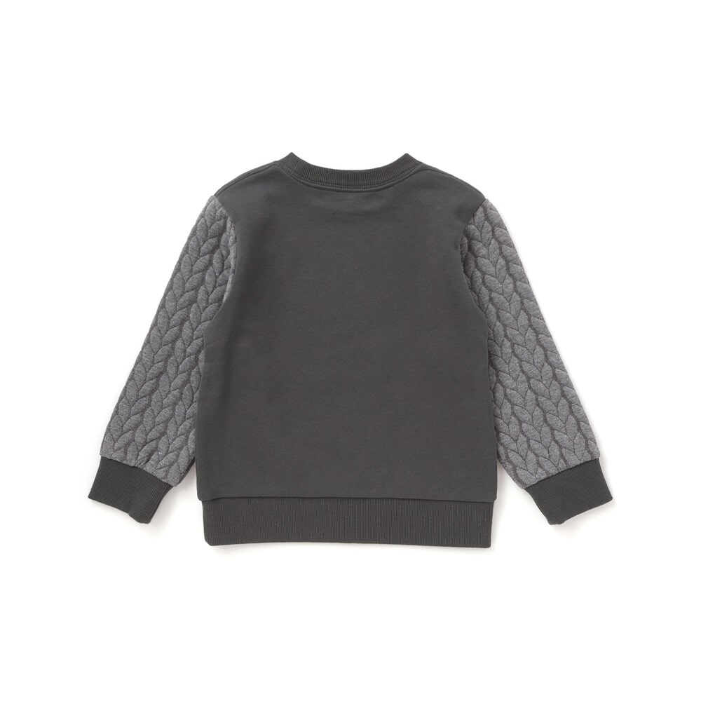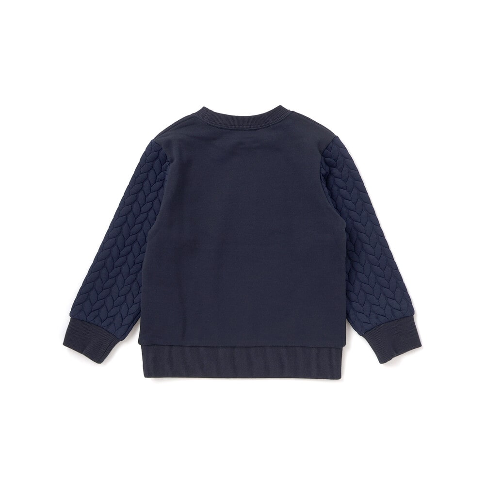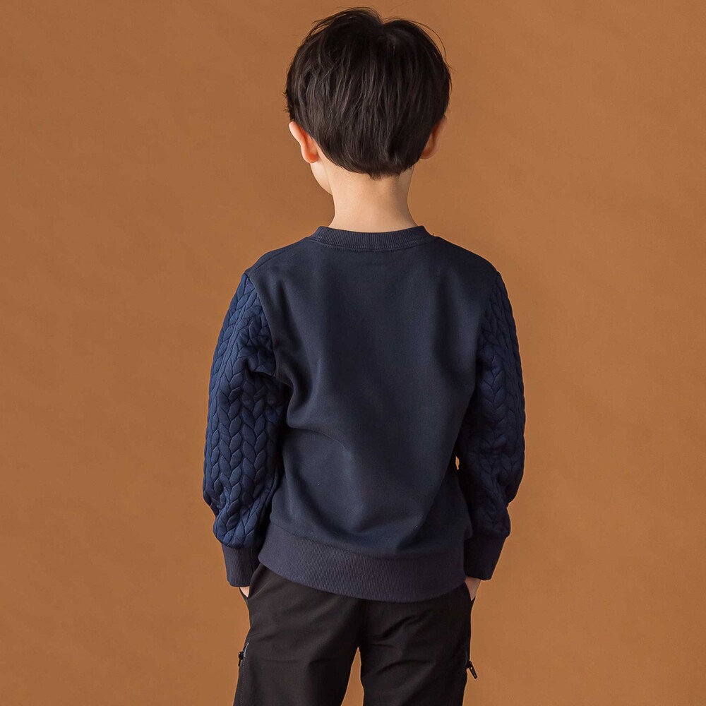 キルトジャガード袖と大胆フロッキープリントが映える男の子用トレーナー。